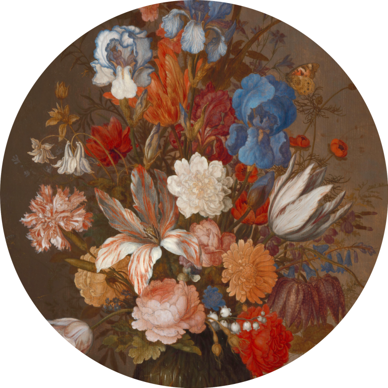 Stilleven met Bloemen is een weelderig bloemstilleven dat de rijkdom en diversiteit van de natuur viert. In een donkere vaas ontplooit zich een explosie van kleur en vorm - blauwe irissen mengen zich met witte lelies, terwijl warme oranje tinten en dieprode accenten voor levendigheid zorgen. De compositie wordt verrijkt door subtiele details zoals schelpen op de voorgrond, die verwijzen naar de vergankelijkheid van schoonheid en de schatten van land en zee. Het meesterlijke gebruik van licht en schaduw geeft elke bloem zijn eigen karakter, van de fluweelzachte textuur van de bloemblaadjes tot de delicate nerven in de bladeren. Dit tijdloze werk belichaamt de Nederlandse stilleventraditie op zijn best - een viering van natuurlijke pracht met symbolische diepgang.