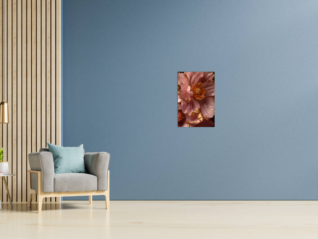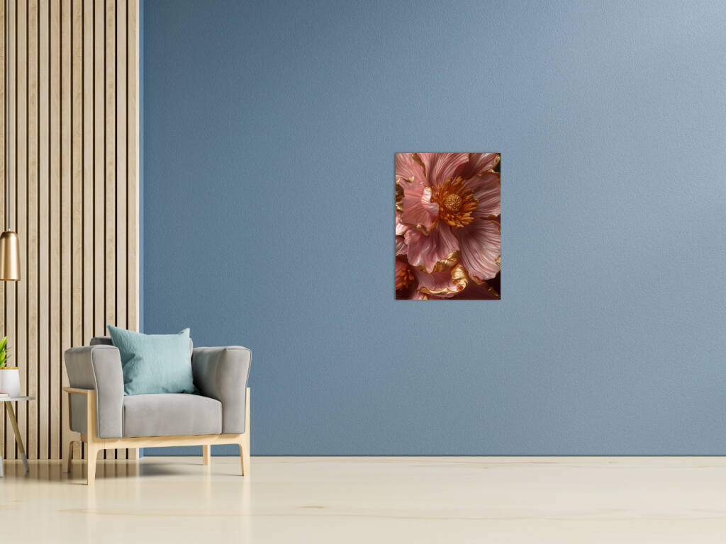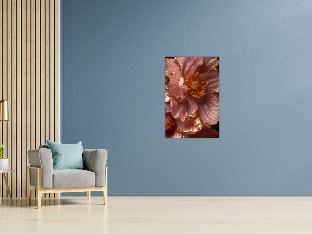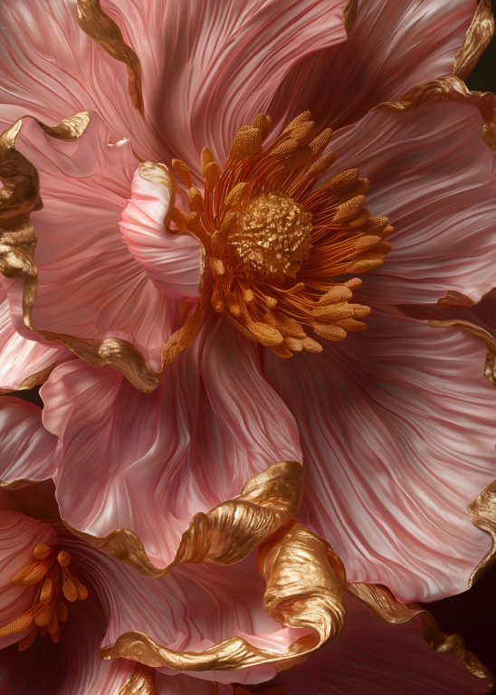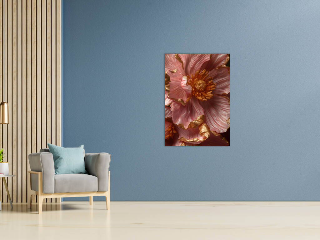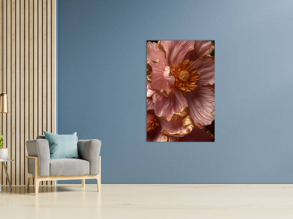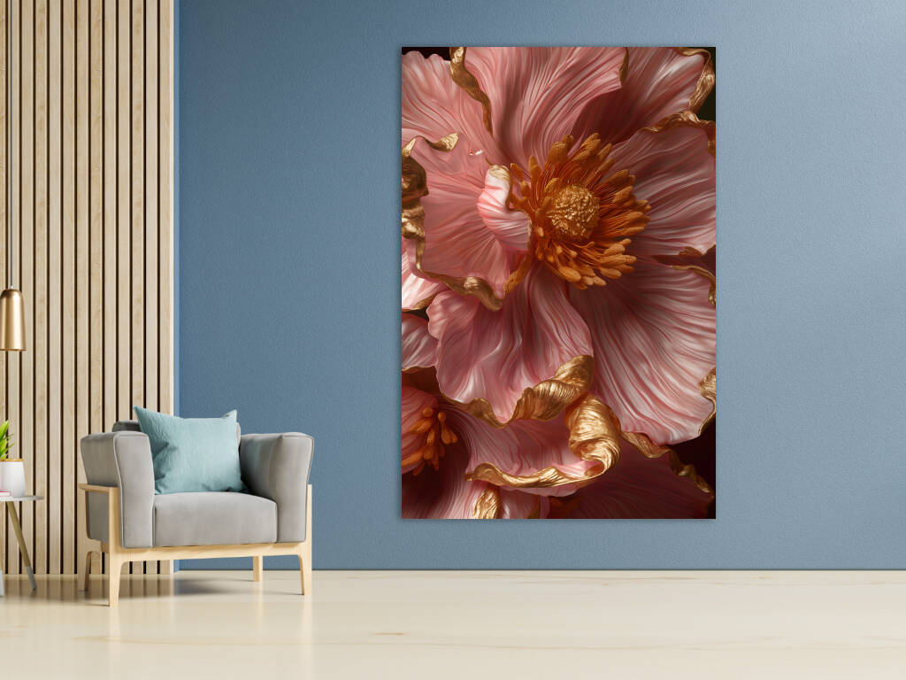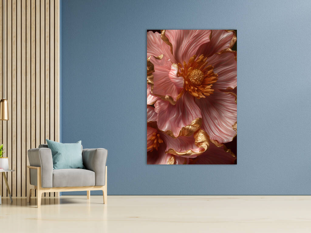 Pinkgold Flower toont een weelderige bloem met elegante, golvende bloemblaadjes in een zachte roze tint, verfijnd met luxueuze gouden randen. De gedetailleerde textuur en subtiele glans geven de compositie een sculpturaal effect, waardoor de bloem een driedimensionale uitstraling krijgt. Het hart van de bloem straalt warmte uit met zijn rijke, goudoranje tinten, wat een harmonieuze balans creëert tussen zachtheid en luxe. Dit kunstwerk ademt elegantie en verfijning, perfect voor een chique en stijlvolle interieursetting.