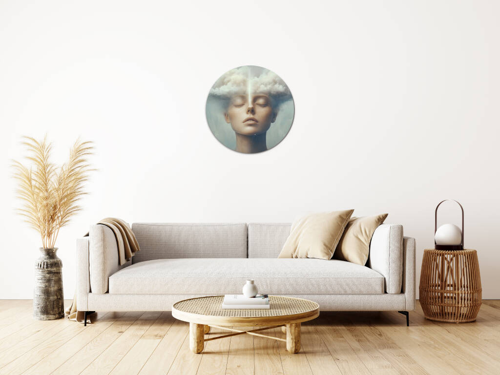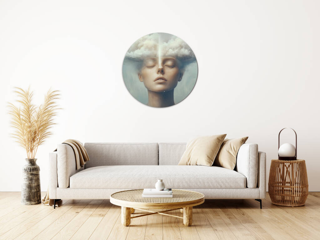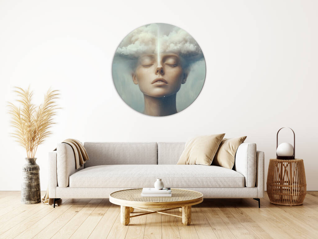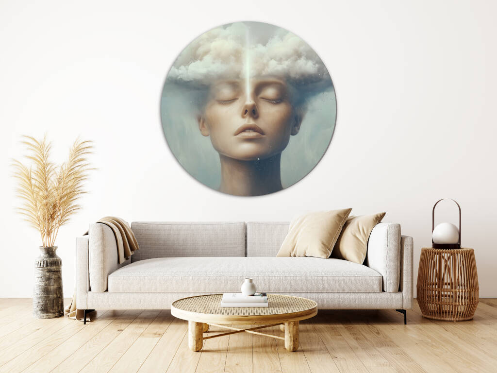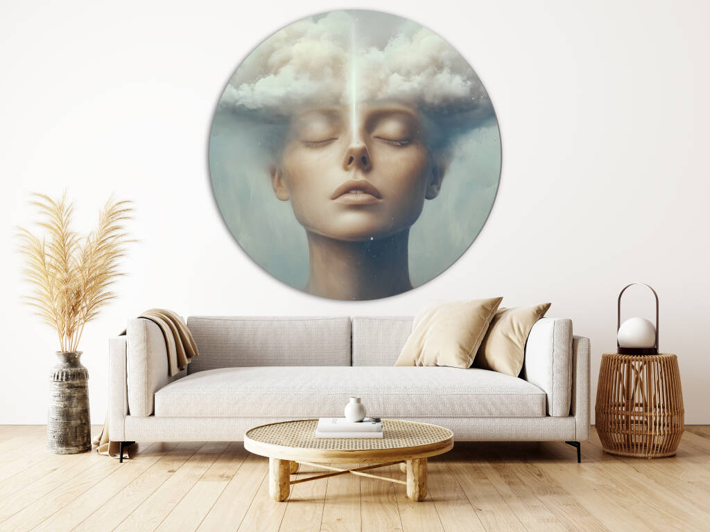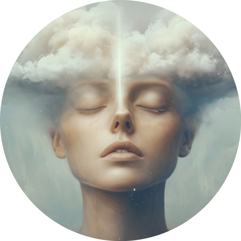 Een surrealistisch beeld van een vrouw wiens hoofd lijkt te versmelten met een wolkenpartij. Haar ogen zijn gesloten, wat een serene of meditatieve uitstraling geeft. Vanuit haar voorhoofd straalt een helder licht omhoog, wat zou kunnen symbool staan voor verlichting, bewustzijn of een diepere spirituele verbinding. De zachte kleuren en de dromerige atmosfeer creëren een gevoel van rust en mysterie.