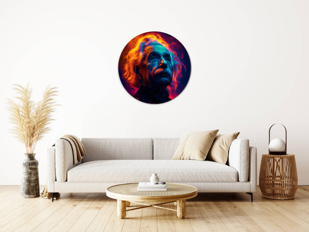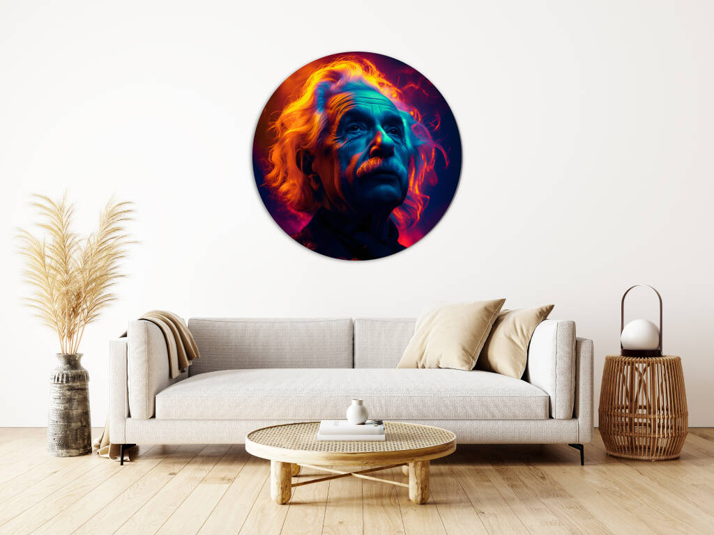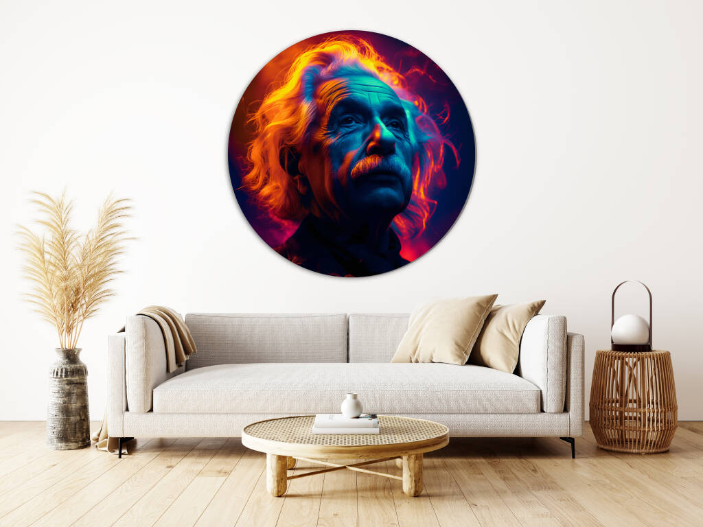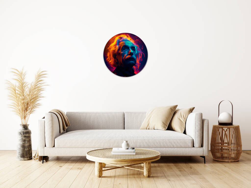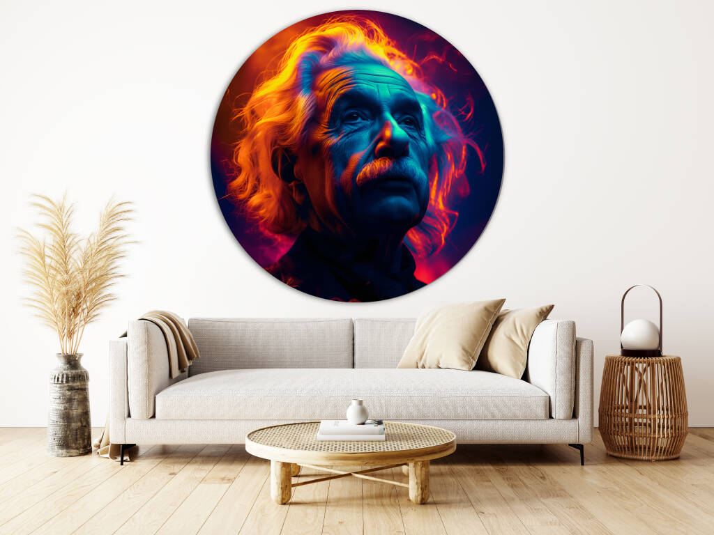 Albert Lightstein is een expressief en modern kunstwerk waarin het iconische beeld van Albert Einstein wordt getransformeerd met een futuristisch kleurenpalet van neonblauw, vurige oranje- en roodgele tinten. De dramatische verlichting en de gloed rondom zijn haar geven hem een bijna mythische uitstraling, alsof hij omringd is door energie en genialiteit. Dit portret combineert realisme met abstracte en cyberpunk-achtige invloeden, waardoor het een krachtig en intrigerend statement maakt over intellect en creativiteit.