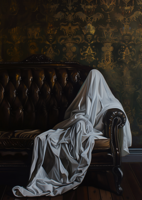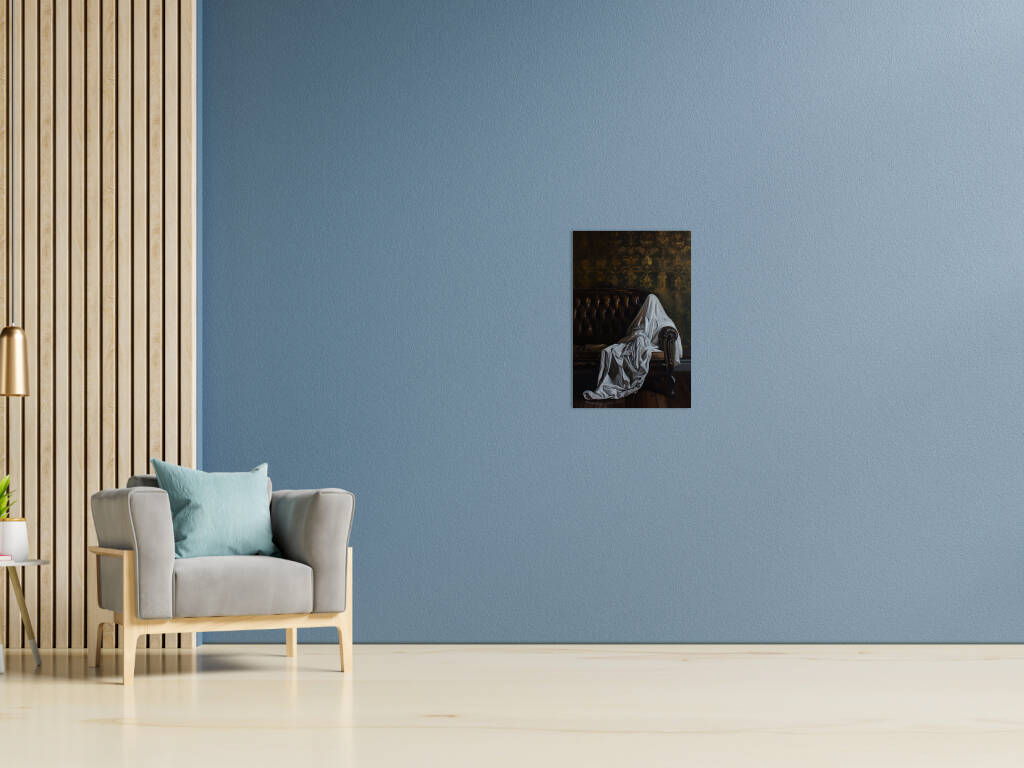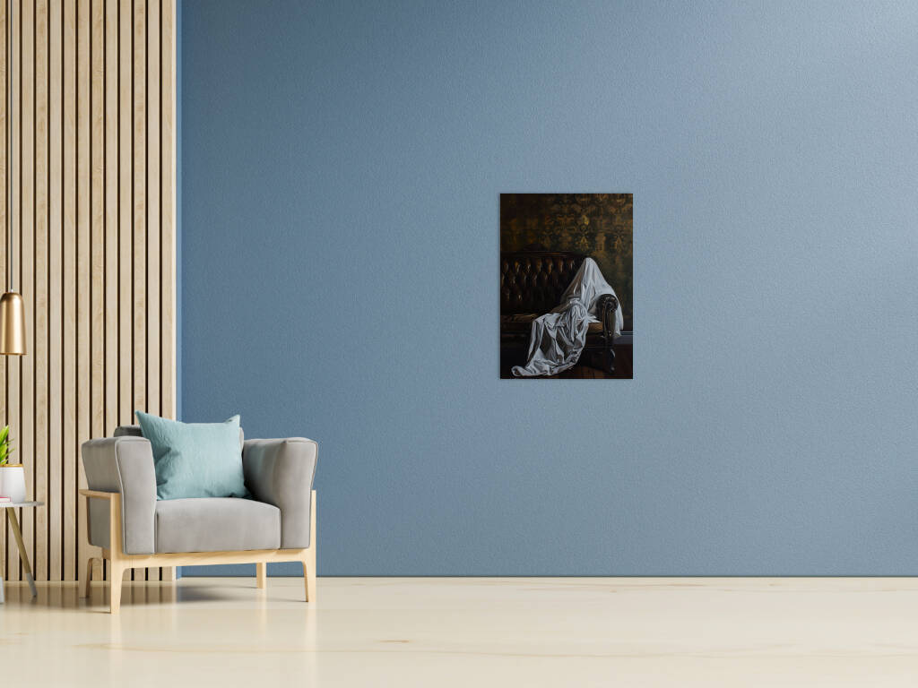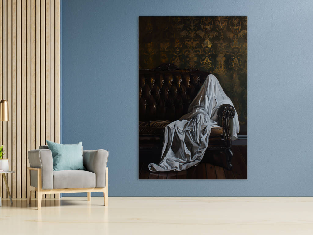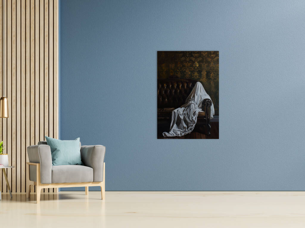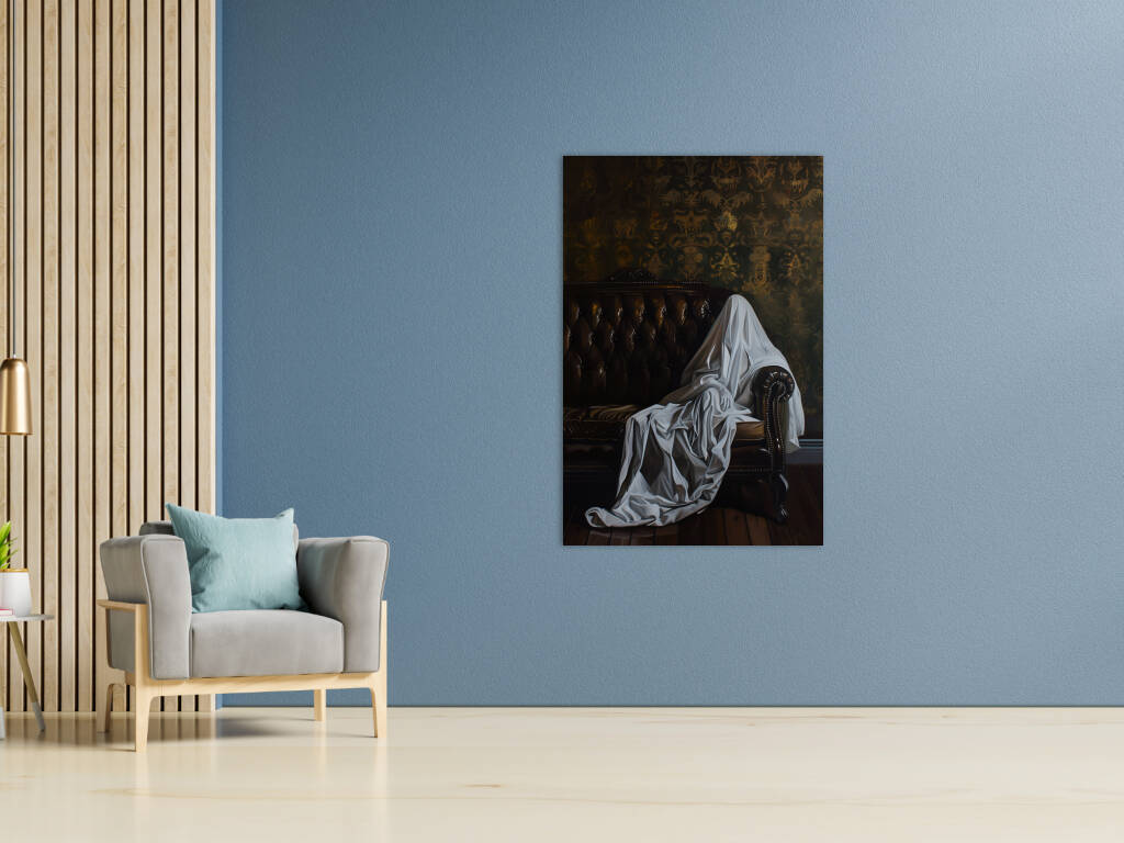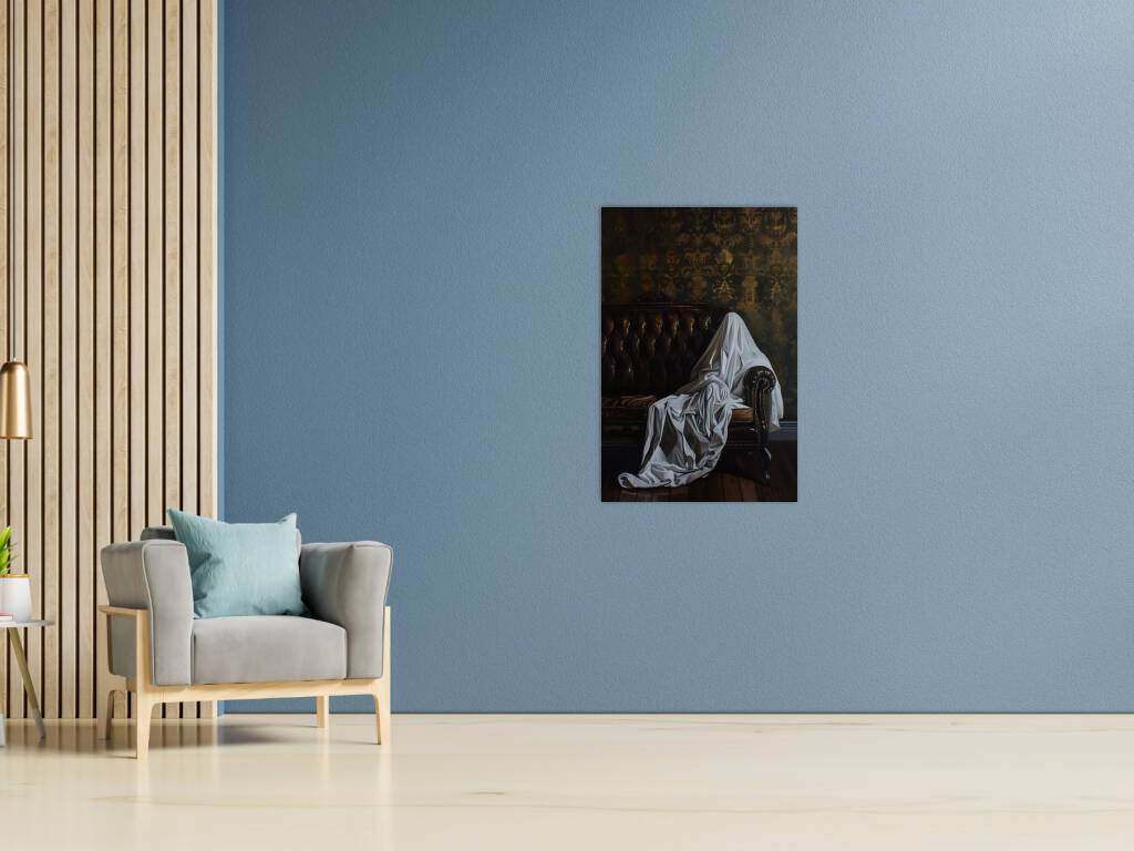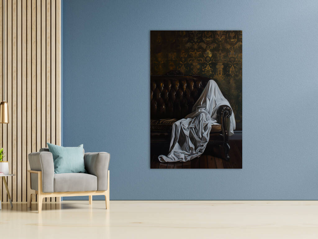 Never Alone presenteert een mysterieuze en intrigerende scène waarin een figuur gehuld in witte stof rust op een klassieke leren chesterfield bank in een statige victorionale kamer. De donkere, rijke achtergrond met zijn ornamentele behang contrasteert dramatisch met de lichte, etherische verschijning van de figuur. De sfeer roept vragen op over identiteit, eenzaamheid en aanwezigheid, terwijl de elegante inrichting een tijdloos gevoel van mystiek uitstraalt. Dit thought-provoking kunstwerk nodigt uit tot contemplatie en brengt een element van artistiek mysterie in je interieur.