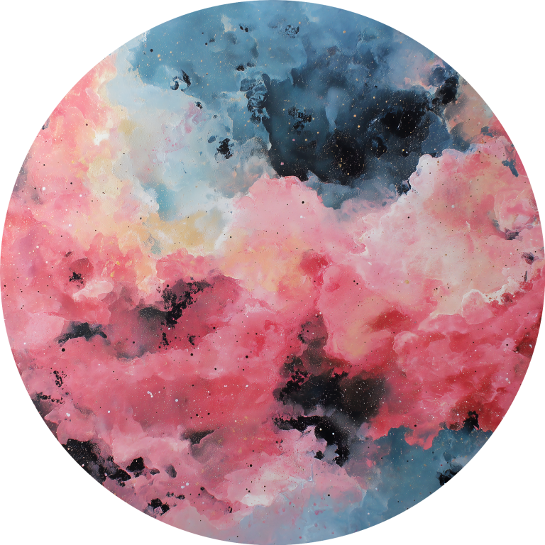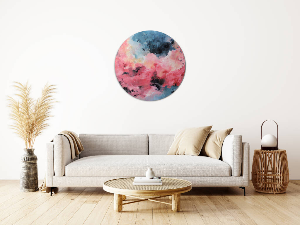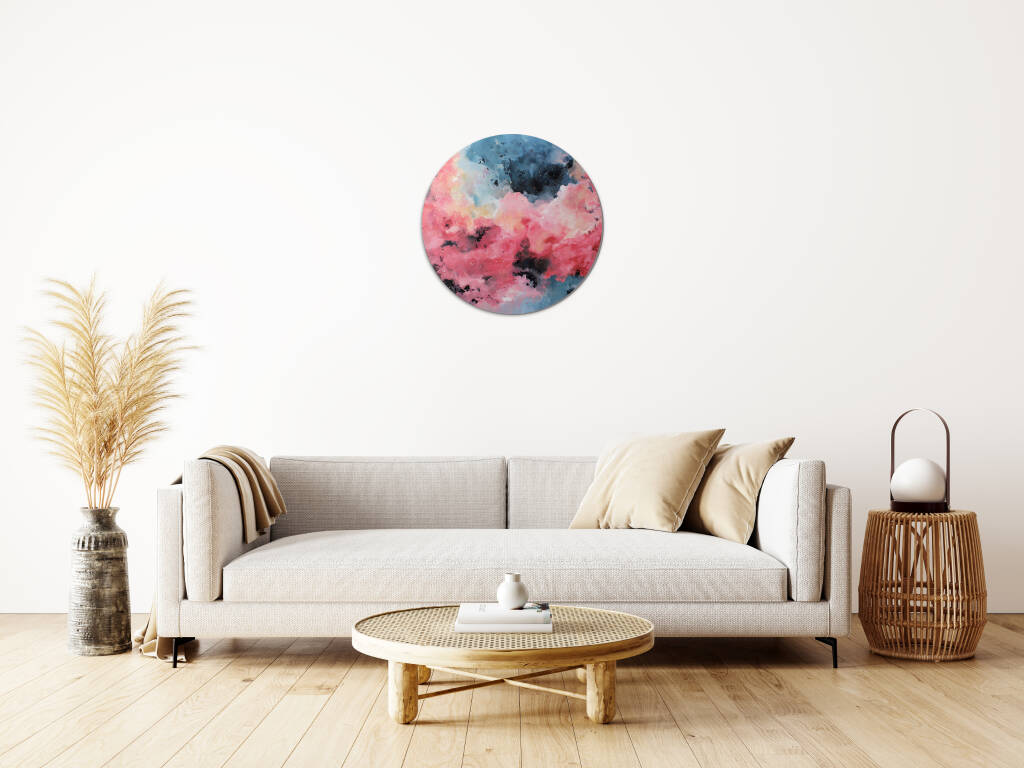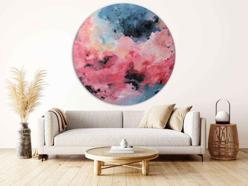 Cloud Collision toont een hemelse dans waar zachte roze en blauwe wolken botsen in een explosie van aquarel schoonheid. Zwarte fragmenten zweven als confetti door de lucht, wat een contrast vormt met de zachte pastelkleuren. Dit dromerige kunstwerk vangt het moment waarop storm en sereniteit elkaar ontmoeten, waarbij chaos transformeert tot schoonheid. Een poëtisch statement voor romantische zielen die houden van abstracte natuurinterpretaties.