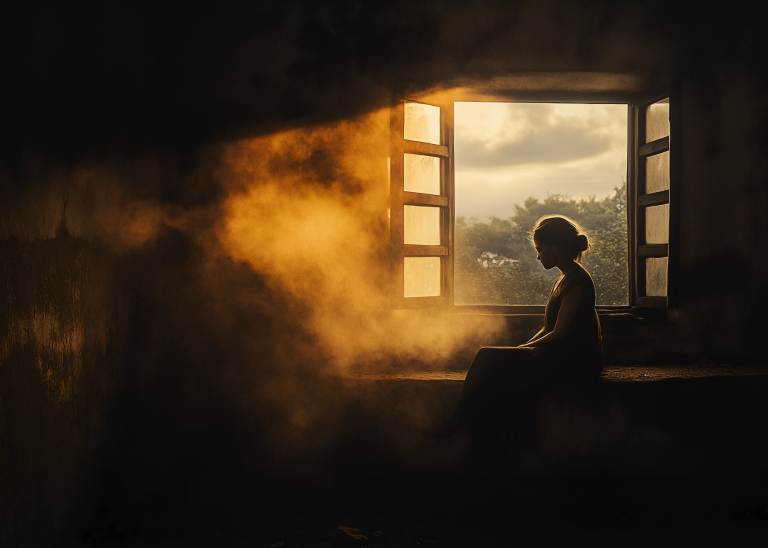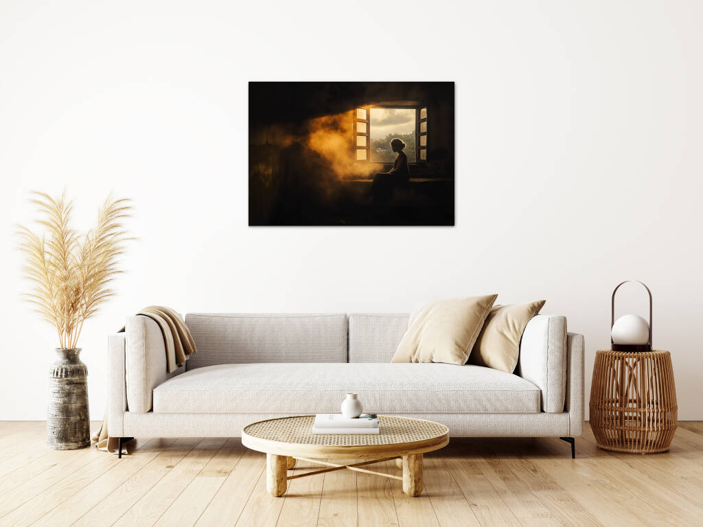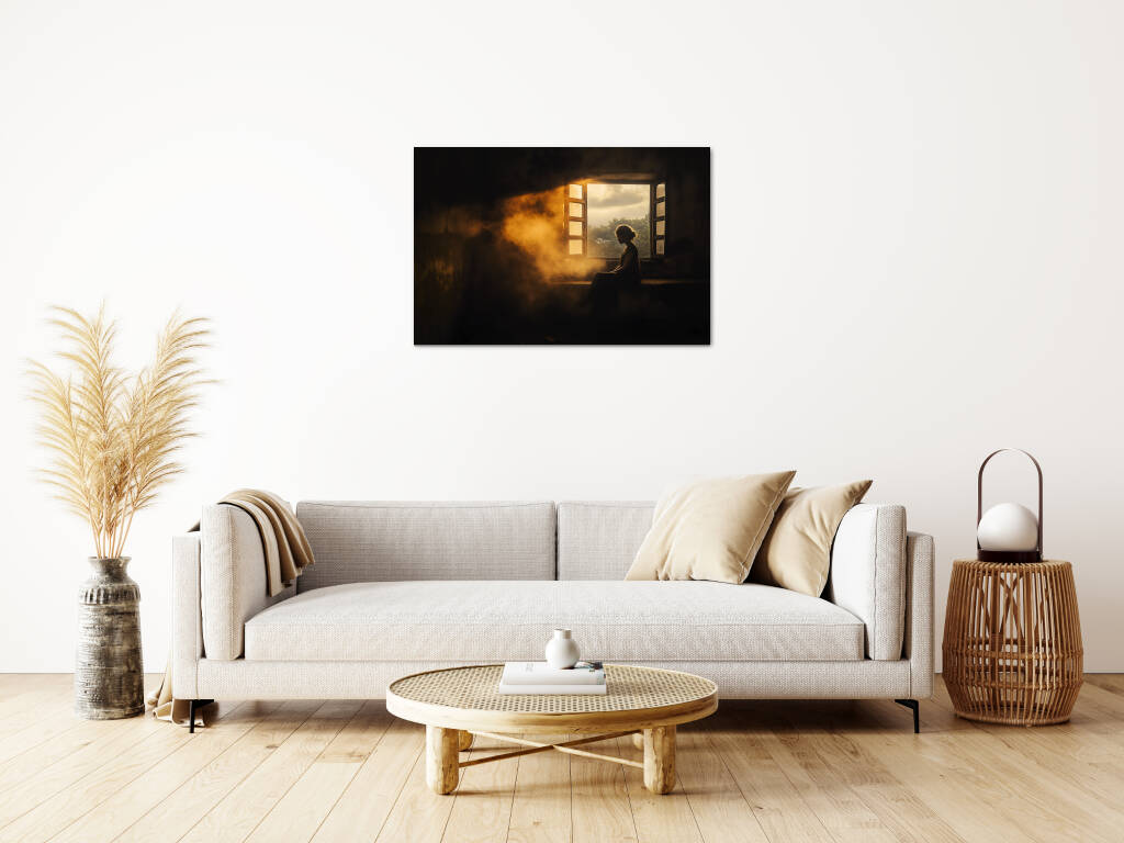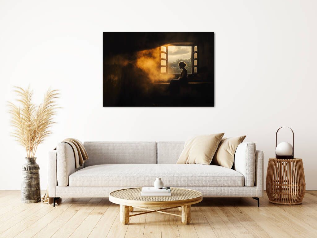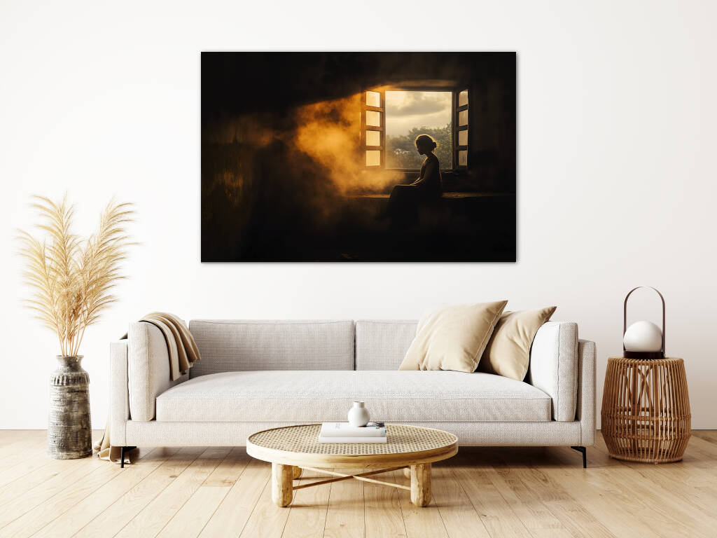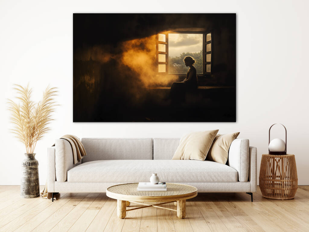 Early Rise vangt het magische moment van de vroege ochtend waarbij zonnestralen door een open raam naar binnen stromen en een vrouw in silhouet hullen. Het warme, gouden licht creëert een atmosferische nevel die de hele scène in een dromerige gloed zet, terwijl de rustige houding van de figuur een gevoel van vredelievende contemplatie uitstraalt. De contrasten tussen licht en schaduw, tussen binnen en buiten, vertellen een verhaal van nieuwe mogelijkheden. Dit intiems kunstwerk brengt de rust van de vroege morgen direct in je interieur.