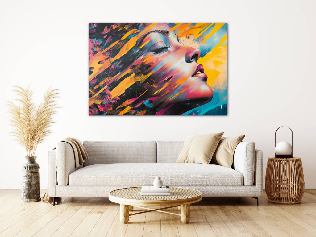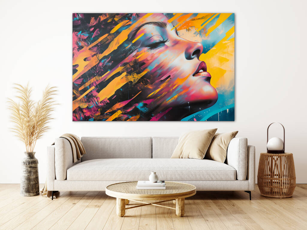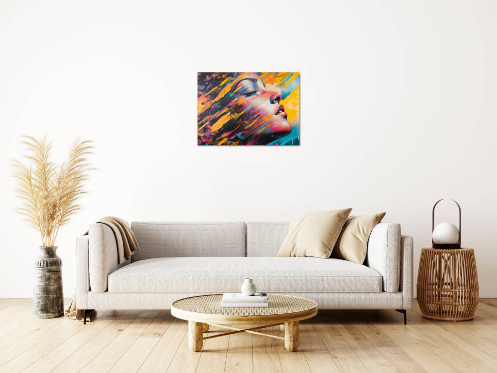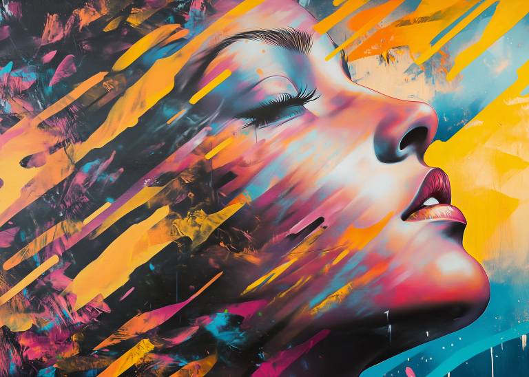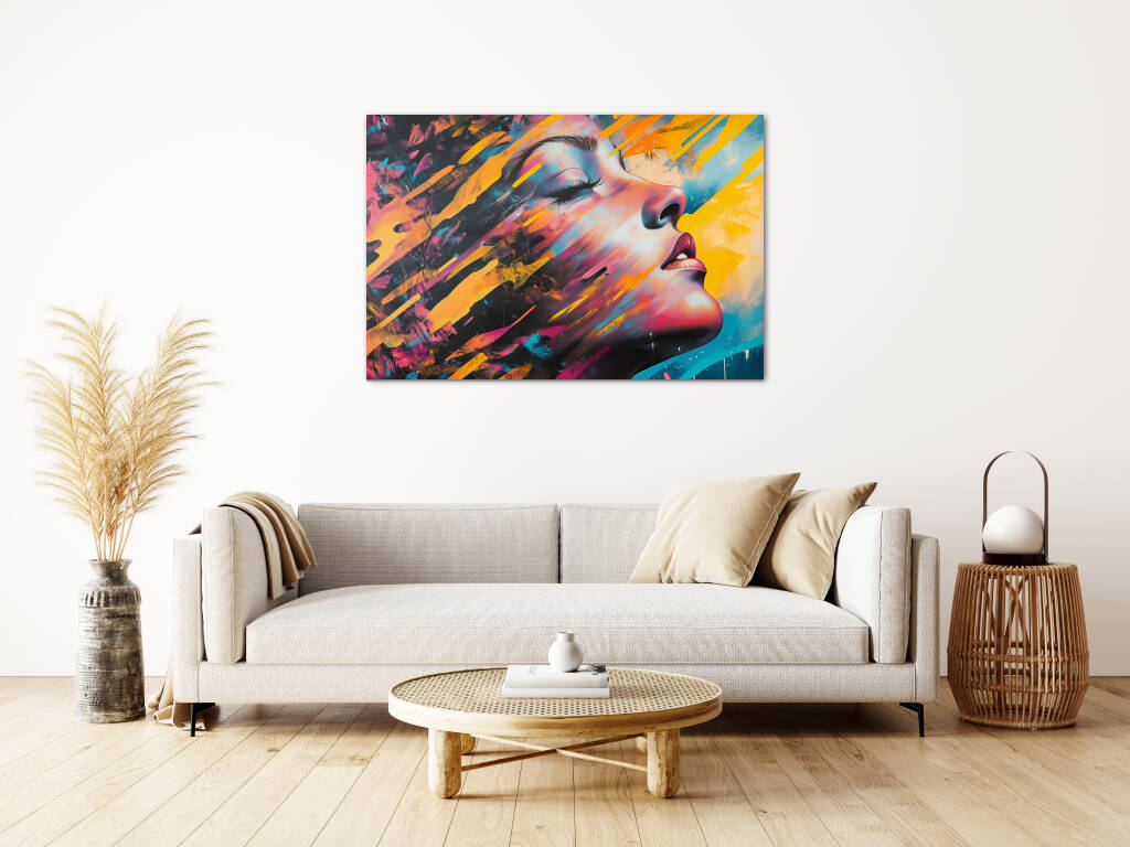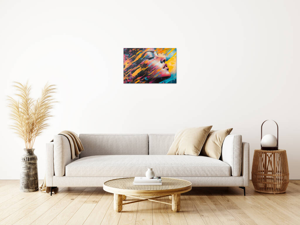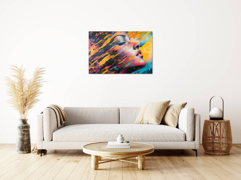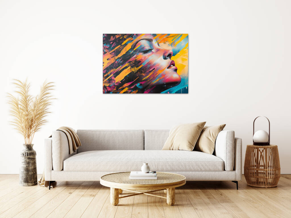 Feeling Colours toont een expressief vrouwenportret dat overspoeld wordt door een explosie van levendige verfstreken in geel, oranje, blauw en roze. Het gezicht lijkt te smelten met de kleuren, waarbij emoties letterlijk zichtbaar worden door de dynamische penseelvoering en de krachtige kleurcontrasten. De abstracte elementen die over het realistische portret heen dansen creƫren een gevoel van innerlijke turbulentie en creativiteit. Dit emotionele kunstwerk brengt de kracht van kleur als uitdrukkingsmiddel prachtig tot uiting.