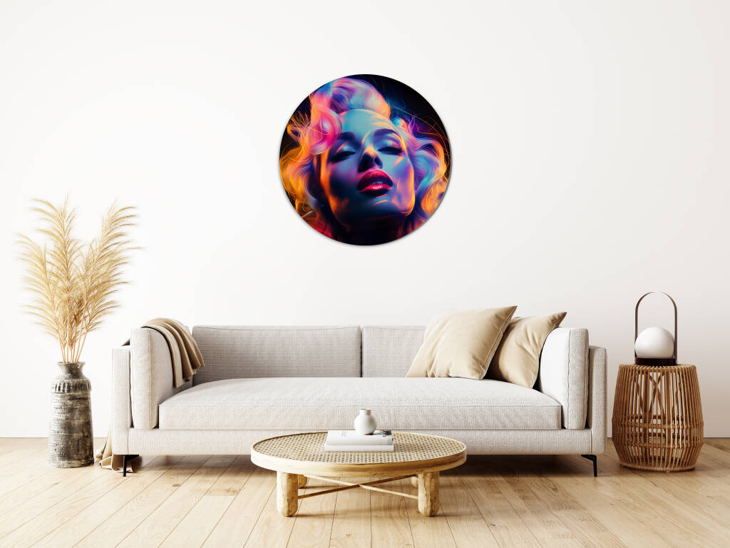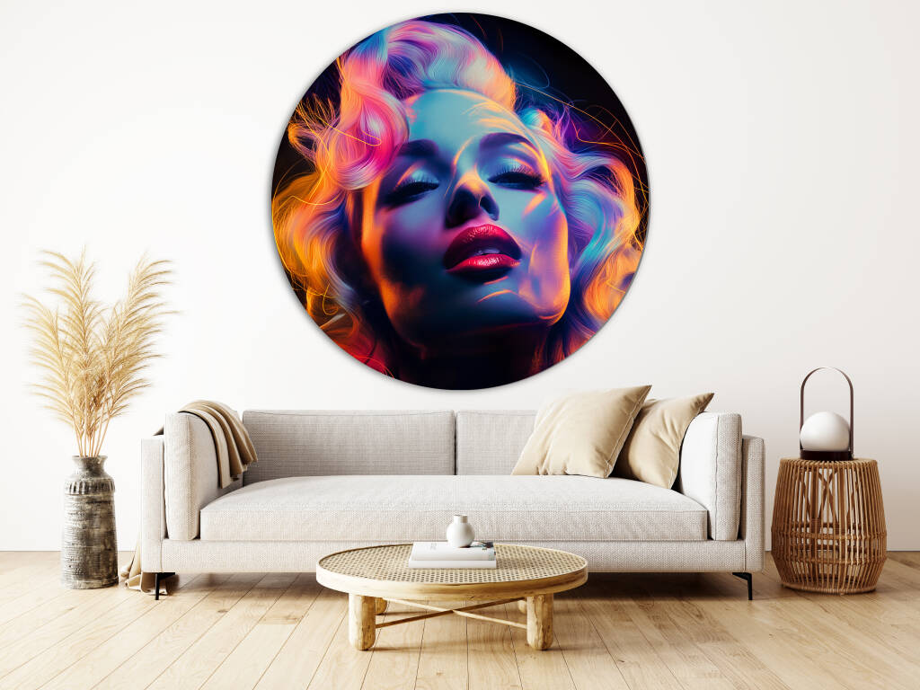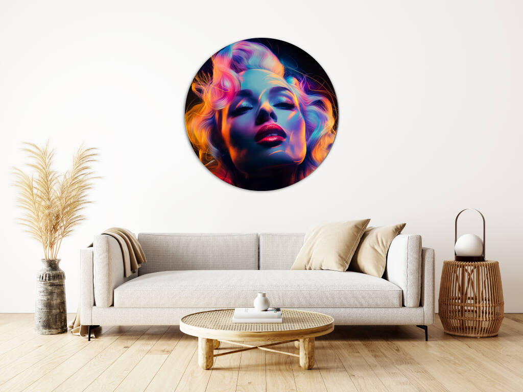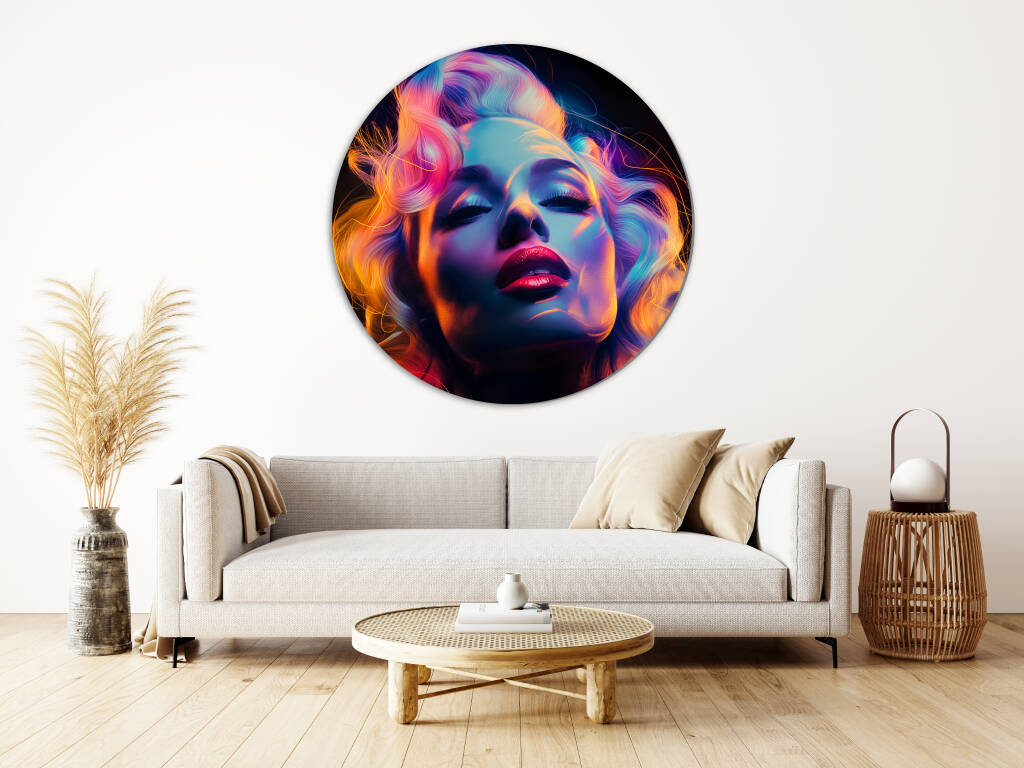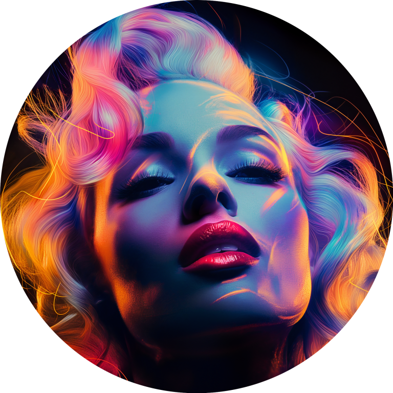 Marilyn Mondisco is een betoverend portret dat de glamour van Marilyn Monroe combineert met de neon-energie van een discotijdperk. Haar iconische uitstraling wordt versterkt door een gedurfde belichting in tinten van roze, paars, blauw en goud, wat een futuristische gloed geeft aan haar gezicht en golvende blonde haren. De dramatische schaduwen en hooglichten creëren een speelse, sensuele sfeer, terwijl haar gesloten ogen en licht gekantelde hoofd een dromerige, euforische expressie suggereren. Dit kunstwerk vangt de essentie van tijdloze schoonheid en popcultuur, maar met een moderne, energieke twist.