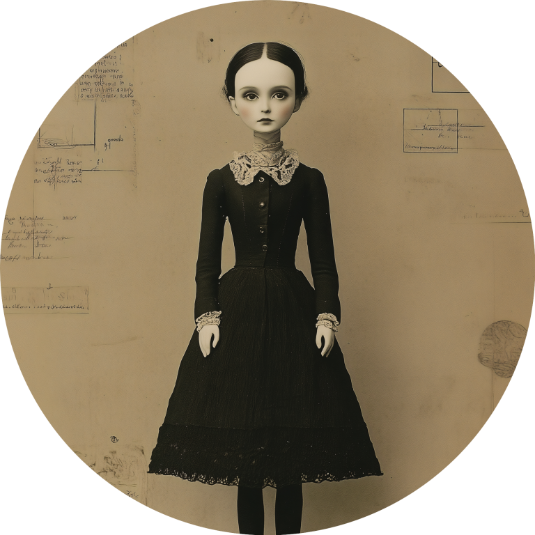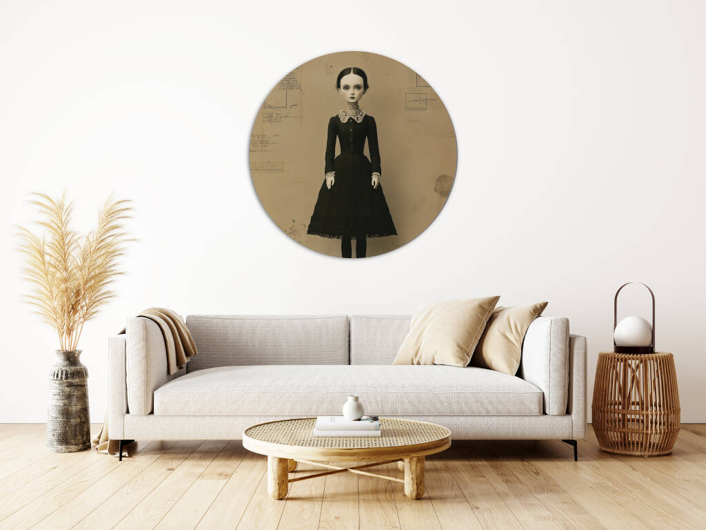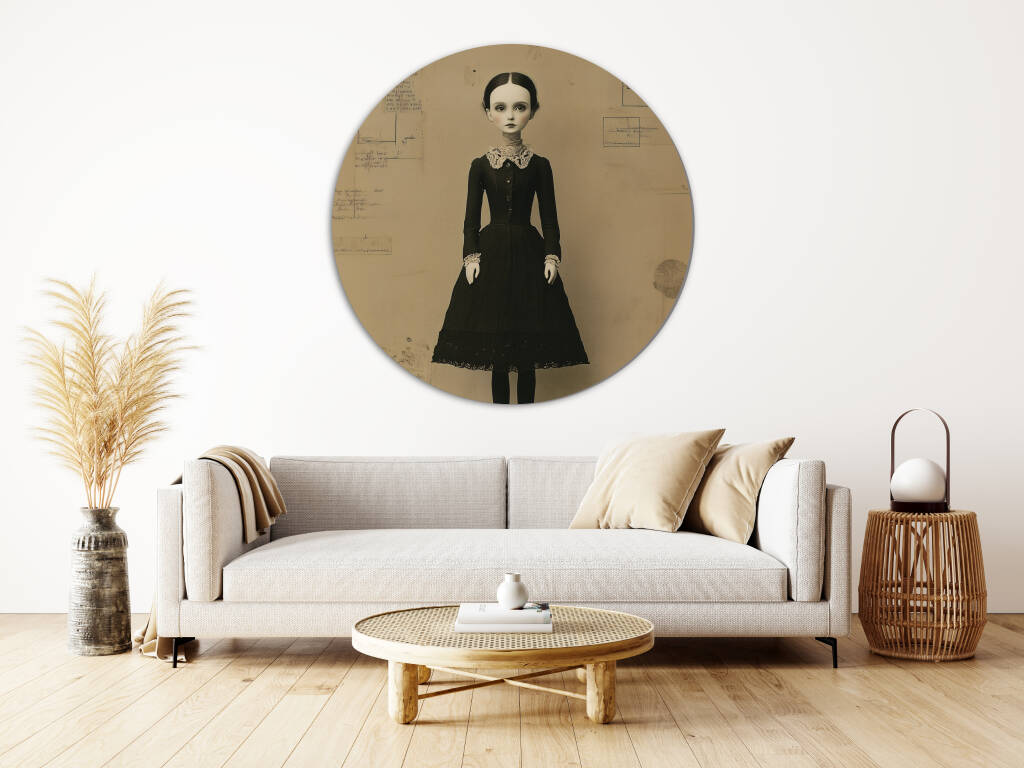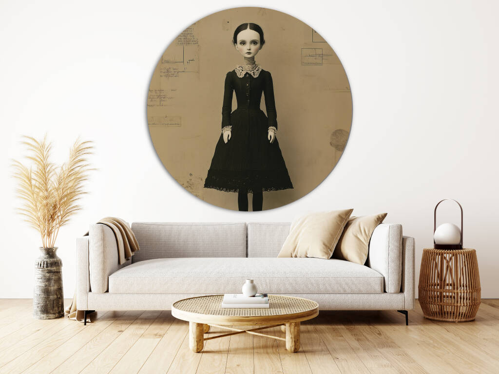 Black Dress Doll, toont een surrealistische pop met een vintage uitstraling. Ze draagt een zwart, Victoriaans geïnspireerd jurkje met kanten details en staat op een houten platform tegen een achtergrond vol schetsen en aantekeningen. De sepia-tinten en de bijna levensechte uitstraling van de pop geven het werk een mysterieuze en nostalgische sfeer. De minimalistische maar gedetailleerde compositie straalt een gevoel van melancholie en tijdloosheid uit, perfect passend bij een klassiek of gotisch geïnspireerd interieur.