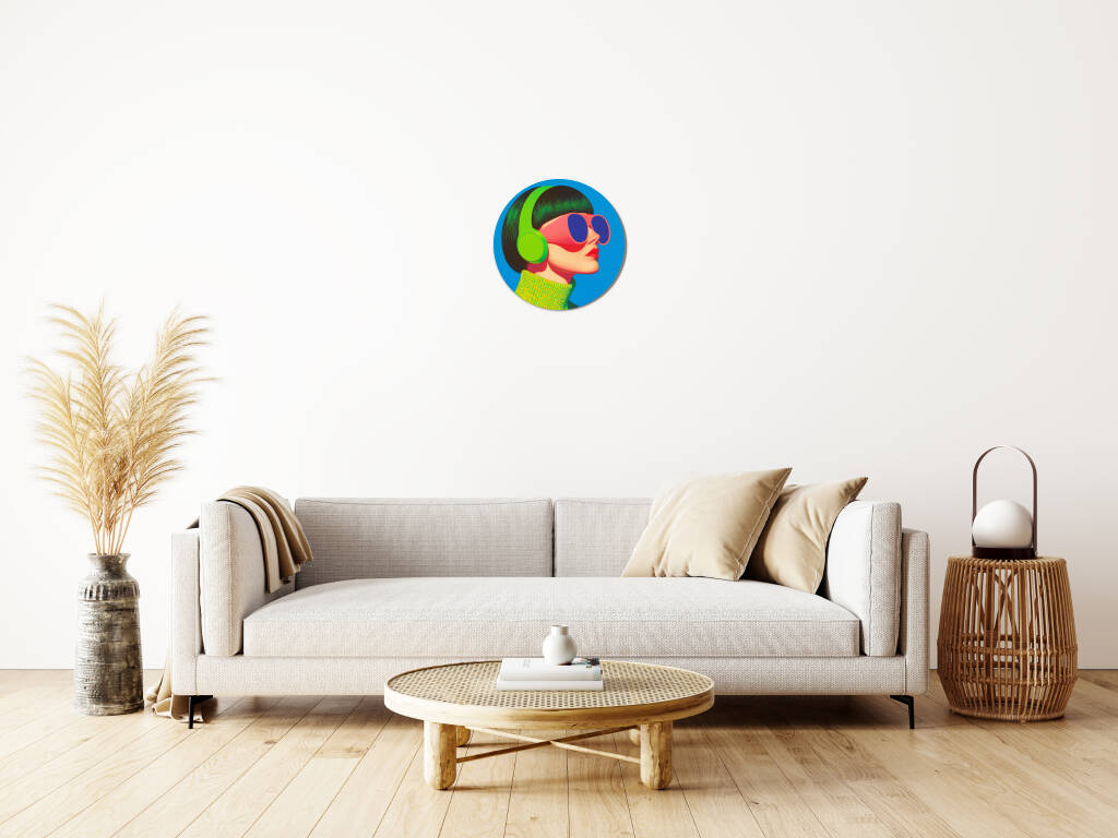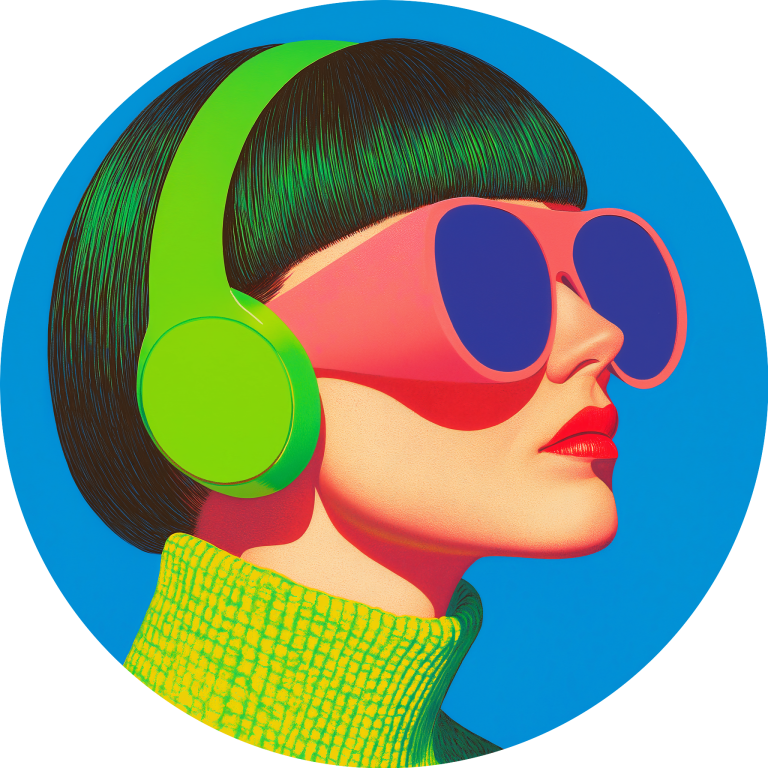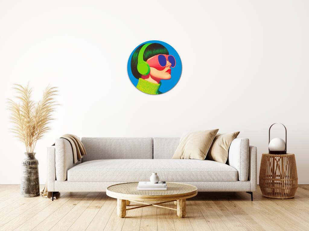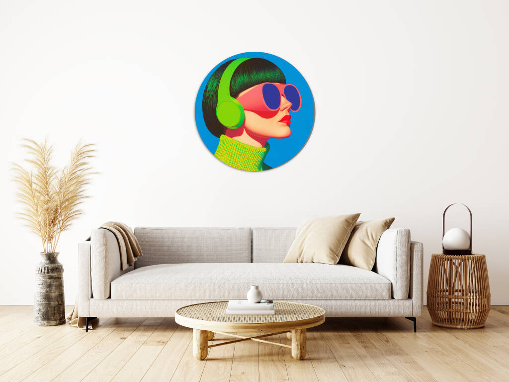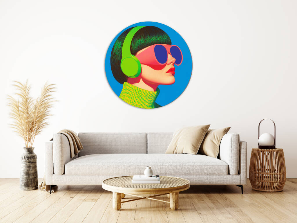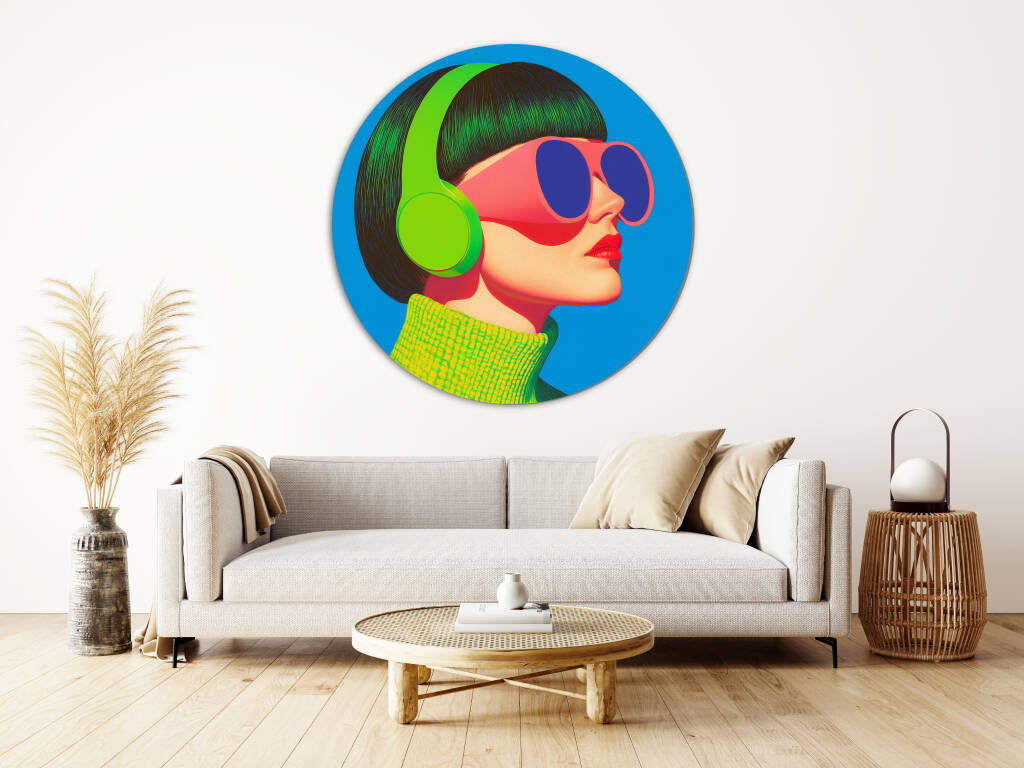 Outdoor Introvert toont een stijlvol portret van een moderne vrouw die volledig opgaat in haar eigen wereld, uitgerust met koptelefoon en zonnebril tegen een levendige blauwe achtergrond. De opvallende neon groene en gele accenten van haar kleding en accessoires contrasteren krachtig met de rustige blauwe tinten, wat een gevoel van moderne urban coolness creëert. De pop art-stijl en de grafische compositie geven het kunstwerk een eigentijdse, trendy uitstraling. Dit contemporary portret belichaamt de moderne digitale levensstijl en brengt een vleugje streetwear esthetiek in je interieur.