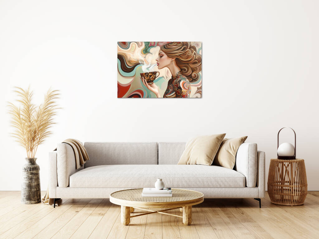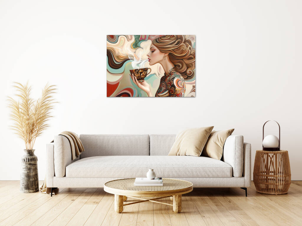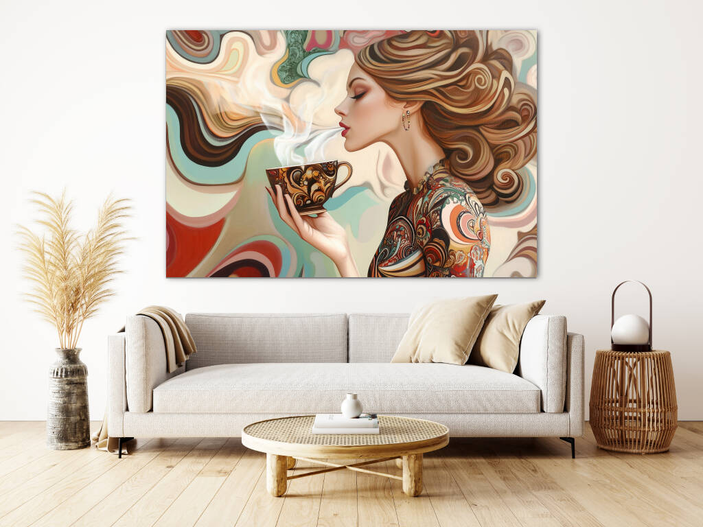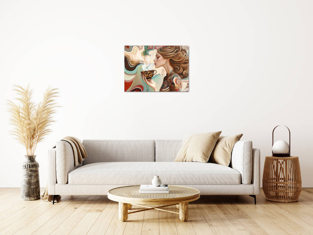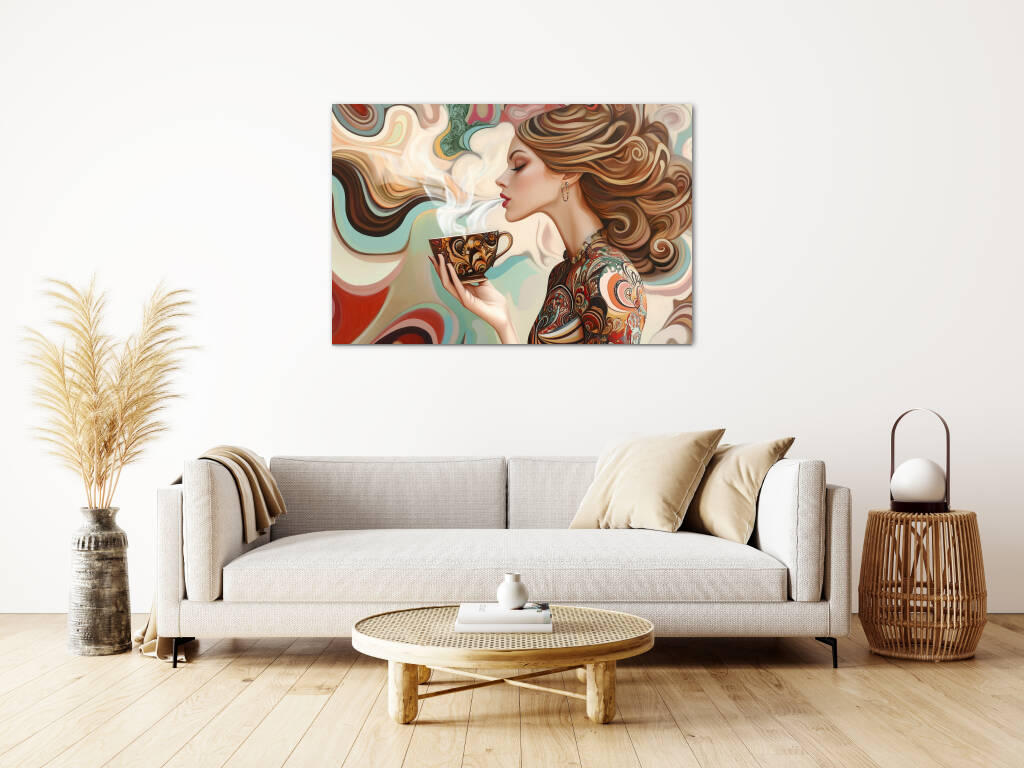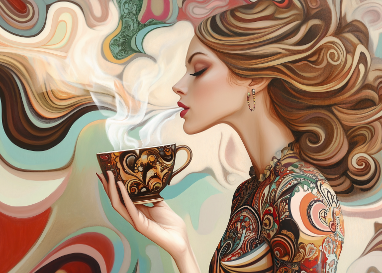 Een elegante vrouw met weelderig golvend haar, die een kop koffie vasthoudt terwijl de damp op artistieke wijze versmelt met de abstracte achtergrond. De stijl is een mix van Art Nouveau en modern surrealistische kunst, met vloeiende lijnen, decoratieve patronen en sierlijke details. De kleuren zijn warm en harmonieus, met tinten van karamel, bruin, crème en turquoise. De sfeer is dromerig en nostalgisch, met een vleugje luxe en mystiek, alsof de geur van de koffie een magische ervaring oproept.