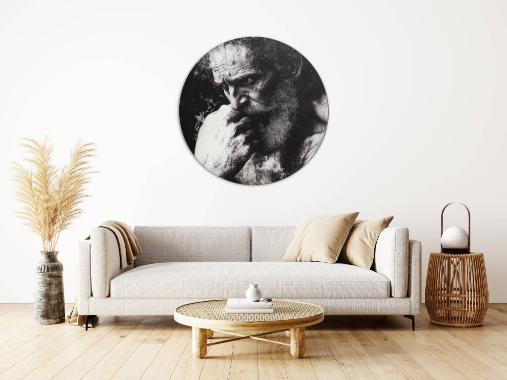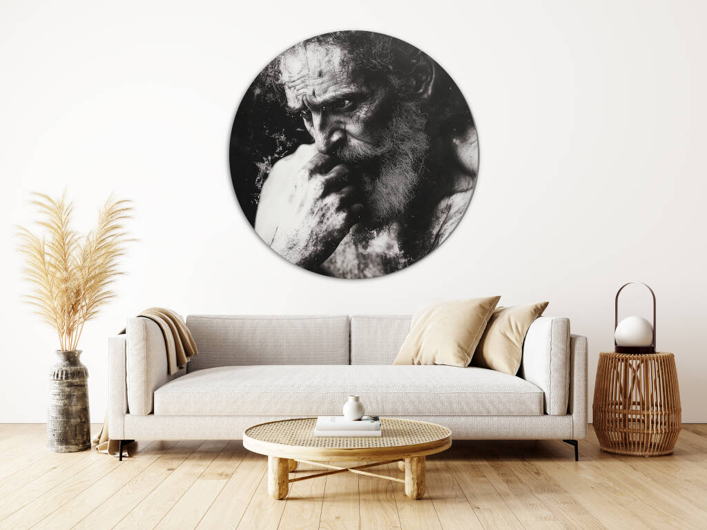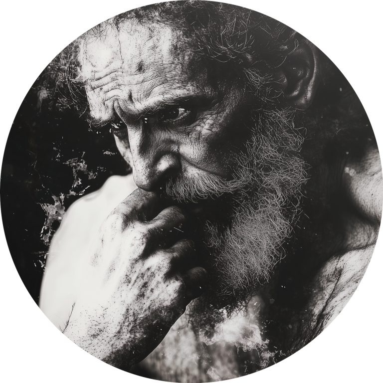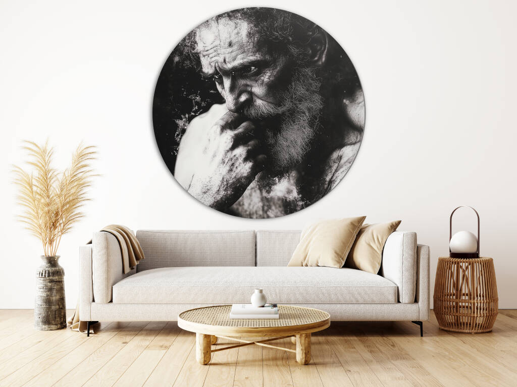 Het kunstwerk "Overthinker" toont een krachtige zwart-wit close-up van een oudere man, diep verzonken in gedachten. Zijn getekende gezicht, borstelige baard en intense blik stralen wijsheid en introspectie uit. De zachte, ruwe texturen rondom hem geven het werk een dromerige en bijna etherische kwaliteit, terwijl het contrast tussen licht en schaduw de emotie versterkt.