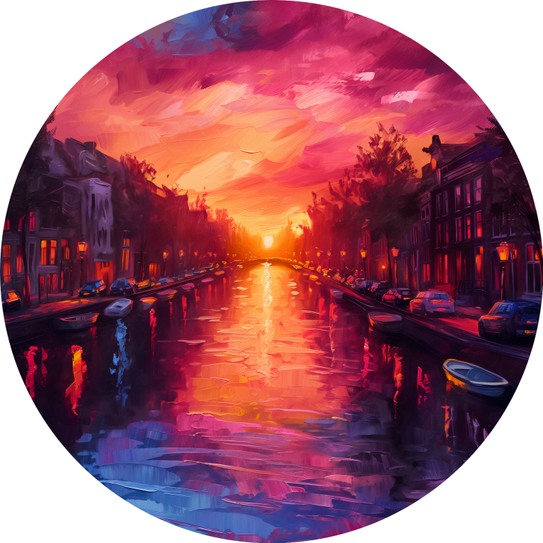 Dit schilderij van een zonsondergang aan een sfeervolle gracht combineert warme, levendige kleuren met expressieve penseelstreken. De reflectie van het kleurrijke avondlicht op het water creëert een dromerige, bijna magische sfeer. Perfect als blikvanger in een moderne woonkamer of creatieve ruimte, dit werk brengt een vleugje romantiek en stedelijke charme in elk interieur.
