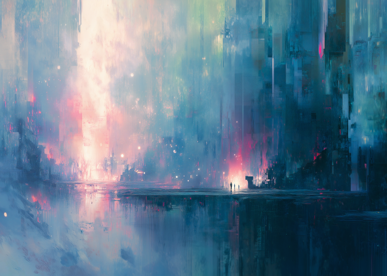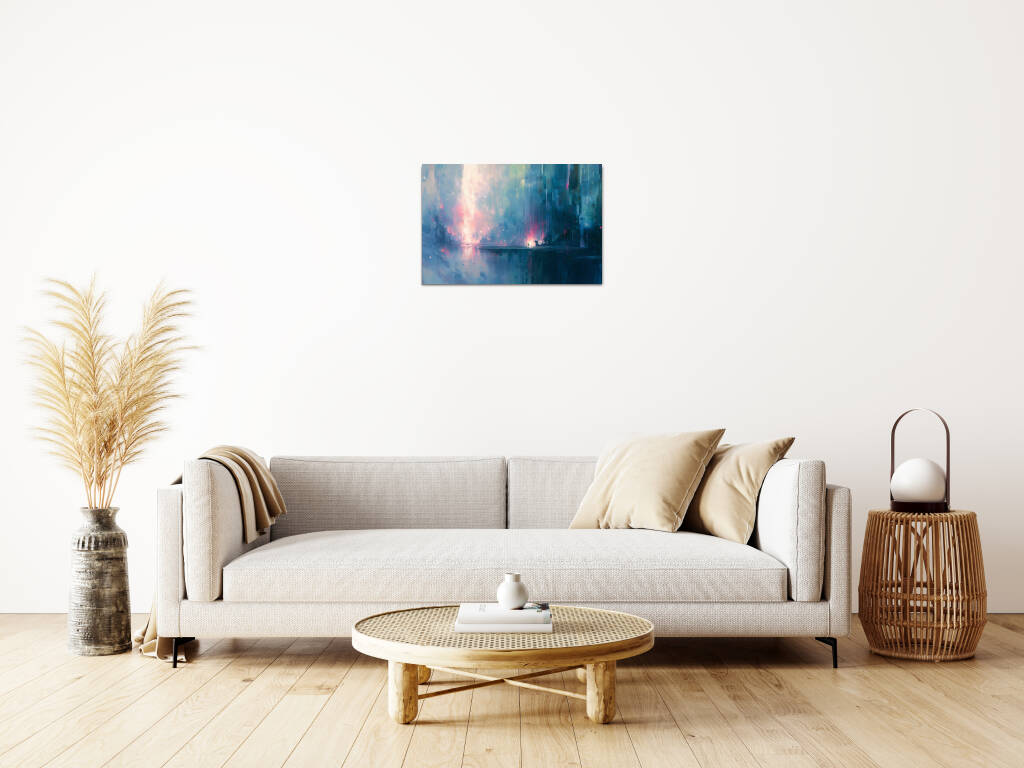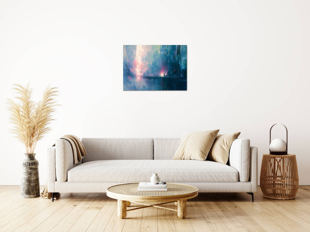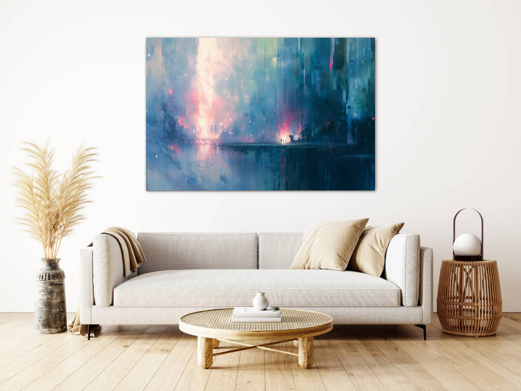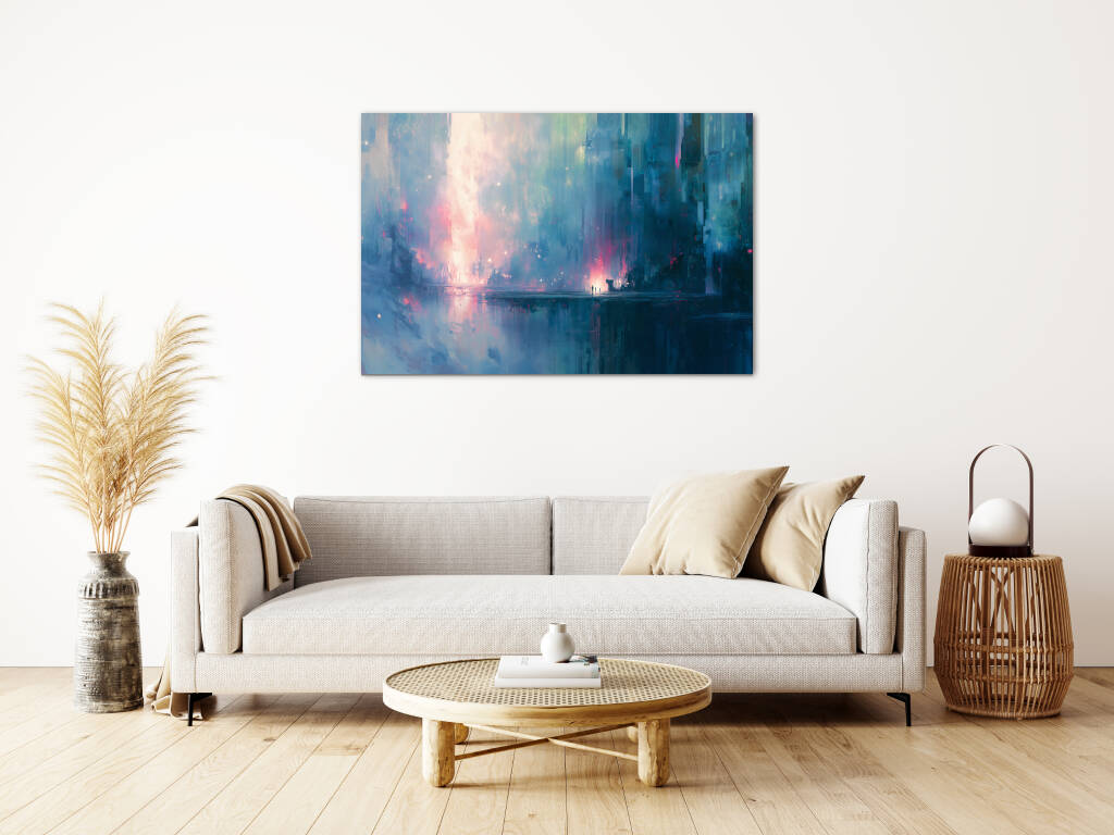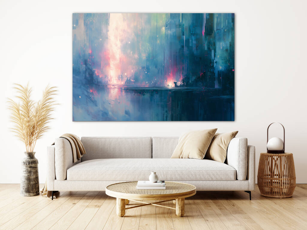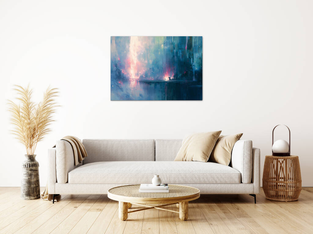 Urban Dreamscape schildert een dromerige interpretatie van het stadsleven waar realiteit vervaagt in impressionistische penseelstreken. Zachte roze en blauwe tinten weerspiegelen in wat een nachtelijke stadshorizon lijkt, terwijl lichten dansen op een wateroppervlak. Dit atmosferische kunstwerk vangt de poëzie van de stad na een regenbui, wanneer alles glimt en de wereld zachter lijkt. Perfect voor wie de romantiek van het stadsleven waardeert.