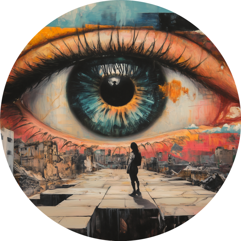 Dit intrigerend design toont een gigantisch oog dat majestueus uitkijkt over een verwoest landschap. Het oog, levendig in kleuren met een intens blauwe iris en goudgele details, symboliseert wellicht bewustzijn of een hogere macht. Op de voorgrond staat een silhouetfiguur op een vervallen pad, wat een gevoel van introspectie en betekenis zoekt in een wereld van chaos. De combinatie van surrealistische en post-apocalyptische elementen creëert een krachtig visueel verhaal dat uitnodigt tot interpretatie en reflectie.
