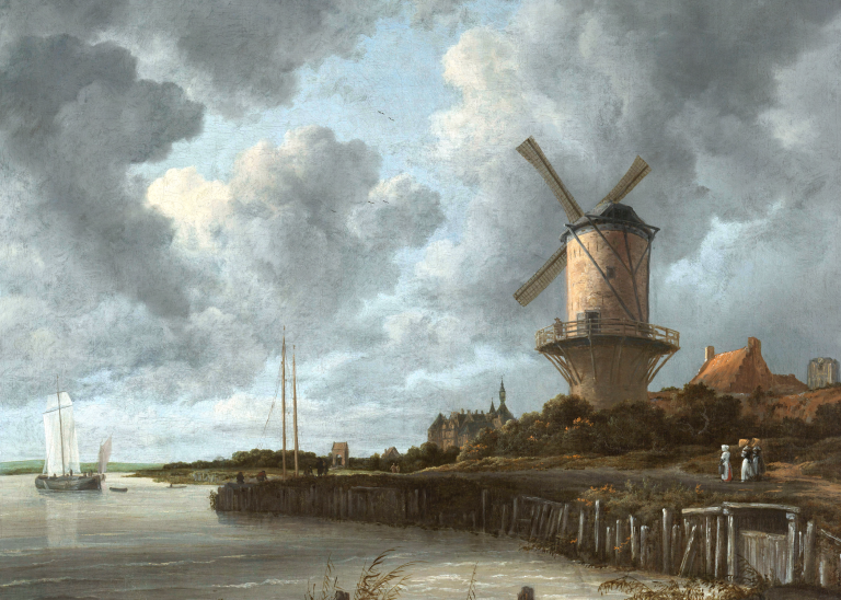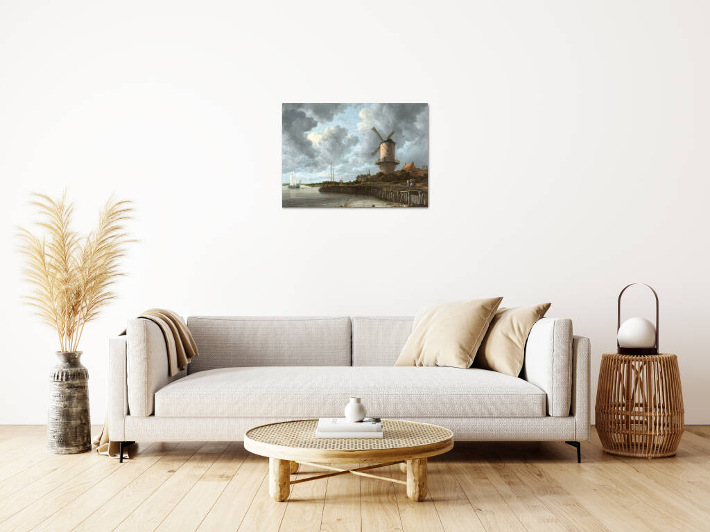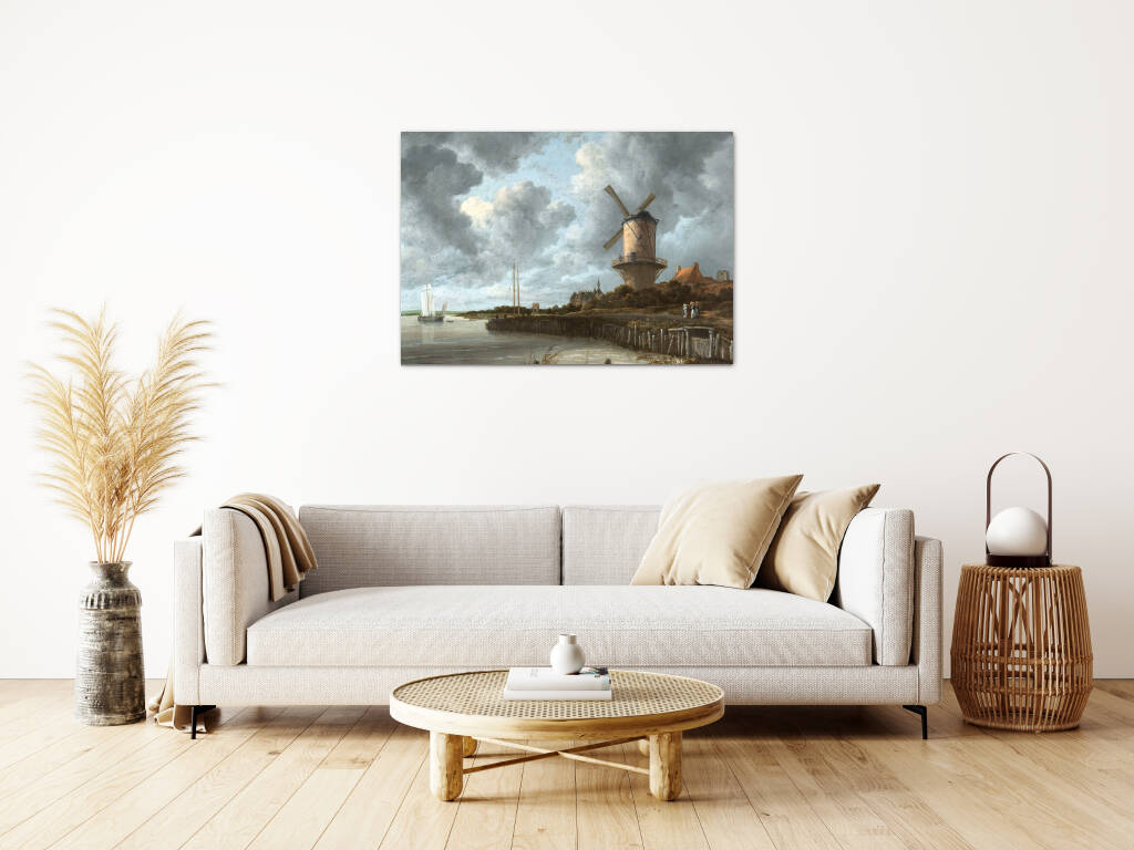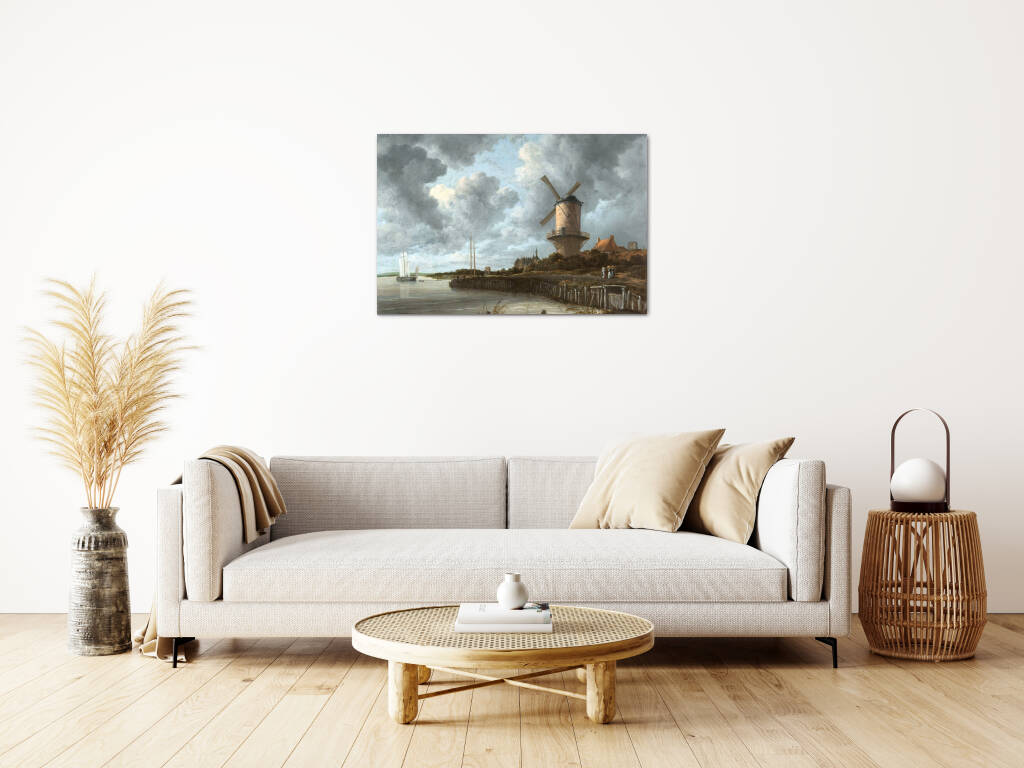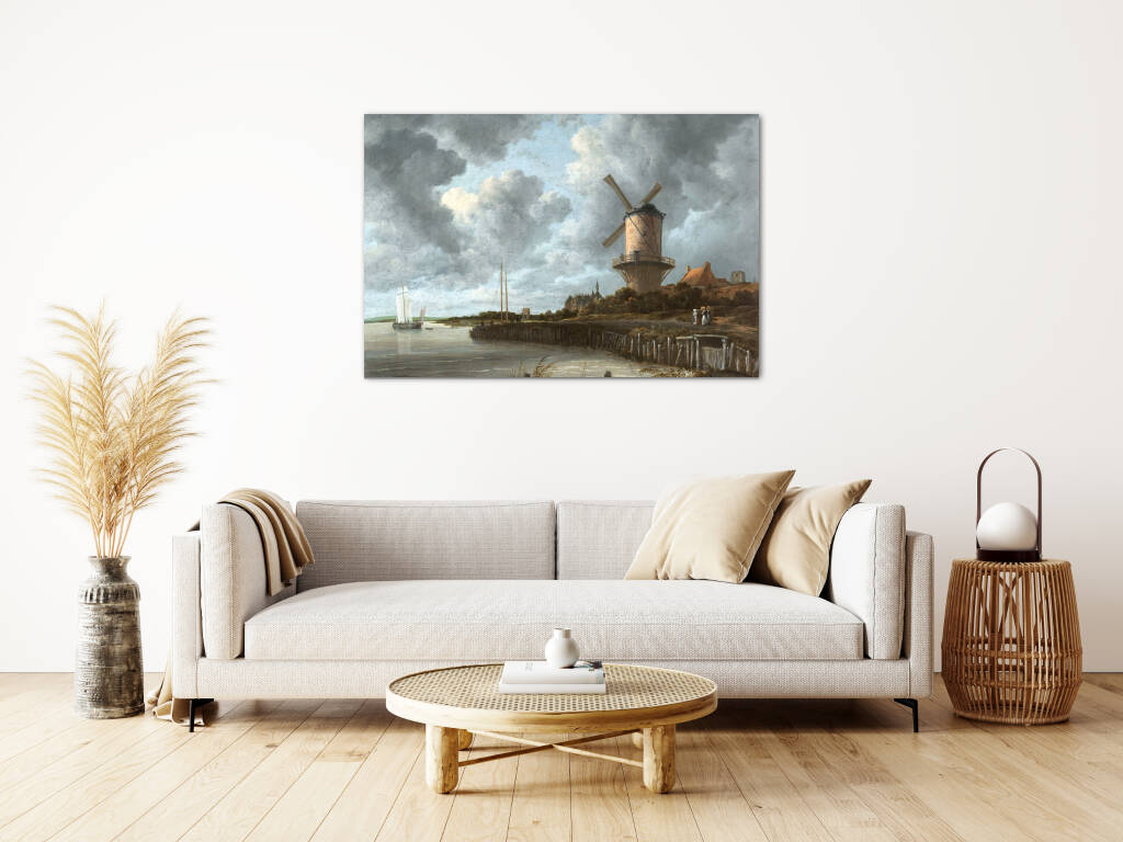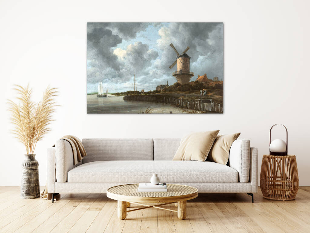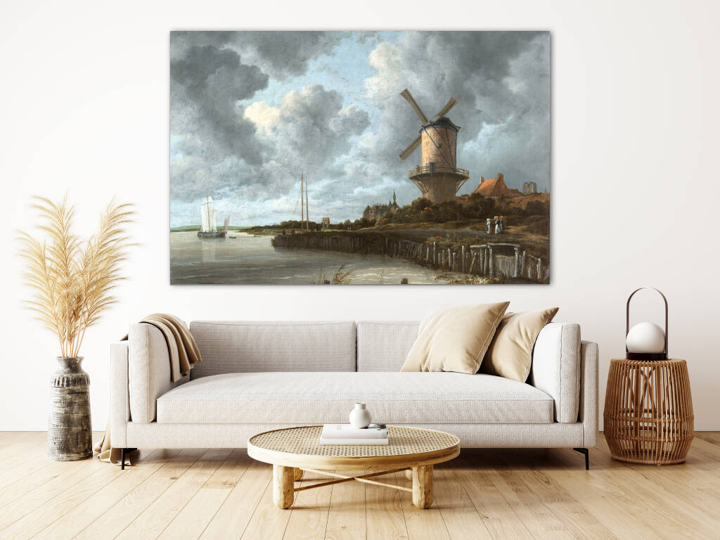Deze meesterlijke reproductie van De molen bij Wijk bij Duurstede, geschilderd door Jacob Isaacksz van Ruisdael, vangt de grootsheid van het Nederlandse landschap. De imposante windmolen torent hoog boven de omgeving uit, terwijl de dramatische wolkenlucht en het spel van licht en schaduw een bijna tijdloze sfeer creƫren. De zachte weerspiegeling op het water en de subtiele details, zoals de schepen en wandelende figuren, maken dit kunstwerk tot een icoon van de Hollandse Gouden Eeuw. Een klassieke toevoeging aan elk interieur, perfect voor liefhebbers van landschapsschilderkunst en historische esthetiek.