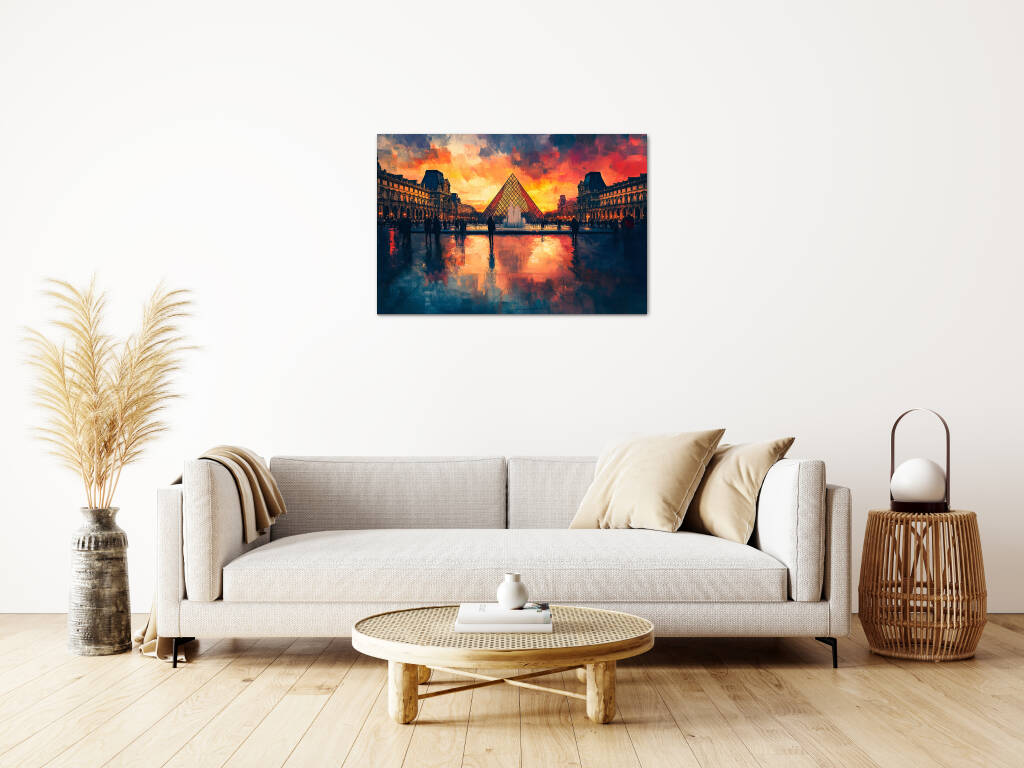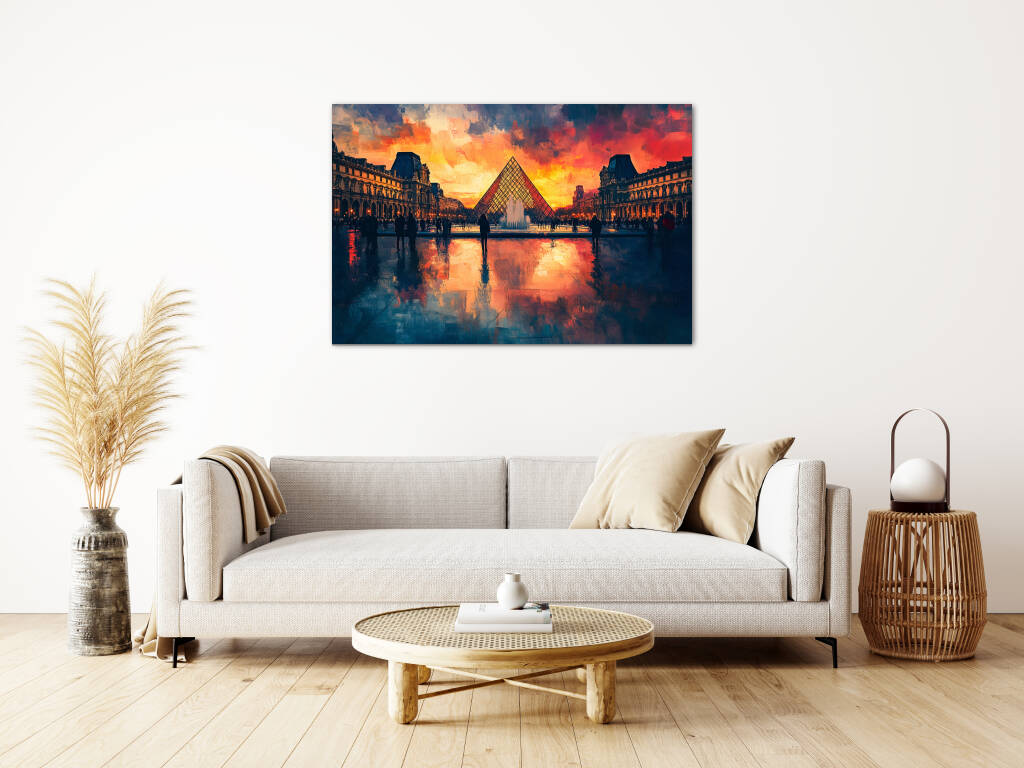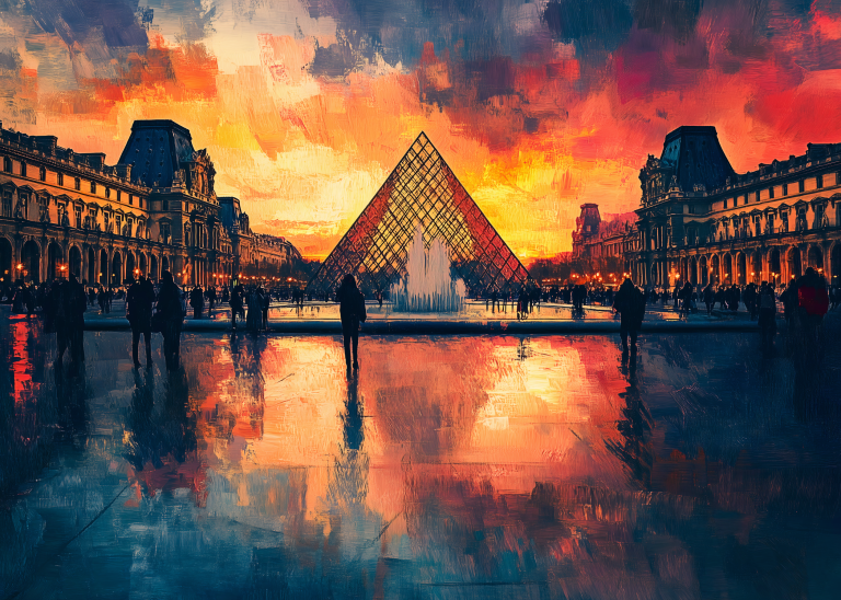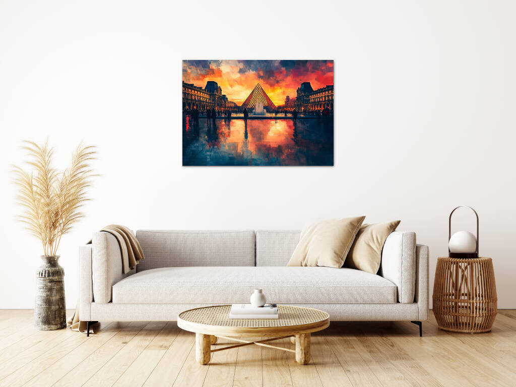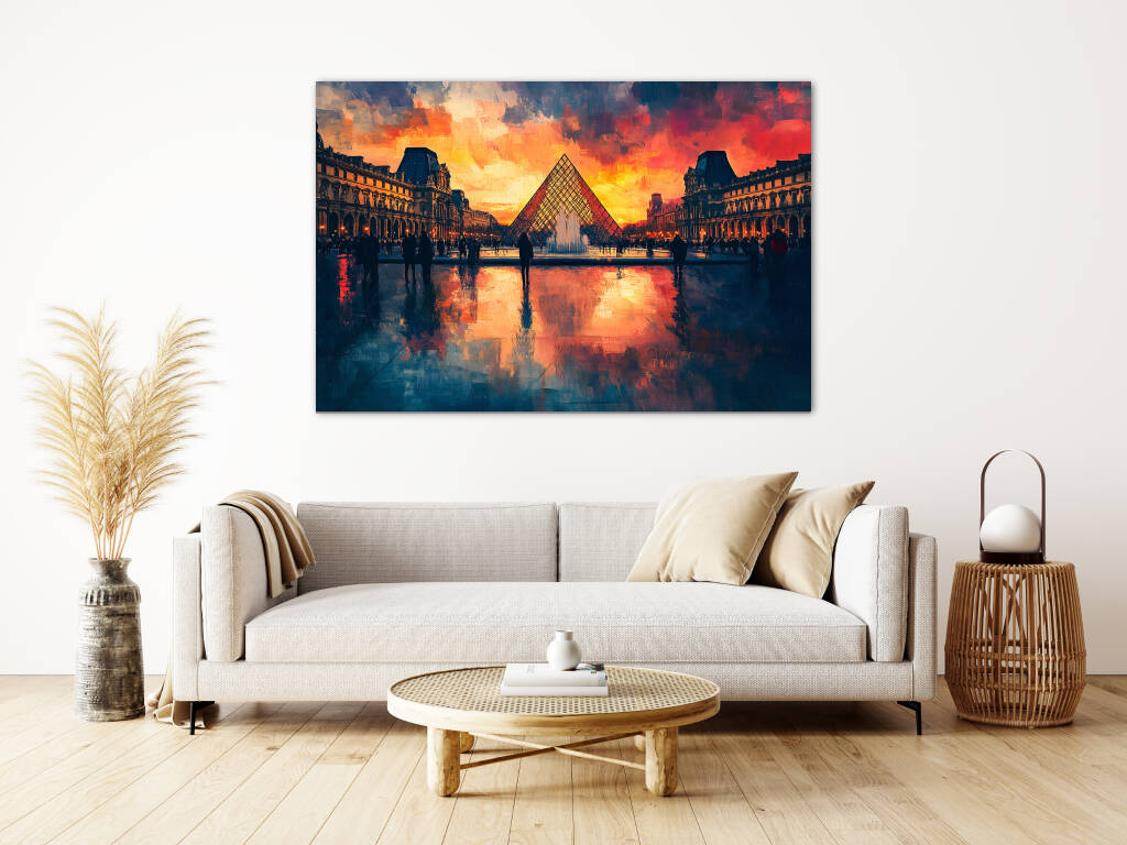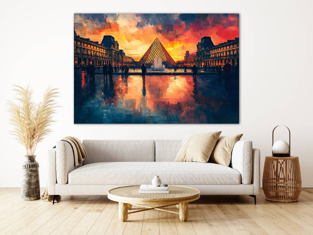 Le Louvre toont het iconische museum gehuld in dramatische zonsondergangkleuren die de Parijse hemel in vuur en vlam zetten. De glazen piramide weerspiegelt de warme oranje en rode tinten terwijl silhouetten van bezoekers over het natte plein wandelen. Deze impressionistische interpretatie vangt de tijdloze grandeur van een van 's werelds beroemdste culturele monumenten. Perfect voor liefhebbers van Parijs, architectuur en kunstgeschiedenis die verlangen naar een vleugje Franse elegantie.