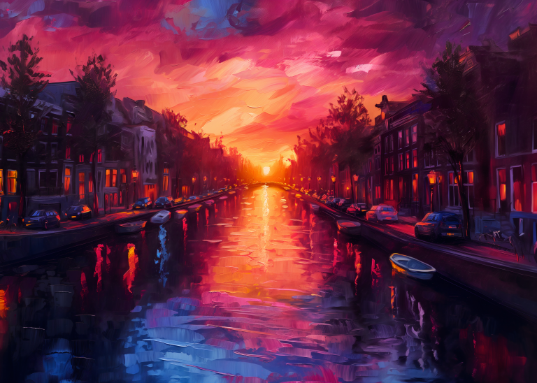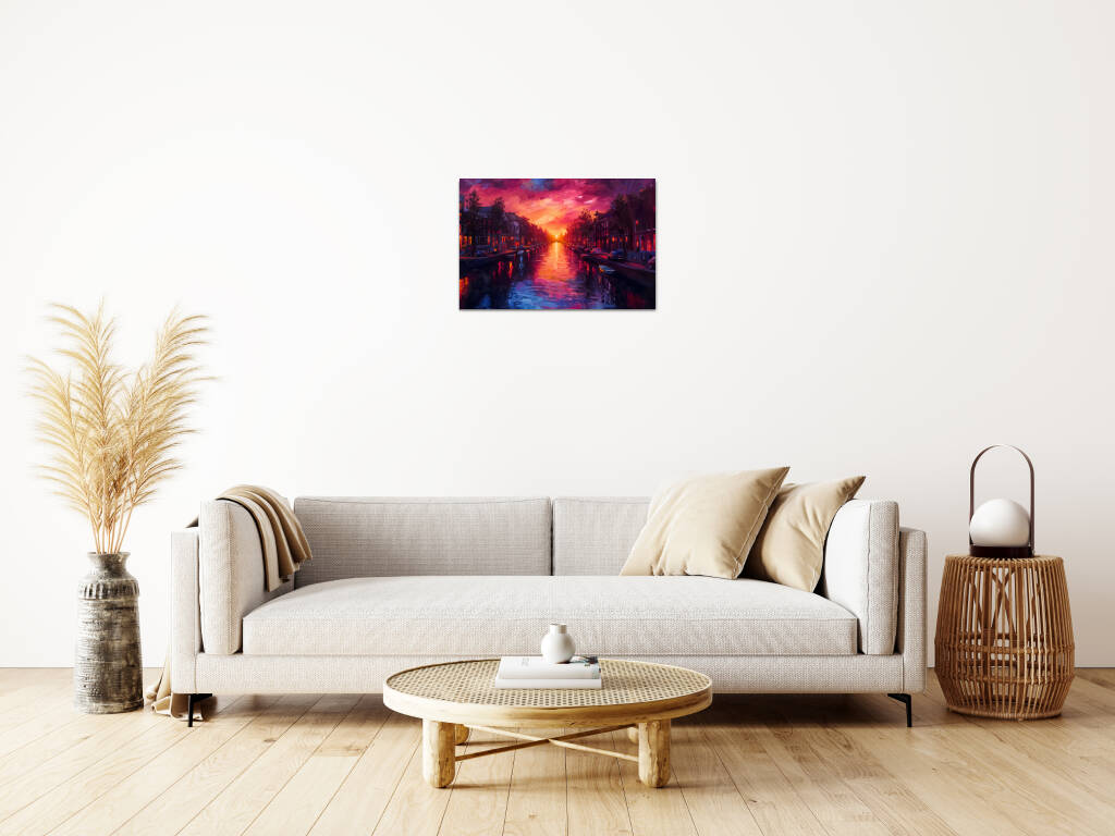 Dit schilderij van een zonsondergang aan een sfeervolle gracht combineert warme, levendige kleuren met expressieve penseelstreken. De reflectie van het kleurrijke avondlicht op het water creƫert een dromerige, bijna magische sfeer. Perfect als blikvanger in een moderne woonkamer of creatieve ruimte, dit werk brengt een vleugje romantiek en stedelijke charme in elk interieur.