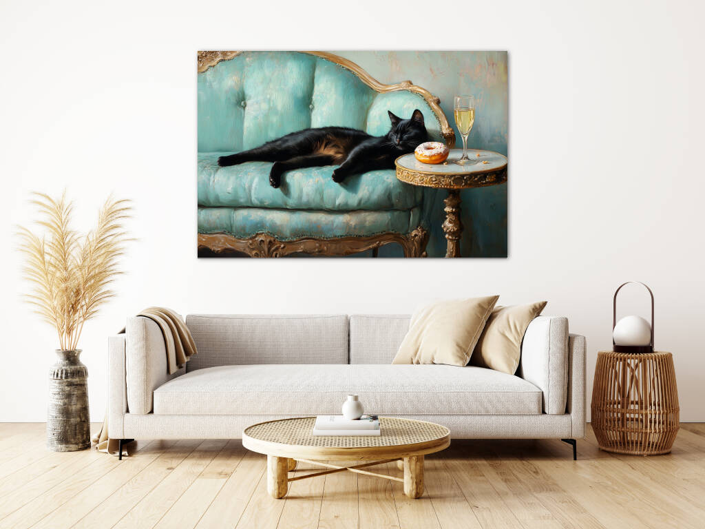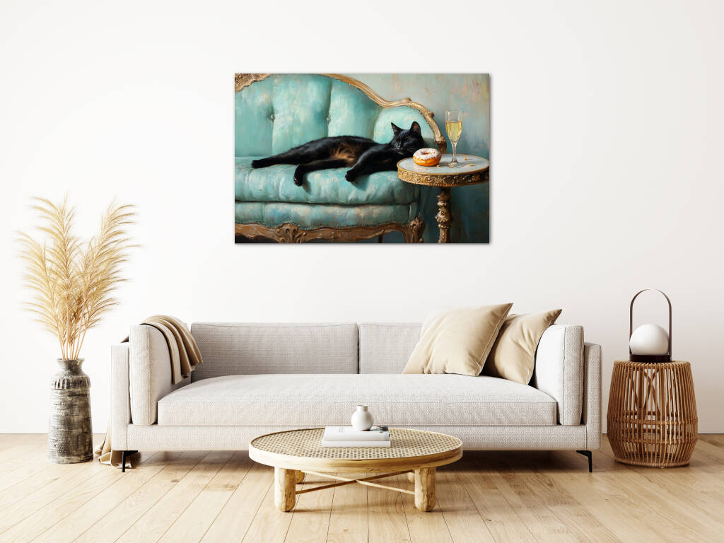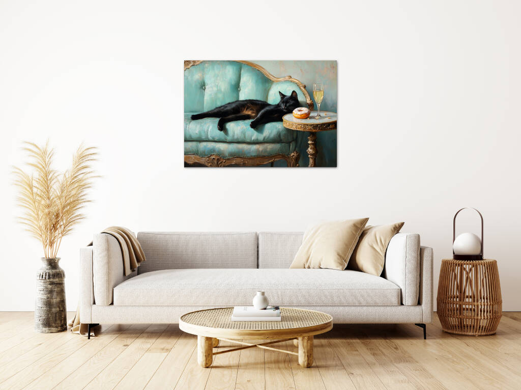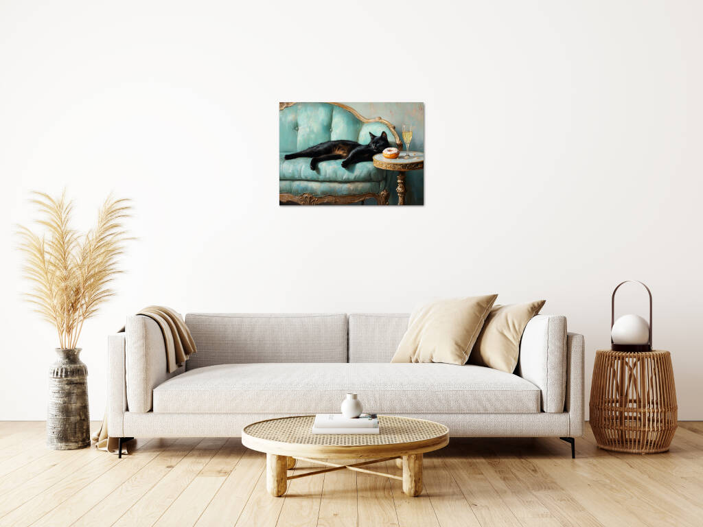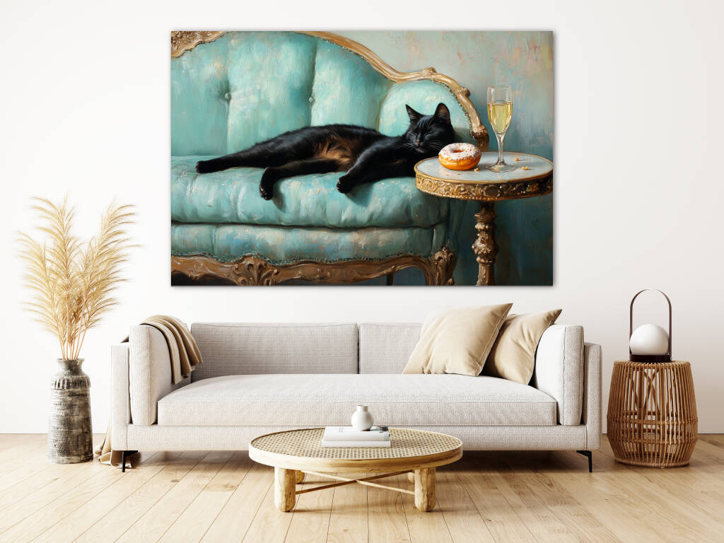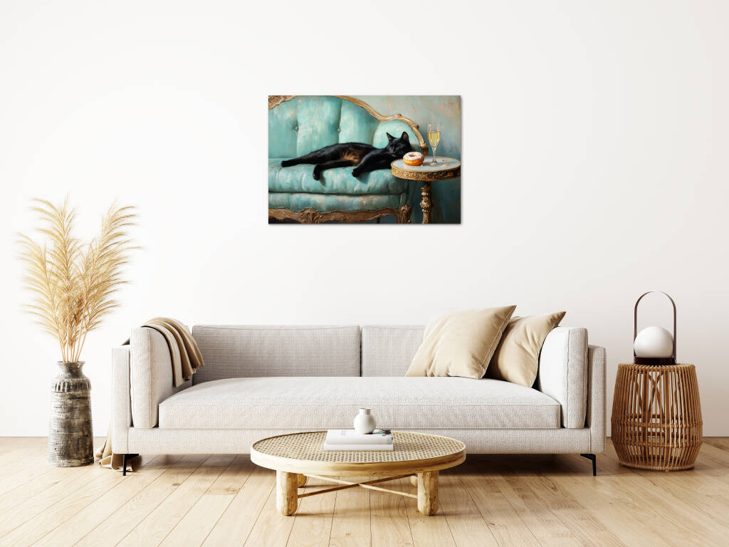 Spoiled Cat toont een charmante zwarte kat die het leven van de rijken en beroemden leeft, luxueus uitgestrekt op een antieke turquoise fauteuil met champagne en gebak binnen handbereik. De rijke texturen van het barokke meubilair en de warme vintage kleuren creƫren een aristocratische sfeer vol humor en decadentie. Dit kunstwerk combineert klassieke elegantie met een speelse knipoog naar de verwende kattenlevensstijl. Perfect voor kattenliefhebbers met een voorliefde voor luxe en een vleugje humor in hun interieur.