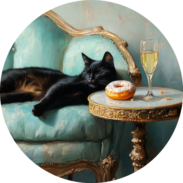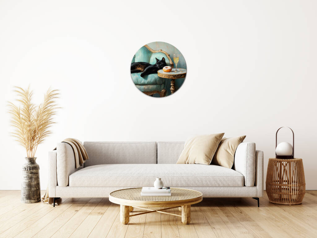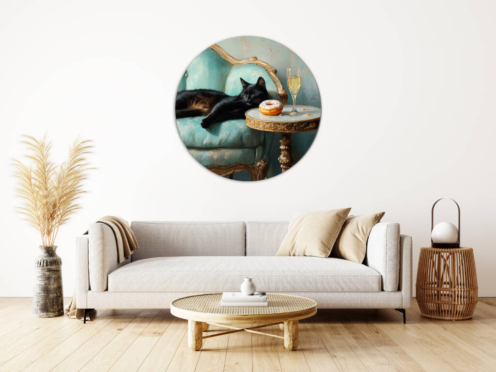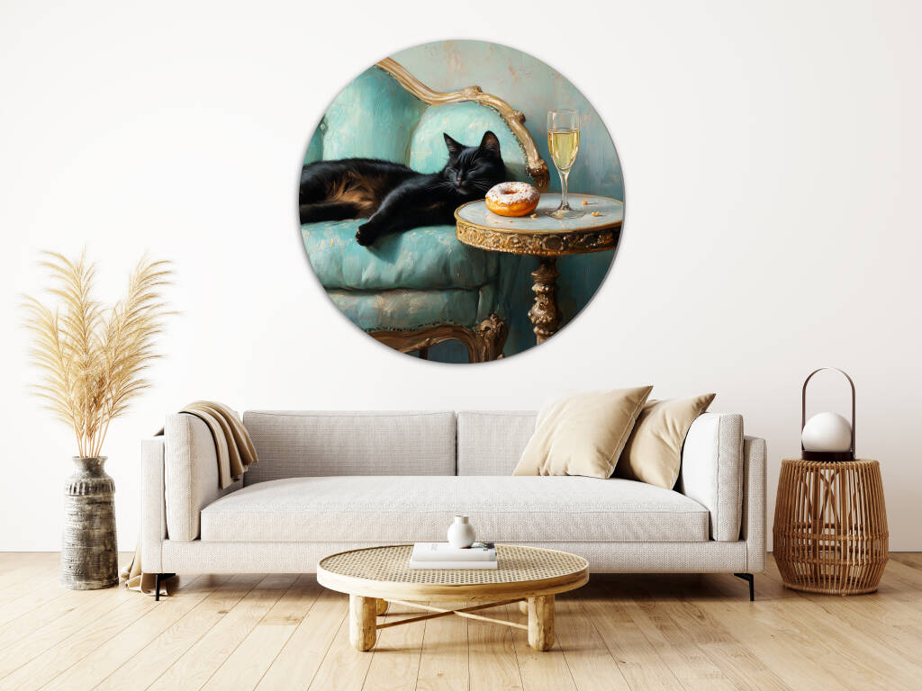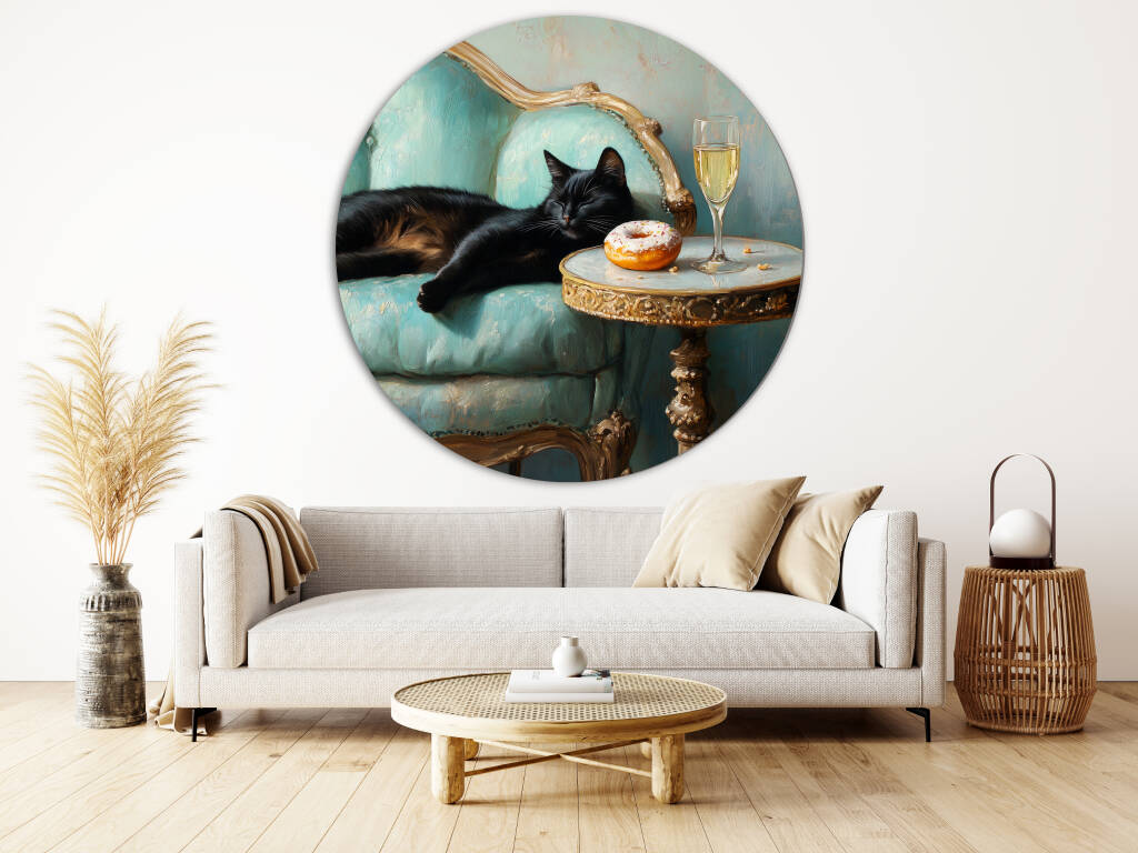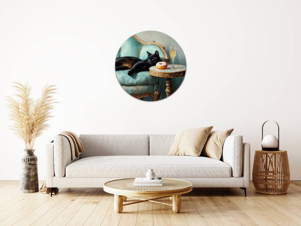 Spoiled Cat toont een charmante zwarte kat die het leven van de rijken en beroemden leeft, luxueus uitgestrekt op een antieke turquoise fauteuil met champagne en gebak binnen handbereik. De rijke texturen van het barokke meubilair en de warme vintage kleuren creëren een aristocratische sfeer vol humor en decadentie. Dit kunstwerk combineert klassieke elegantie met een speelse knipoog naar de verwende kattenlevensstijl. Perfect voor kattenliefhebbers met een voorliefde voor luxe en een vleugje humor in hun interieur.