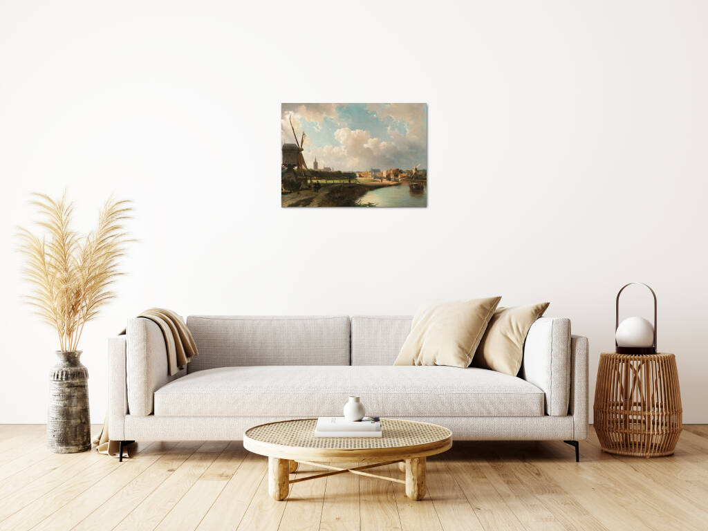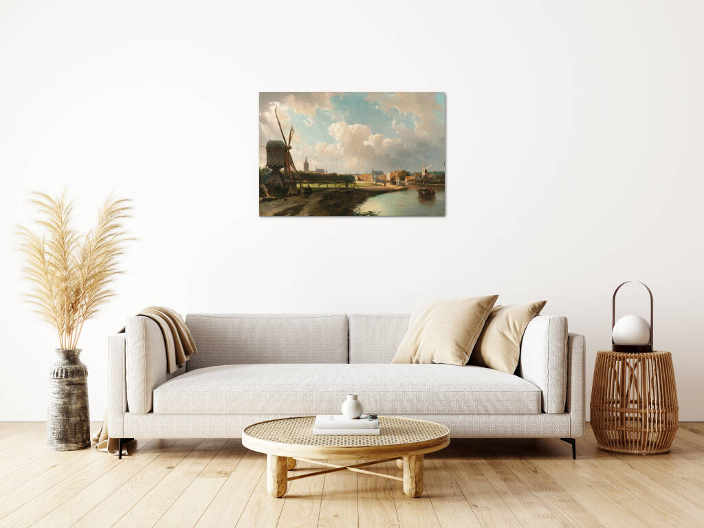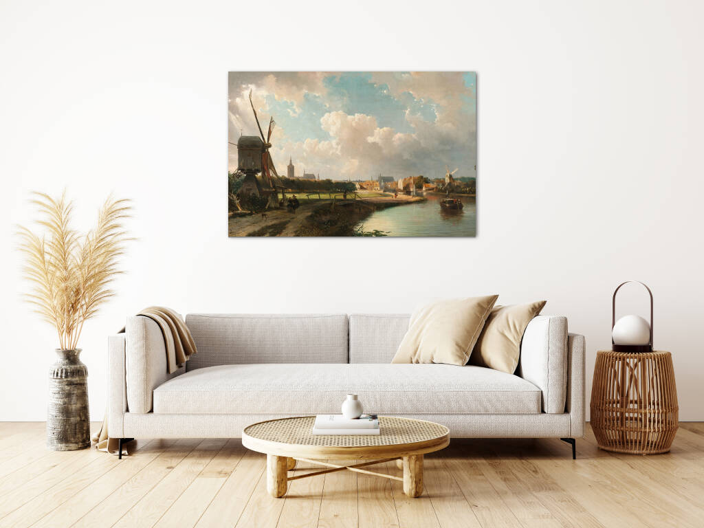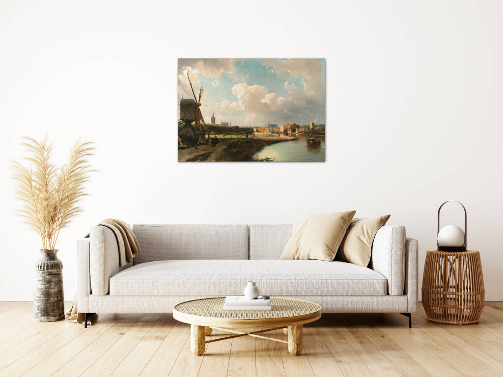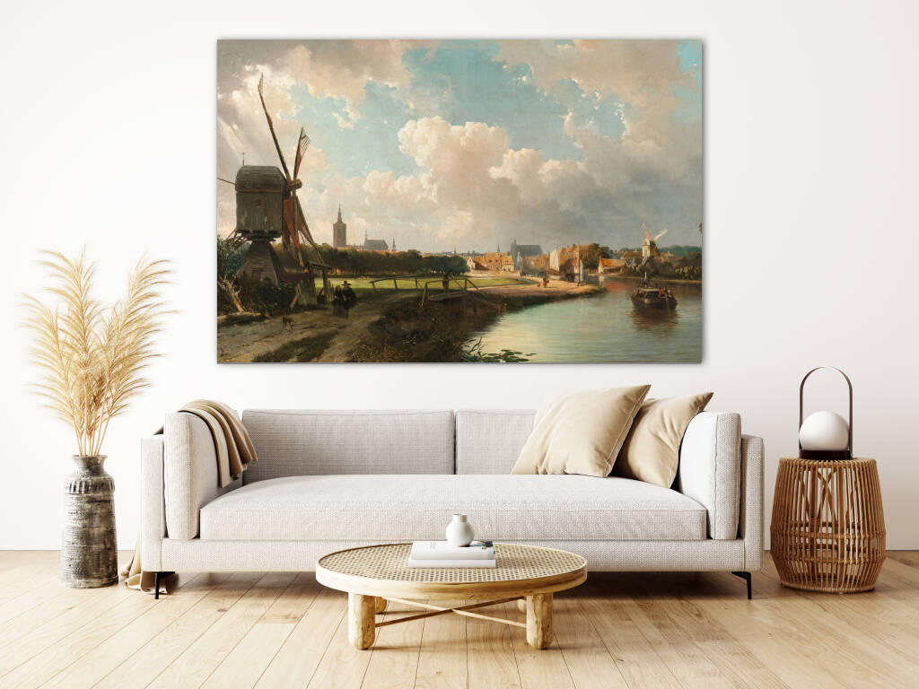 Zicht op Den Haag vanaf de Delftse Vaart toont een karakteristiek Nederlands landschap uit de Gouden Eeuw. De monumentale windmolens langs de waterweg vormen een iconisch silhouet tegen de bewolkte Hollandse lucht. In de verte zijn de torens van Den Haag zichtbaar, terwijl een trekschuit kalm over het water glijdt. Het spel van licht en schaduw op de wolken geeft dit historische tafereel een tijdloze schoonheid. De warme, gouden tinten van het zonlicht contrasteren prachtig met de koele blauwtinten van de lucht. Dit werk vangt de essentie van het Nederlandse landschap en de belangrijke rol die waterwegen speelden in het dagelijks leven en transport tussen steden. Een nostalgisch venster naar het verleden dat de grootsheid van ons cultureel erfgoed viert.