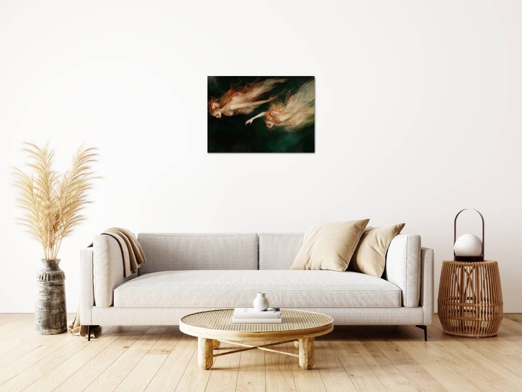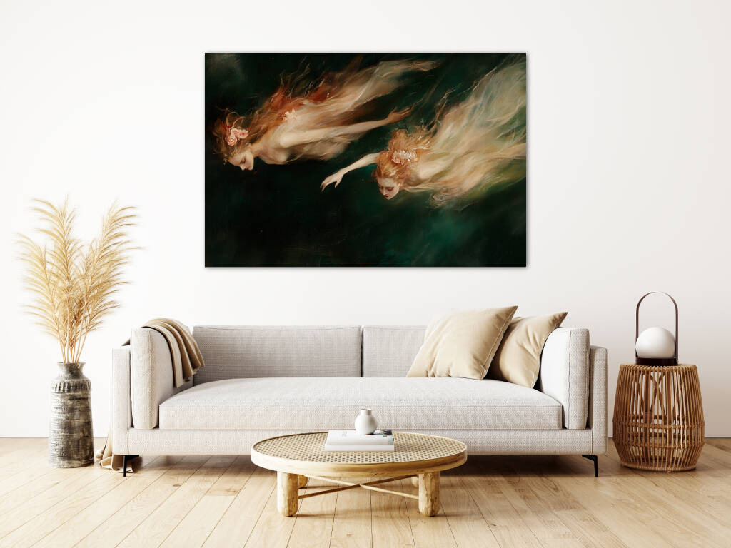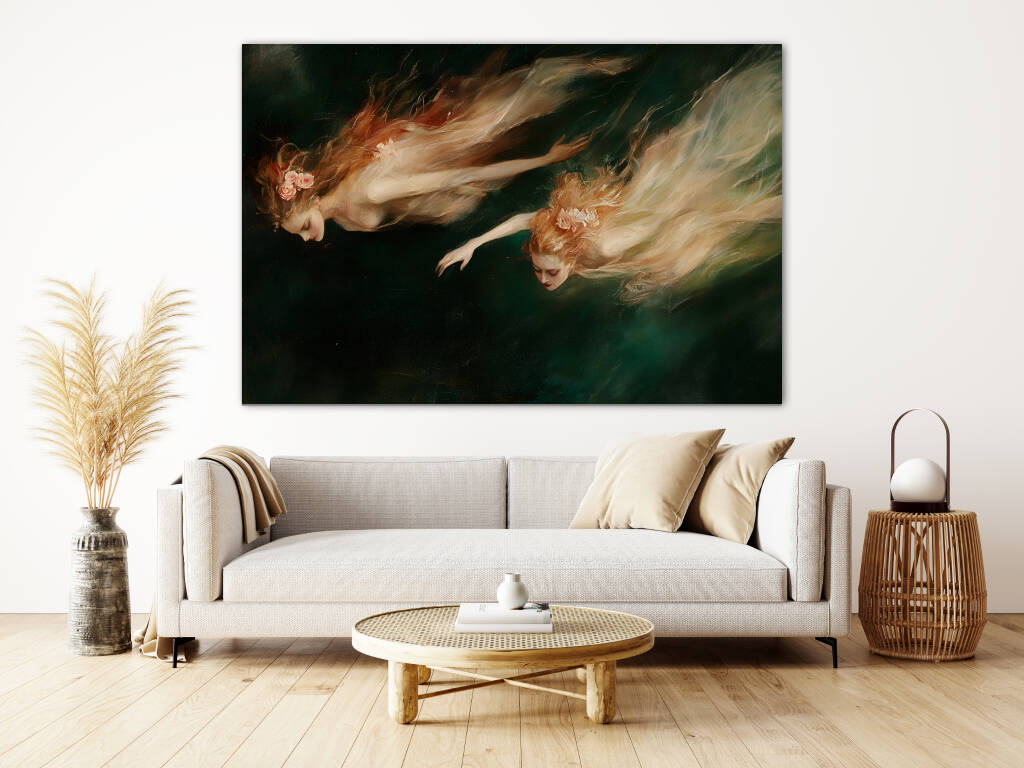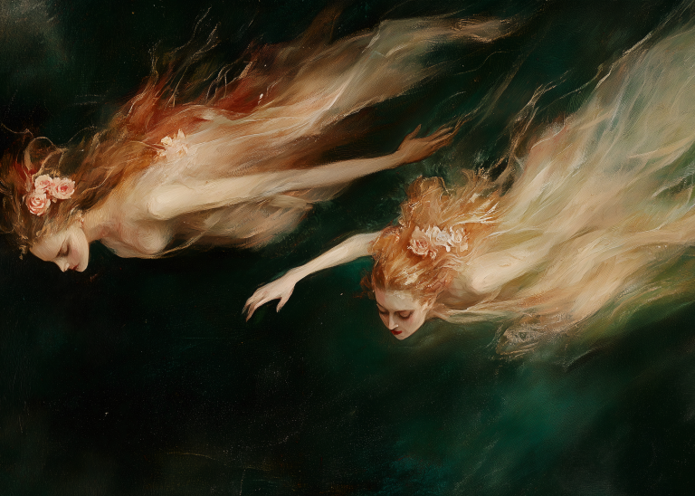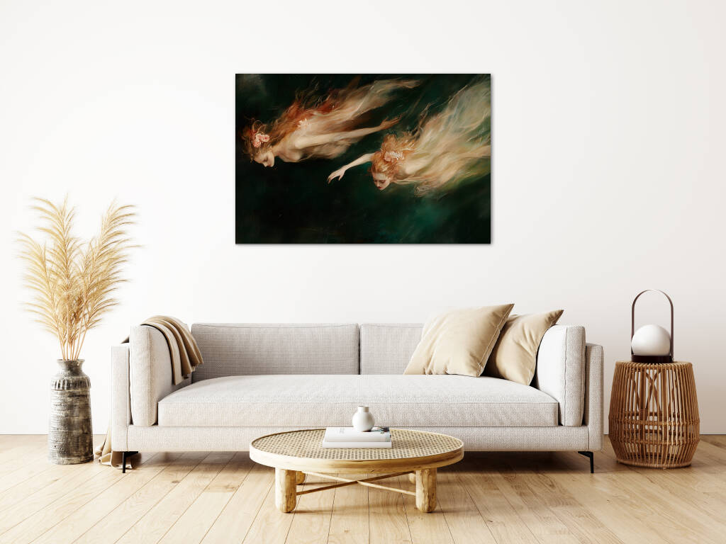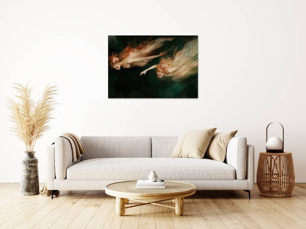 Sirens toont twee etherische zeenimfen die zweven in donkere wateren, hun lichamen gehuld in vloeiende gewaden die dansen als zeewier in de stroming. De klassieke schilderstijl en de mysterieuze sfeer roepen de oude mythologieën tot leven, waar schoonheid en gevaar hand in hand gaan. Dit betoverende kunstwerk vangt de verleidelijke maar gevaarlijke natuur van deze mythische wezens. Perfect voor liefhebbers van klassieke kunst en mythologische verhalen.