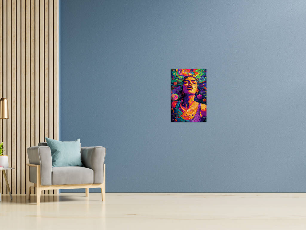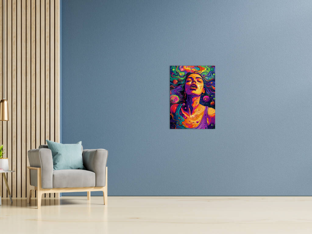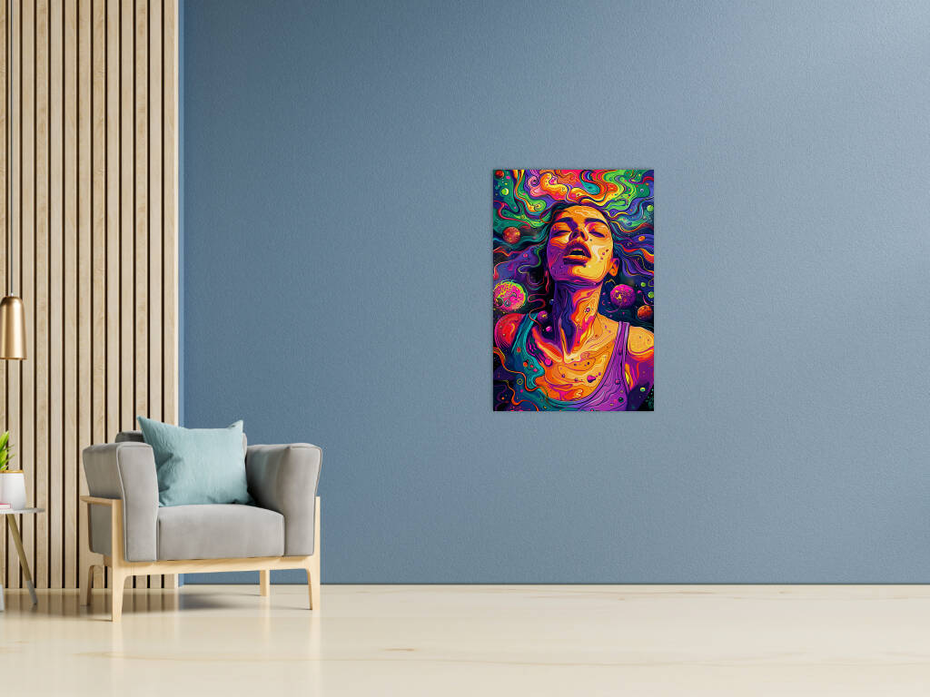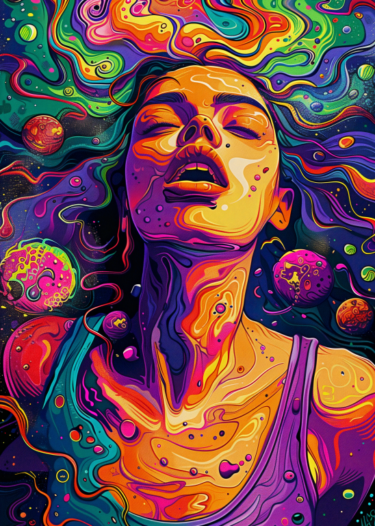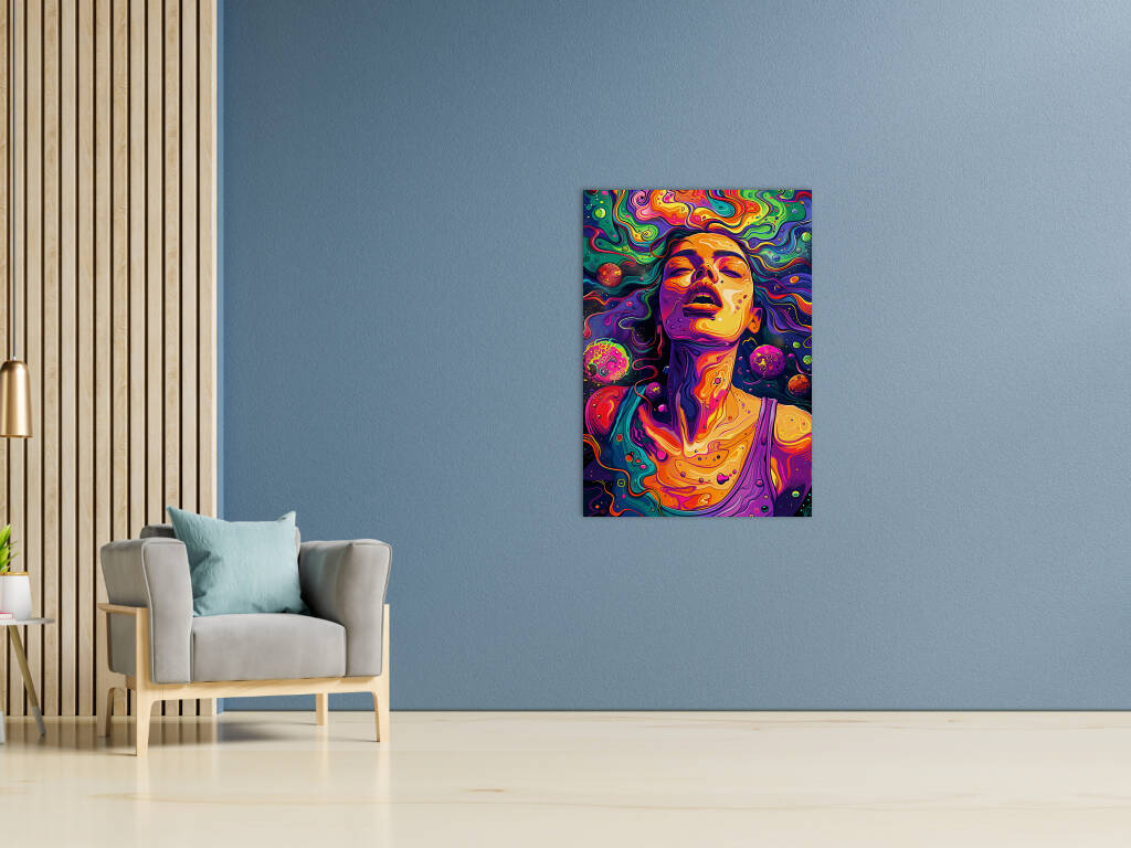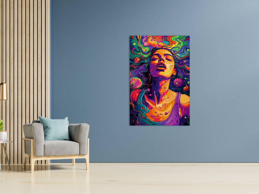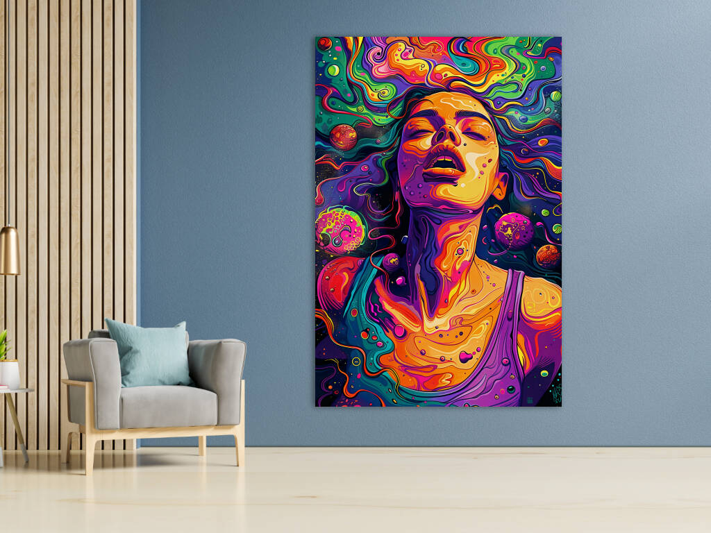Trippy is een psychedelisch kunstwerk dat een vrouw toont met een extatische gezichtsuitdrukking, omgeven door een kleurrijk, golvend universum. Haar huid en haar smelten samen met surrealistische patronen in neonkleuren, terwijl zwevende planeten en energiegolven een dromerige, kosmische sfeer creëren. De dynamische compositie en levendige tinten wekken een gevoel van bewustzijnsverruiming en vrijheid op, alsof ze zich volledig overgeeft aan een transcendente ervaring.