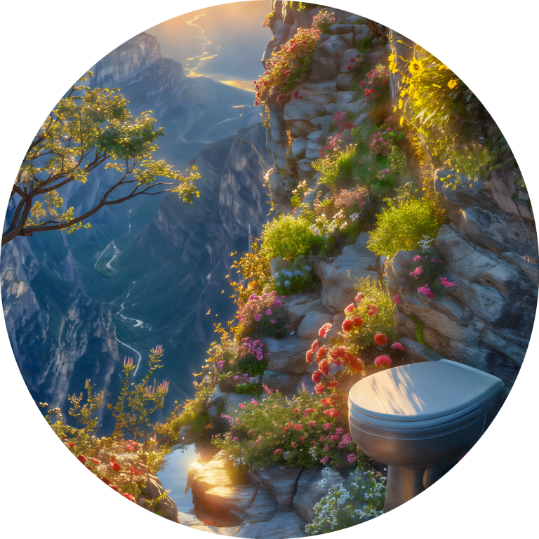 S(h)itting with a View is een humoristisch maar adembenemend kunstwerk dat een eenzame WC troont op de rand van een majestueus berglandschap. Omringd door weelderige bloemen en zonovergoten rotsen, biedt deze unieke troon een ongeëvenaard uitzicht op een diep dal en een spectaculaire zonsondergang. De combinatie van de serene natuur en de onverwachte aanwezigheid van het toilet creëert een speelse balans tussen verwondering en hilariteit, waardoor dit kunstwerk zowel rustgevend als geestig aanvoelt.