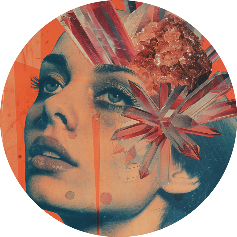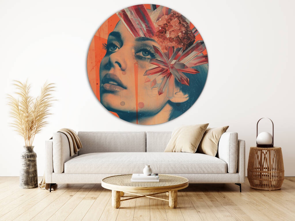 Crystal Migraine toont een surrealistisch portret waarin kristallen vormen explosief groeien uit het hoofd van een mysterieuze vrouw tegen een levendige oranje achtergrond. De abstracte elementen en de vintage pop-art esthetiek creëren een krachtige visuele metafoor voor creativiteit en transformatie. Dit gedurfde kunstwerk combineert realisme met fantasie op een manier die zowel intrigeert als inspireert. Perfect voor liefhebbers van conceptuele kunst die ruimte willen geven aan diepere betekenissen en artistieke expressie.