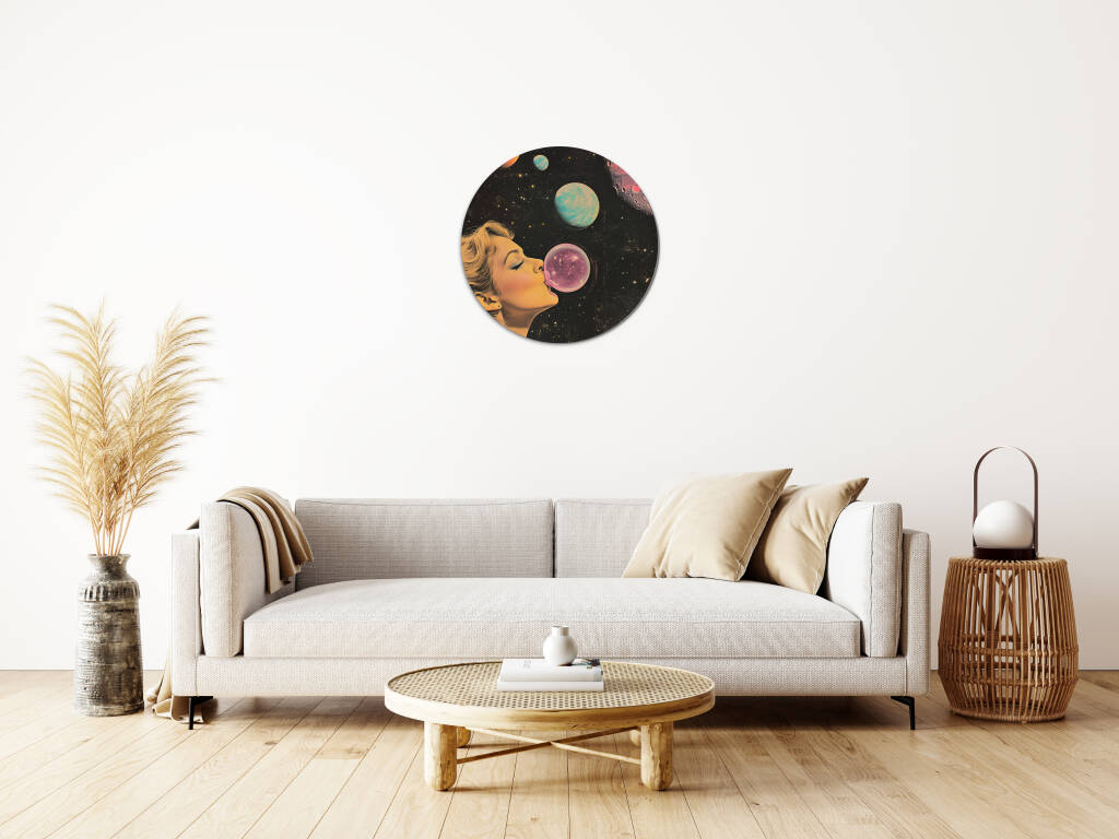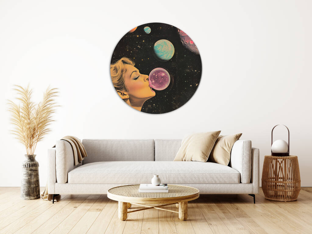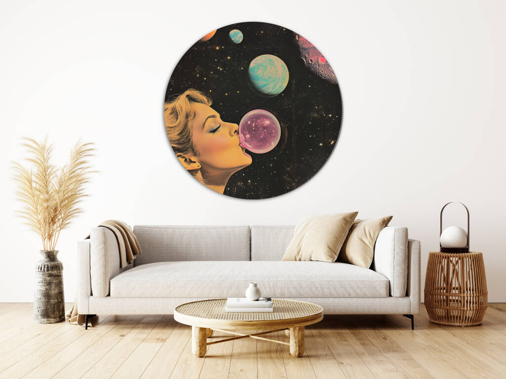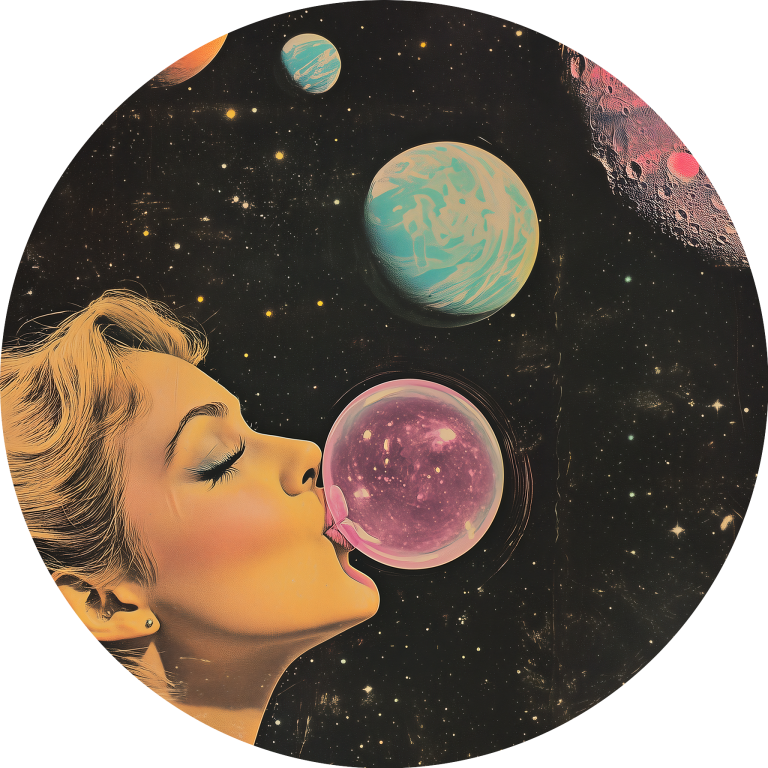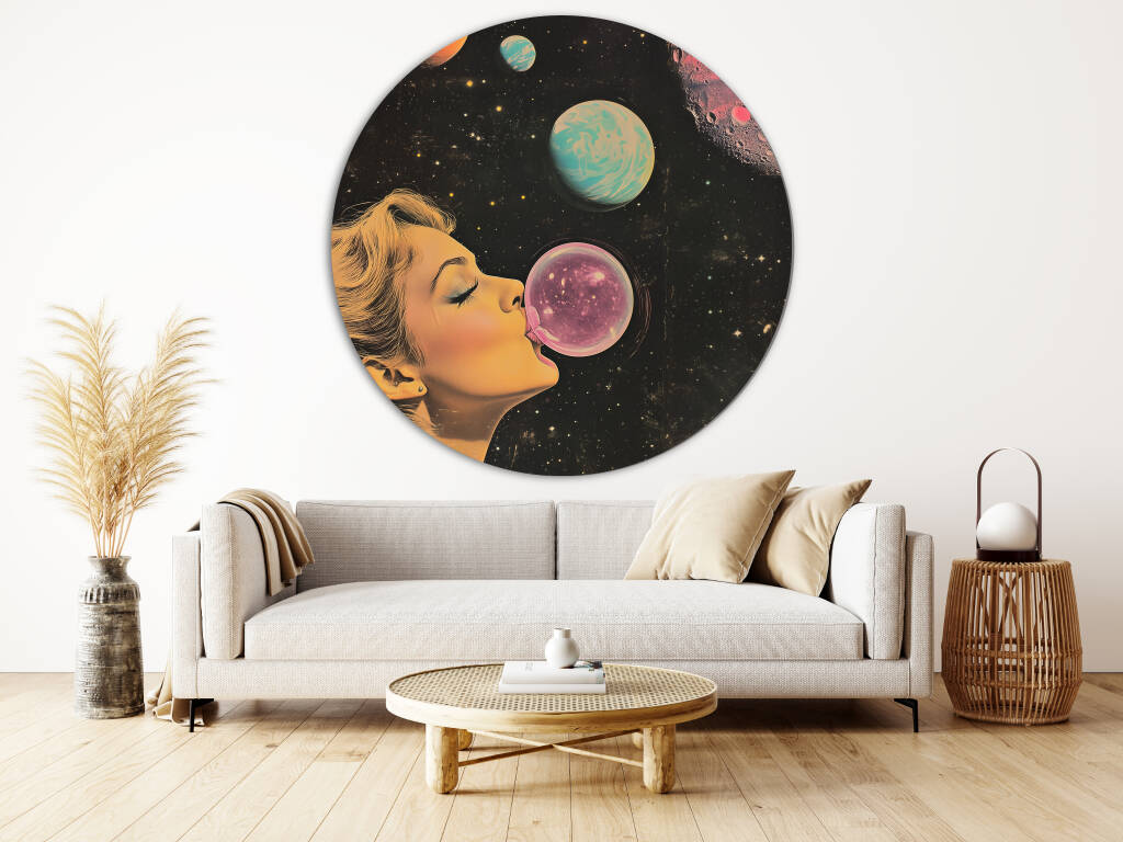 Planet Bubblegum presenteert een speelse kosmische droom waarin een vintage vrouw een roze kauwgombel blaast tussen kleurrijke planeten in de ruimte. De retro-futuristische stijl combineert jaren 50 nostalgie met sci-fi fantasie, waarbij pastelkleuren en sterrenstof een vrolijke twist geven aan het heelal. Dit humoristische kunstwerk nodigt uit tot glimlachen en herinnert ons eraan dat het universum ook een plek voor speelsheid kan zijn. Perfect voor wie houdt van vintage charme met een kosmische knipoog.