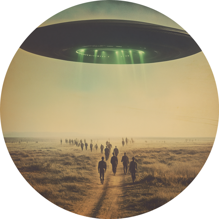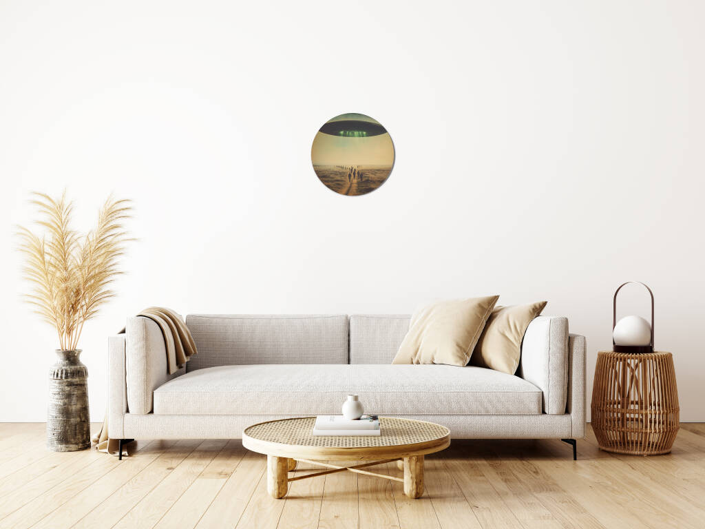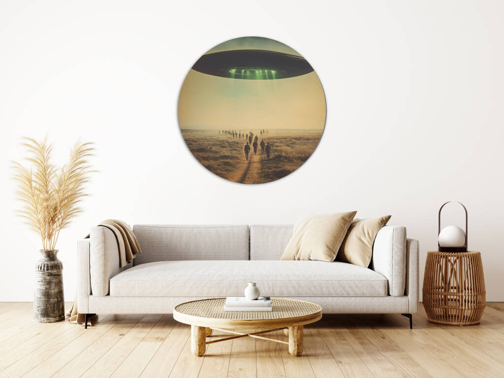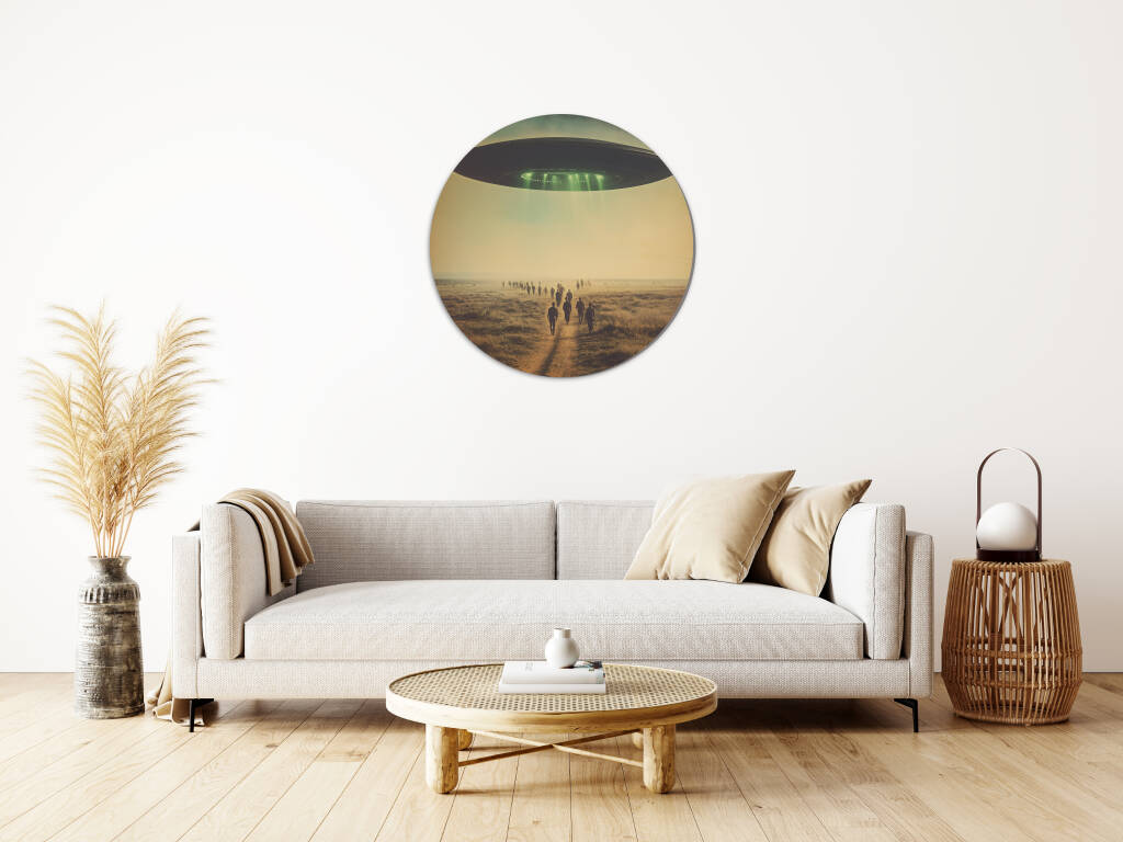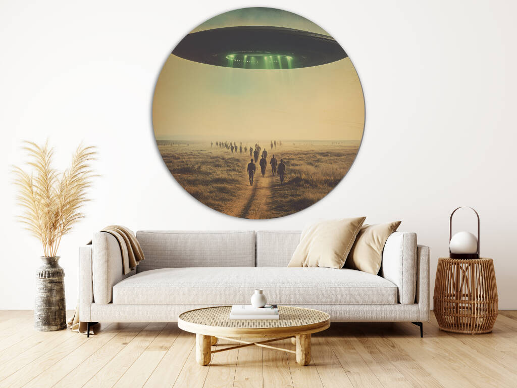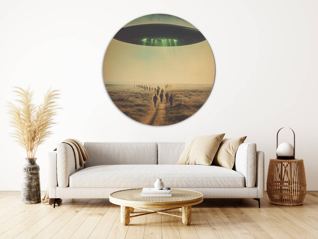 Creëer een mystieke en futuristische sfeer in je interieur met dit unieke kunstwerk getiteld Alien Abduction. Een raadselachtige UFO zweeft boven een stoffige landweg, terwijl een groep silhouetten in de verte een onbekende toekomst tegemoet loopt. Het zachte kleurgebruik en de surrealistische compositie maken dit canvas tot een eyecatcher die intrigeert en discussie uitlokt. Perfect voor liefhebbers van sciencefiction en eigentijdse kunst. Voeg een vleugje mysterie toe aan je ruimte en laat je verbeelding de vrije loop.