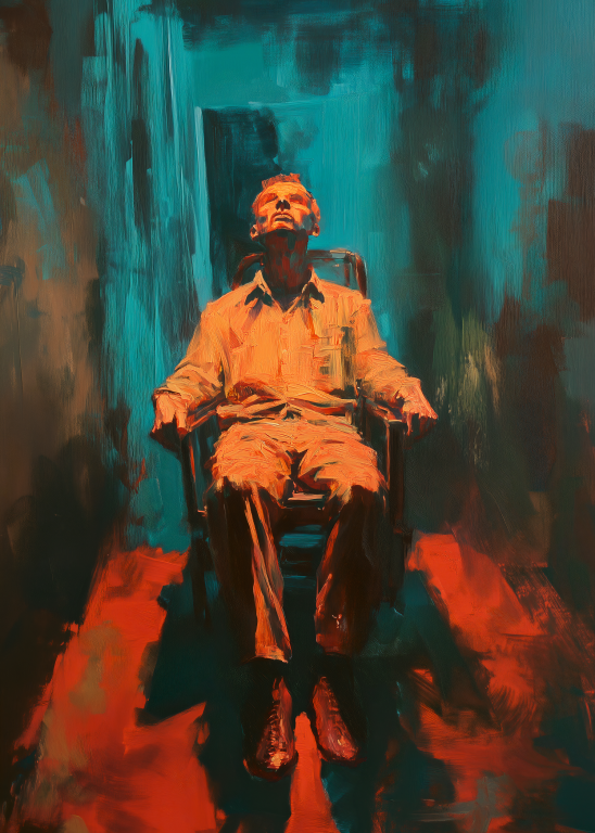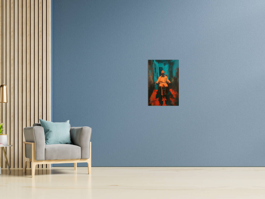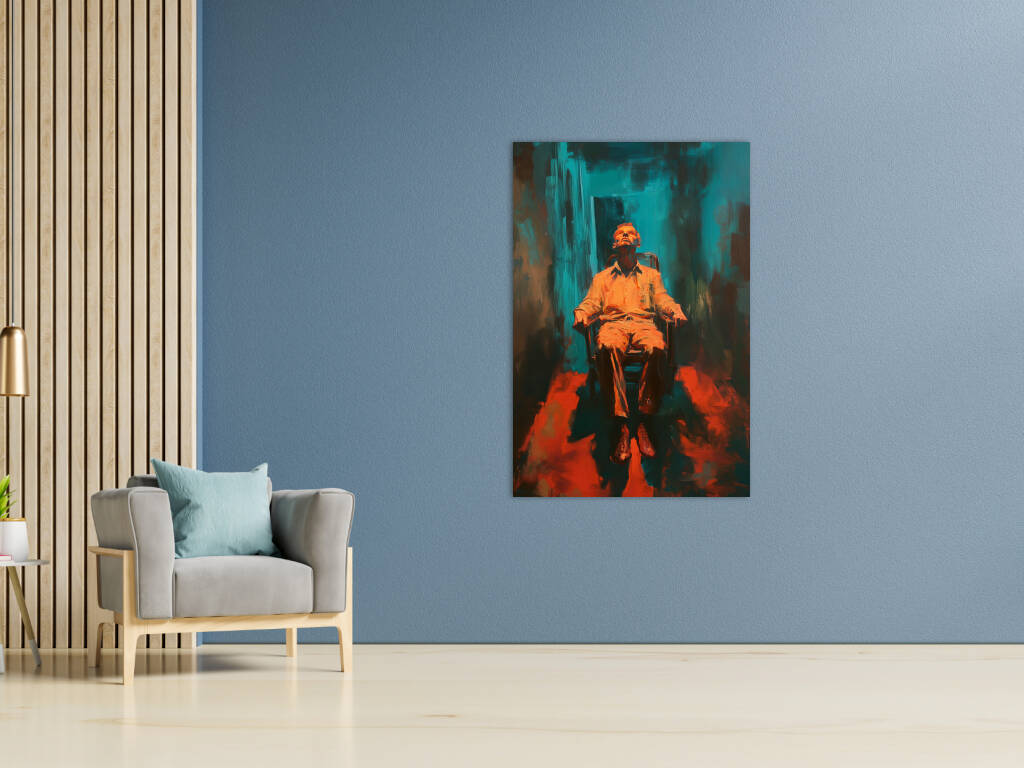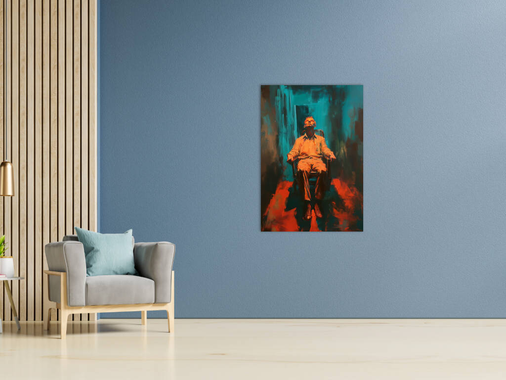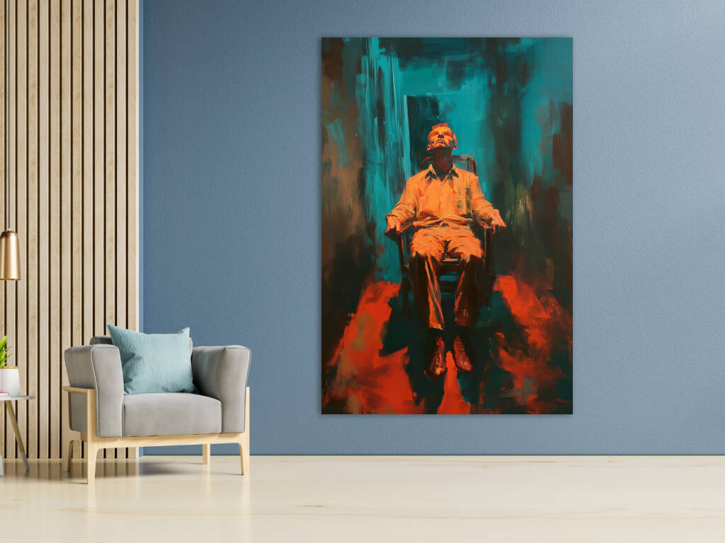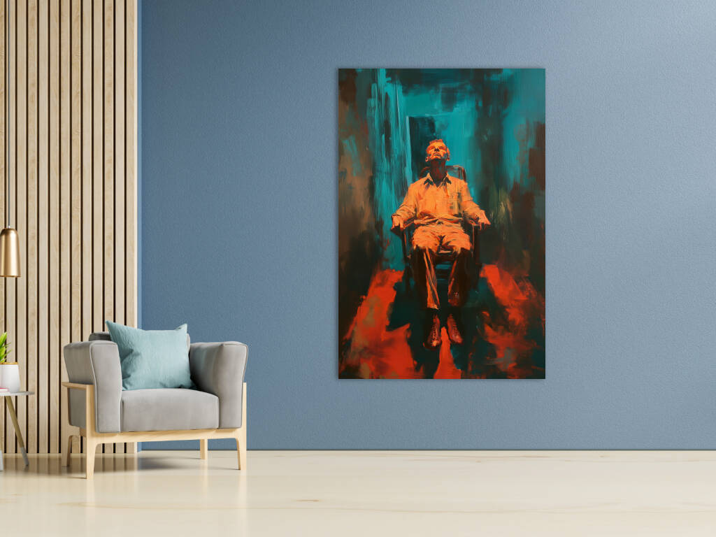 Resting Chair presenteert een intrigerend portret van contemplatie en isolatie. Een figuur rust in een stoel, het hoofd achterover geleund in diepe gedachten of uitputting, badend in warm oranje licht tegen een turquoise achtergrond. De expressieve penseelstreken en het dramatische kleurcontrast creëren een sfeer van emotionele intensiteit. Het werk roept vragen op over de menselijke conditie - is dit een moment van rust of resignatie, van overpeinzing of overgave? De ruwe, abstracte omgeving suggereert een innerlijk landschap eerder dan een fysieke ruimte. Dit kunstwerk verkent de complexiteit van het moderne bestaan, waar momenten van stilte zowel verlossing als confrontatie kunnen betekenen. Een krachtig visueel statement over de noodzaak van reflectie in een chaotische wereld.
