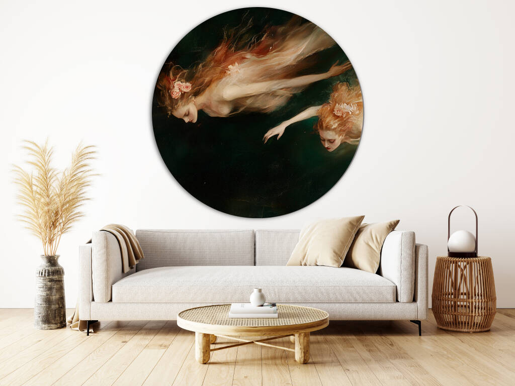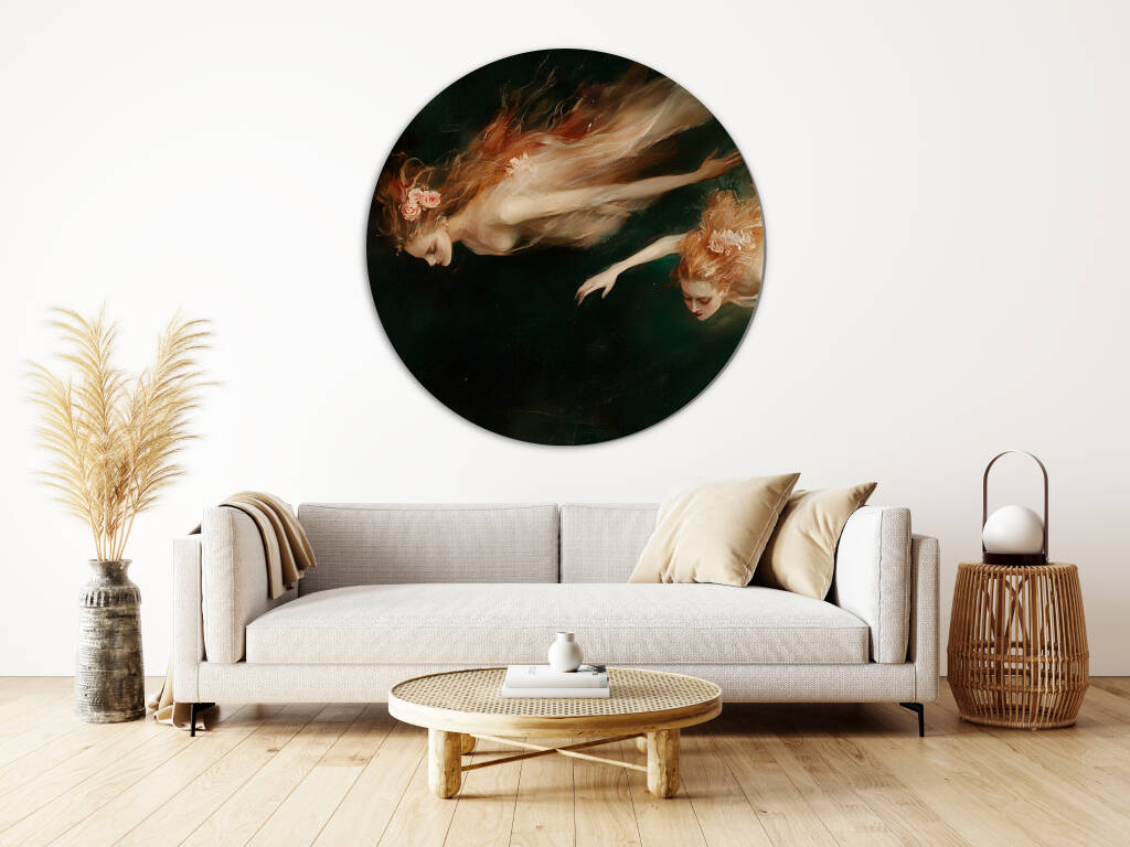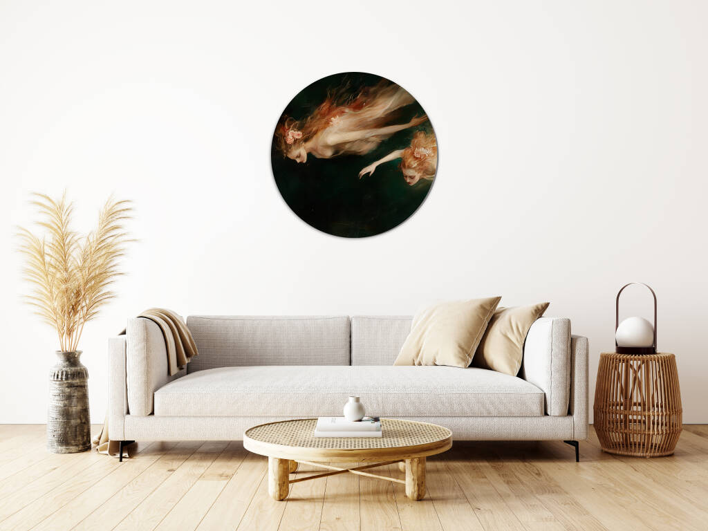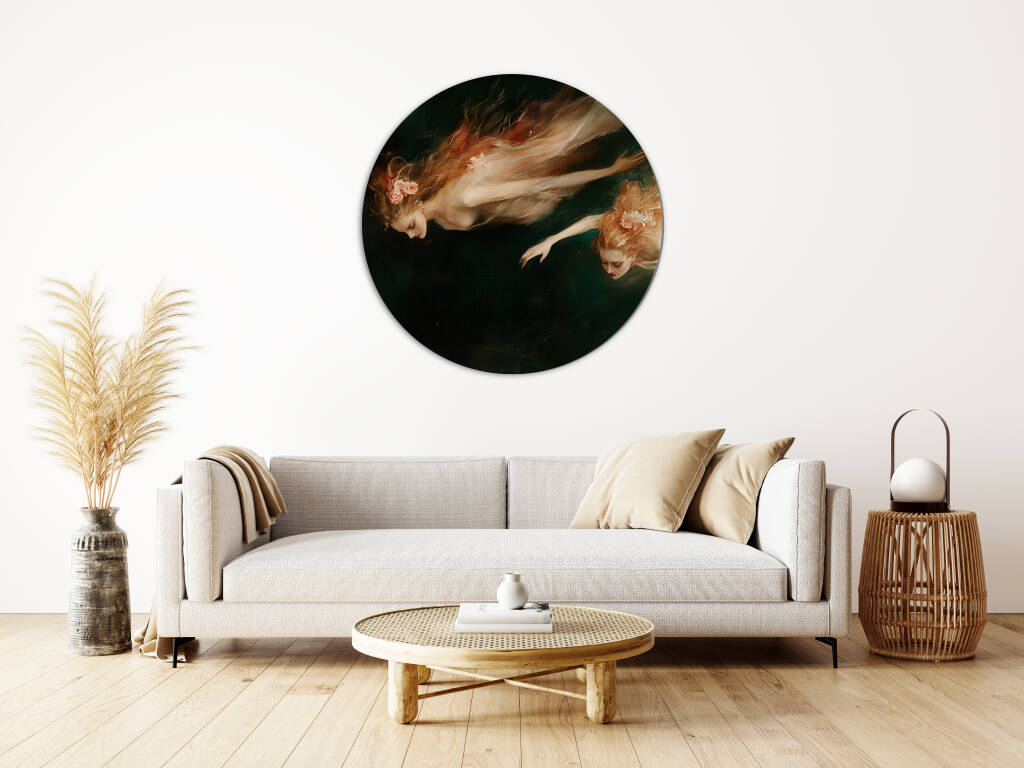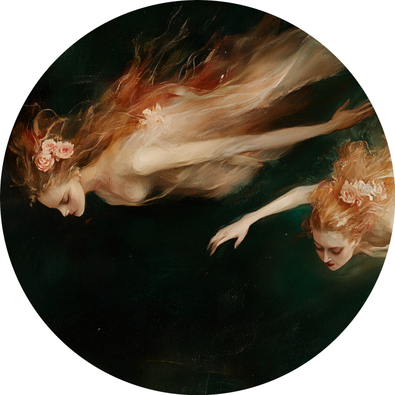 Sirens toont twee etherische zeenimfen die zweven in donkere wateren, hun lichamen gehuld in vloeiende gewaden die dansen als zeewier in de stroming. De klassieke schilderstijl en de mysterieuze sfeer roepen de oude mythologieën tot leven, waar schoonheid en gevaar hand in hand gaan. Dit betoverende kunstwerk vangt de verleidelijke maar gevaarlijke natuur van deze mythische wezens. Perfect voor liefhebbers van klassieke kunst en mythologische verhalen.
