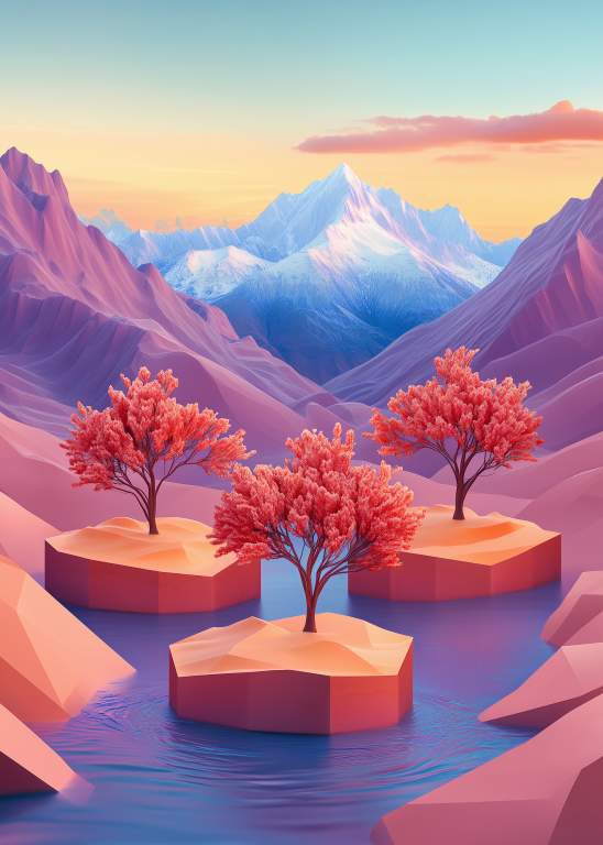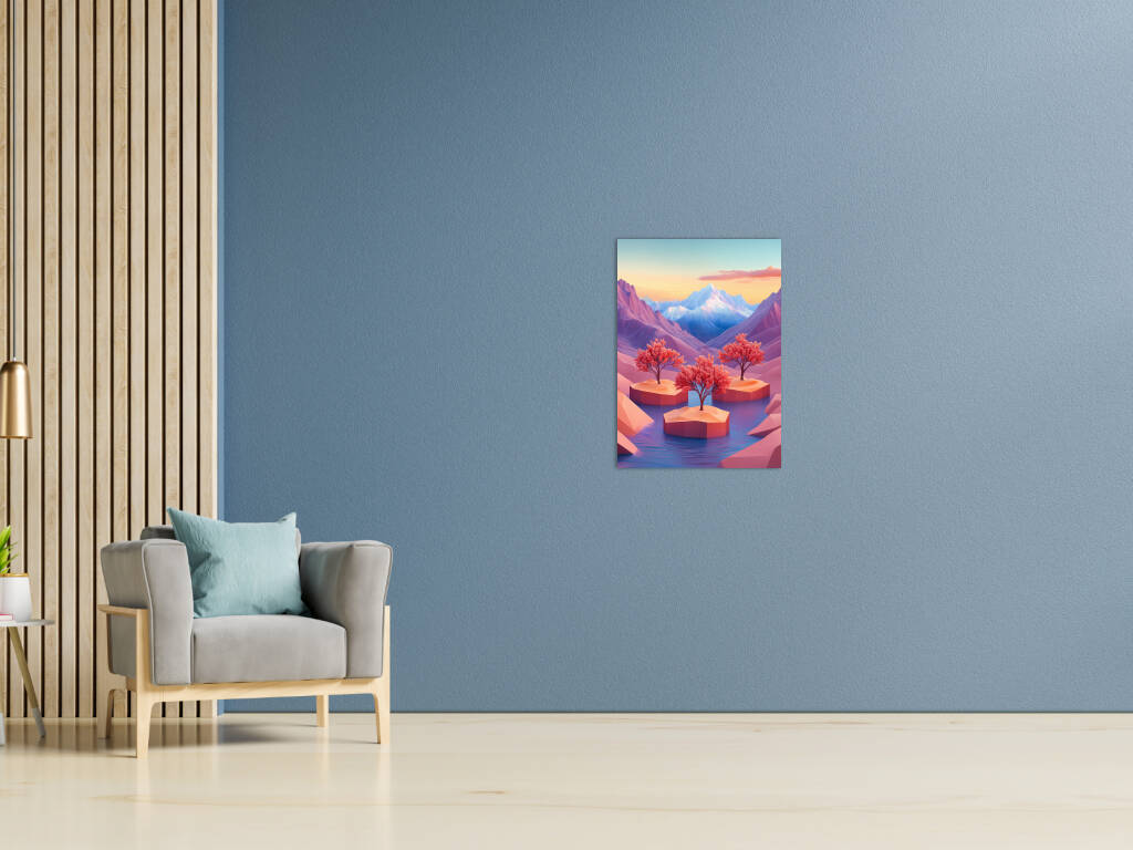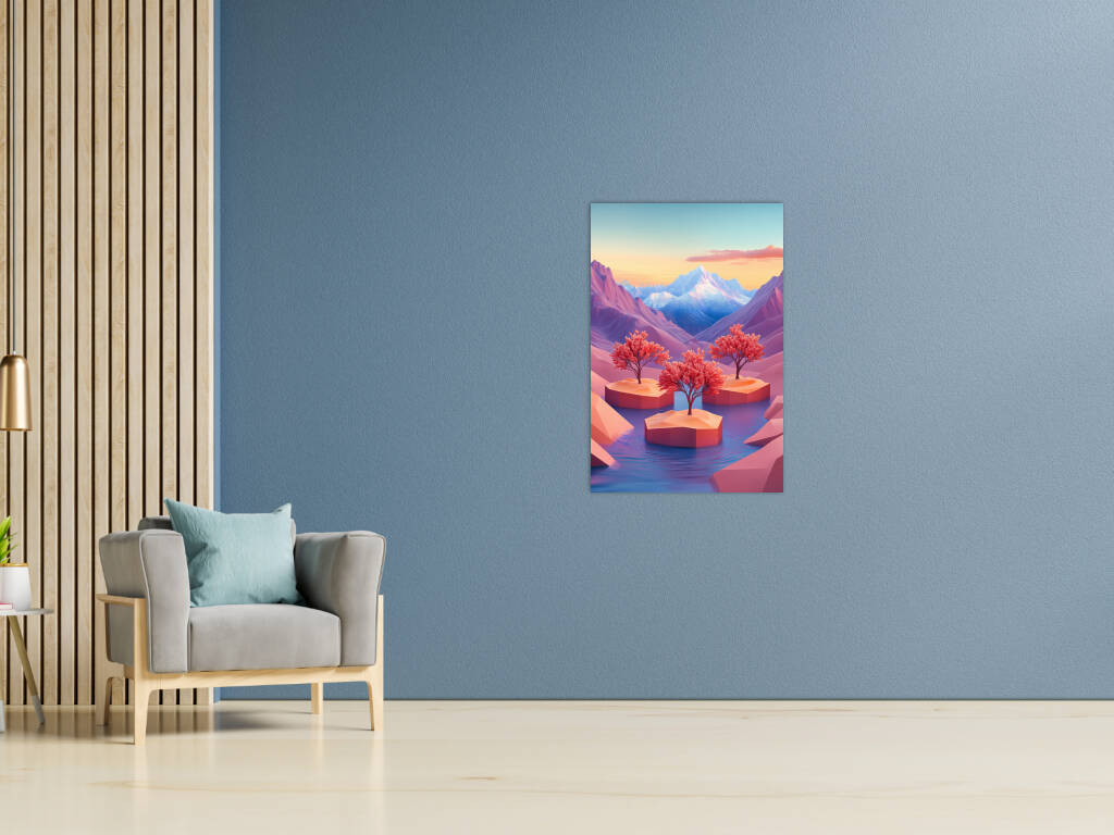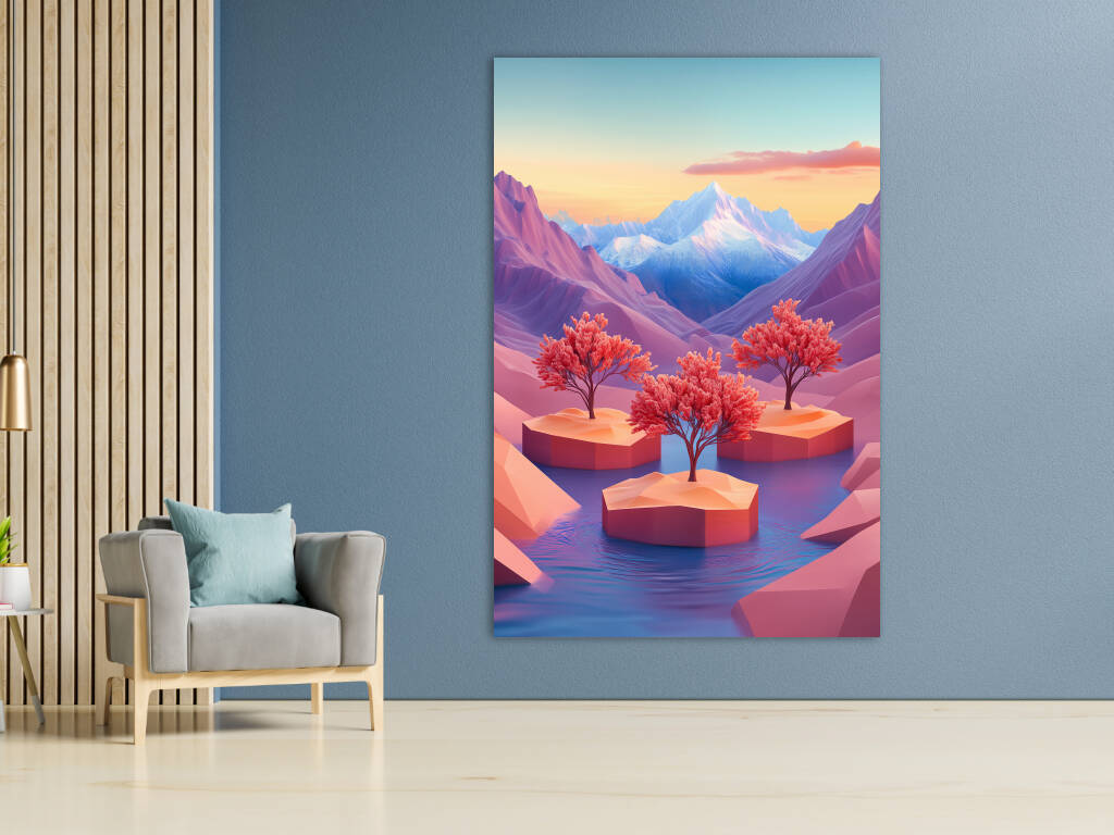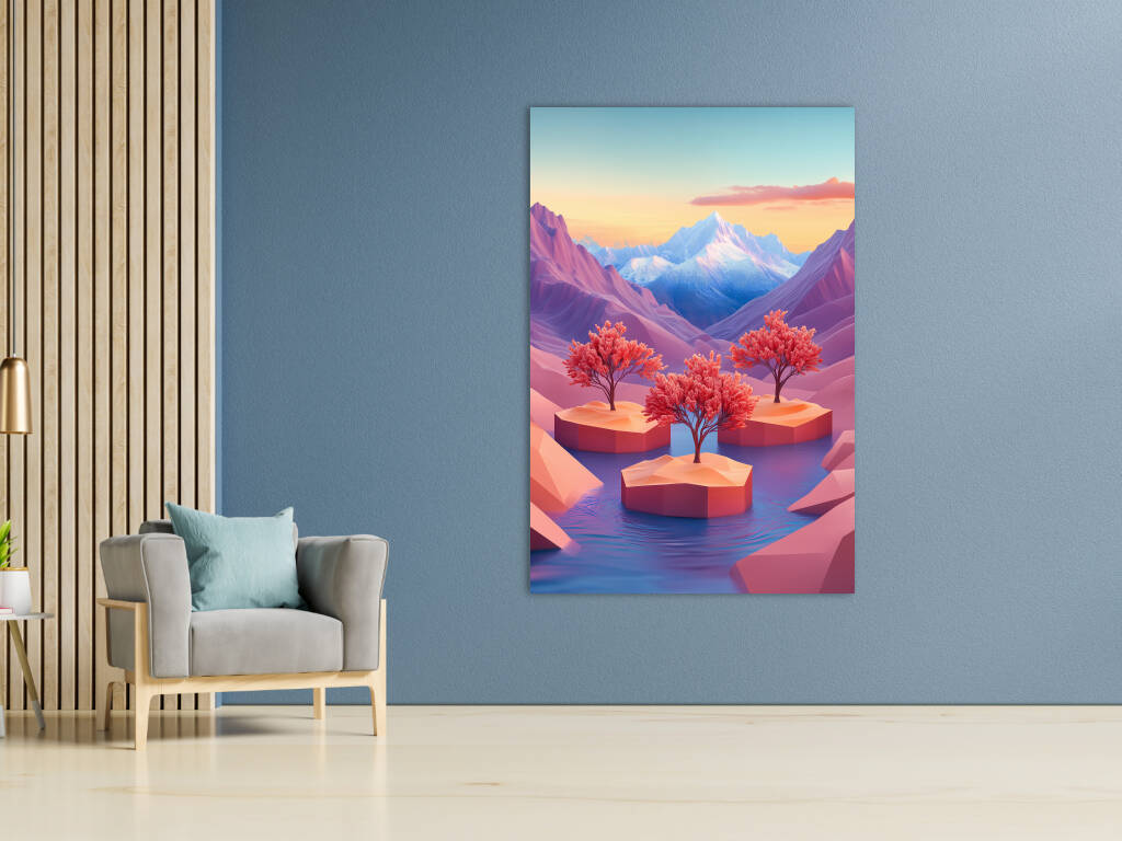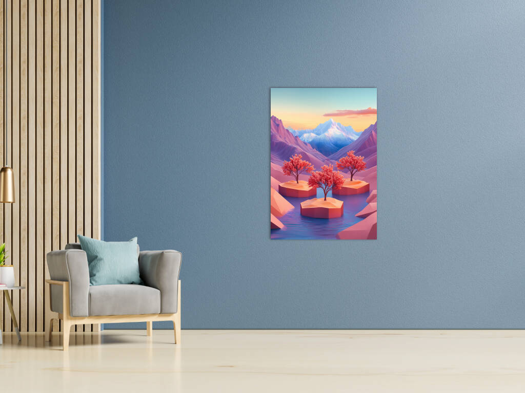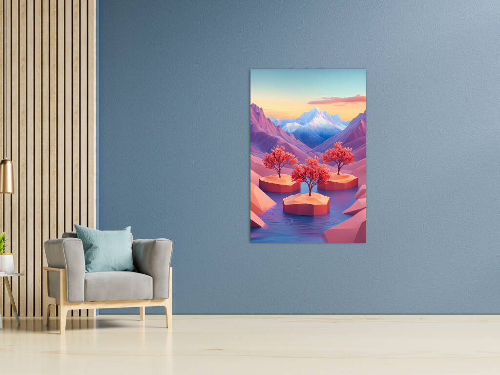 Three Trees toont een surrealistisch berglandschap waar drie prachtige koraalkleurige bomen groeien op geometrische eilandjes in kristalhelder water. De pastelkleuren van roze, blauw en oranje creëren een dromerige atmosfeer waarin natuurlijke schoonheid en abstracte vormgeving samenkomen. Dit fantasierijke landschap straalt sereniteit en creativiteit uit, perfect voor moderne interieurs die verlangen naar een vleugje magie. Een inspirerend kunstwerk dat de verbeelding prikkelt en elke ruimte transformeert.