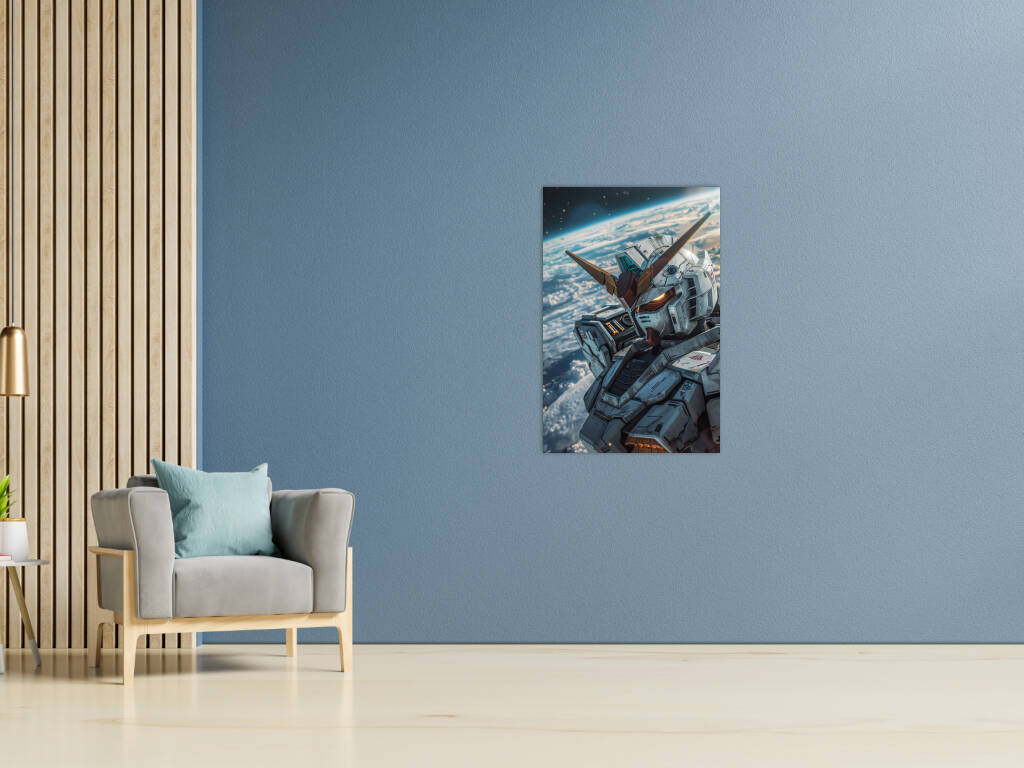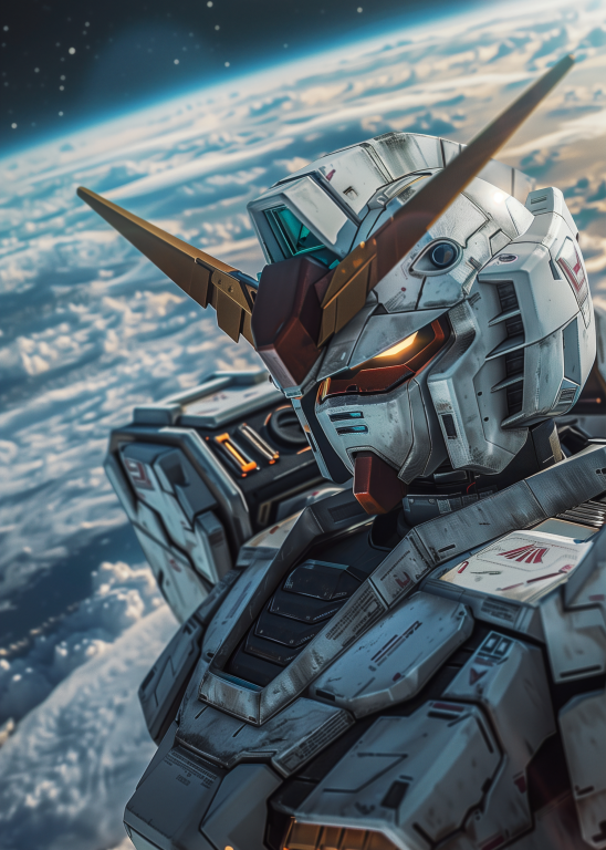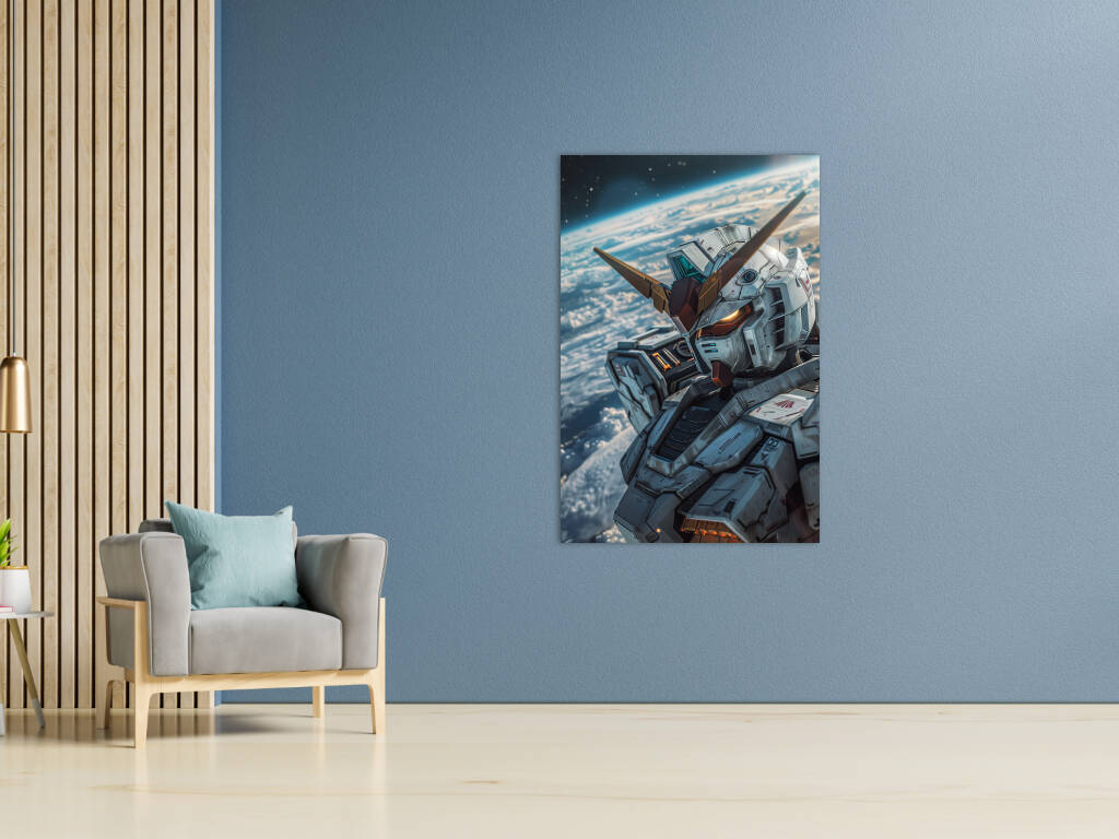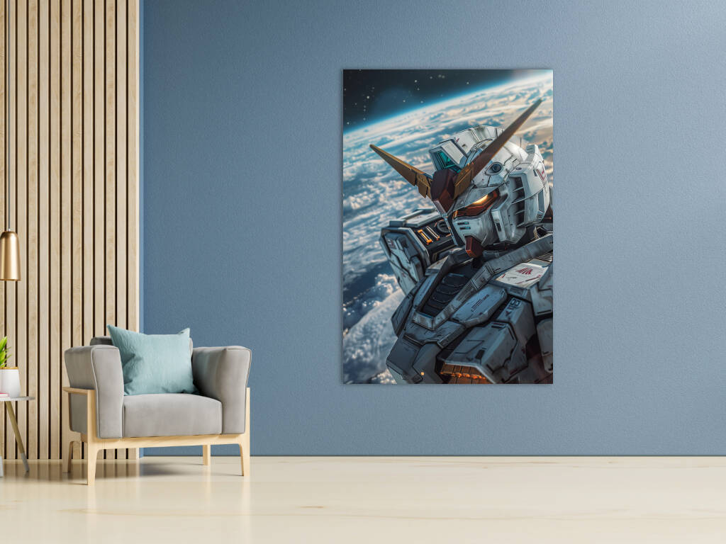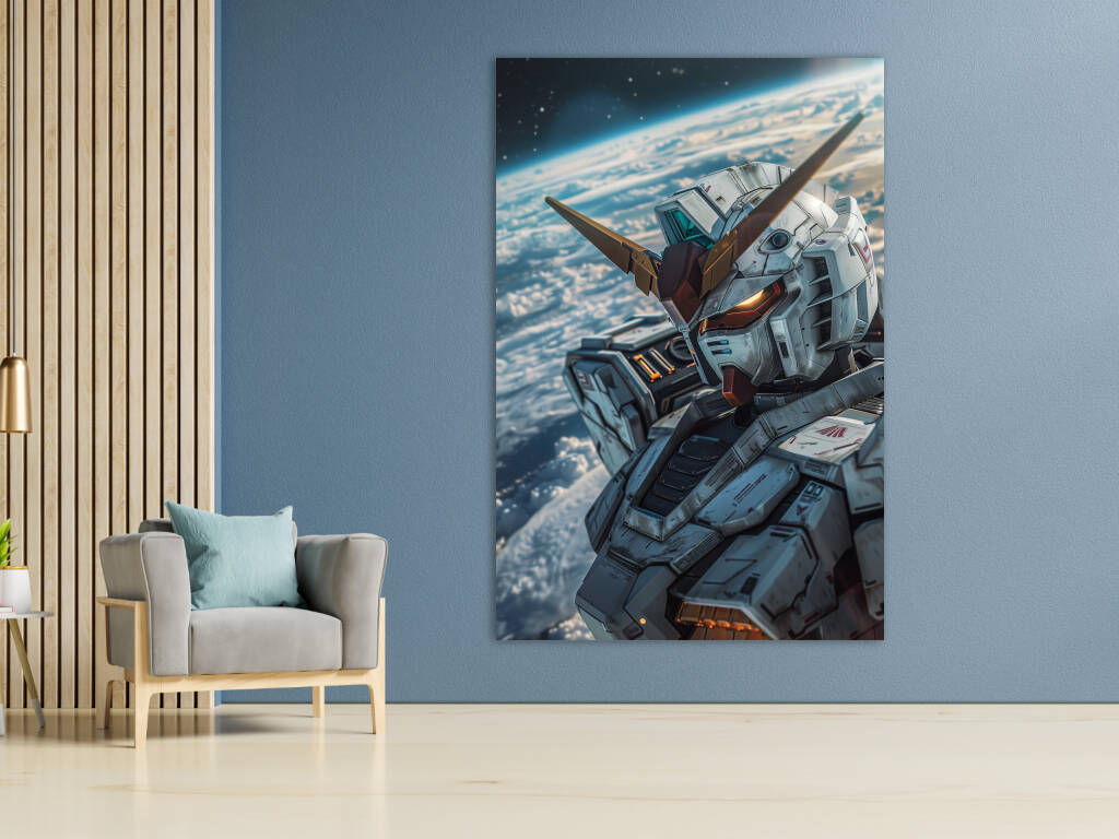 Mobile Suit Gundam Wing toont een imposante mecha die zweeft in de ruimte met de aarde als adembenemend decor op de achtergrond. De gedetailleerde metalen bepantsering, versierd met subtiele rode en goudkleurige accenten, straalt kracht en technologische superioriteit uit. De iconische V-vormige helmantenne en de gloeiende oranje ogen geven de machine een indringende uitstraling. Het spel van licht en schaduw over het robuuste ontwerp benadrukt de realistische texturen en het futuristische karakter van deze krachtige strijdmachine, waardoor het kunstwerk een episch en visionair gevoel oproept.