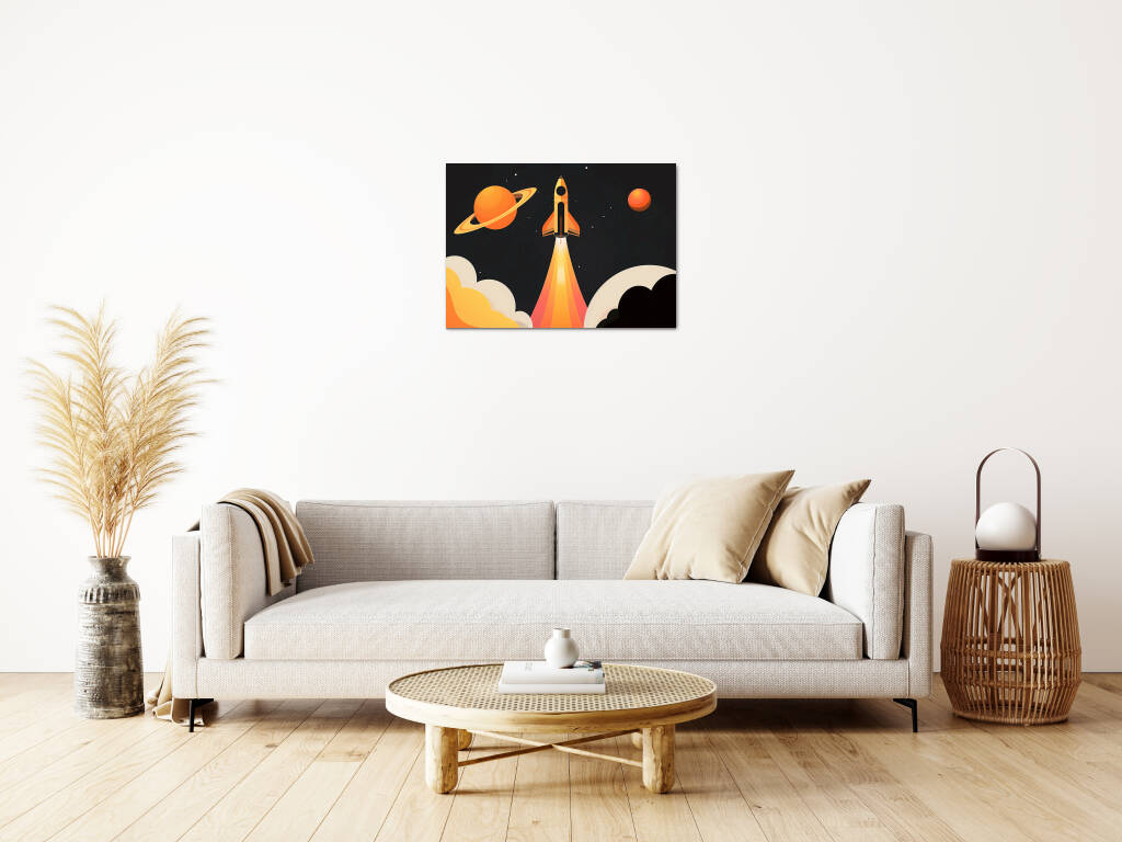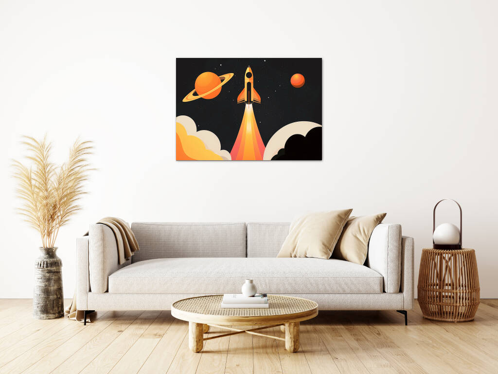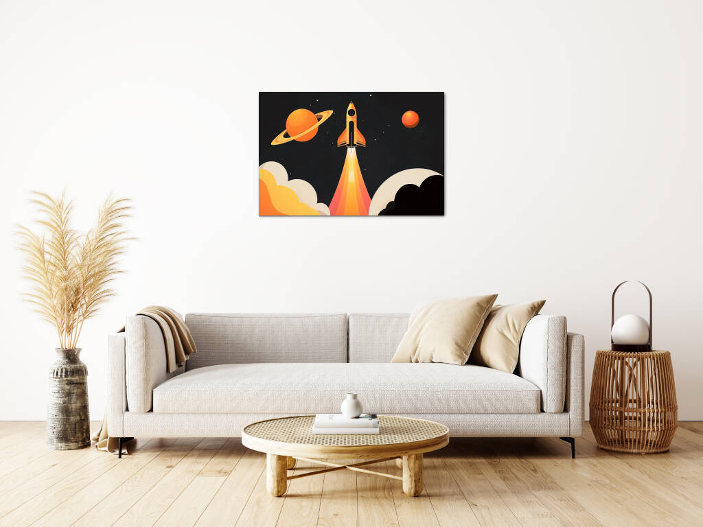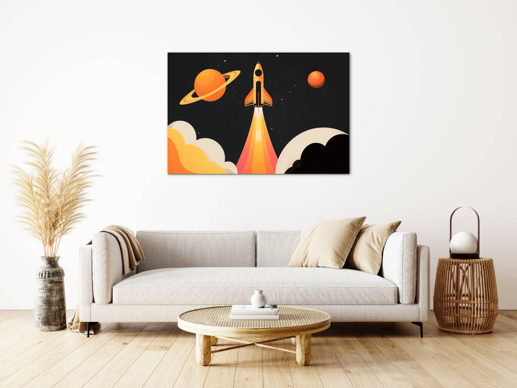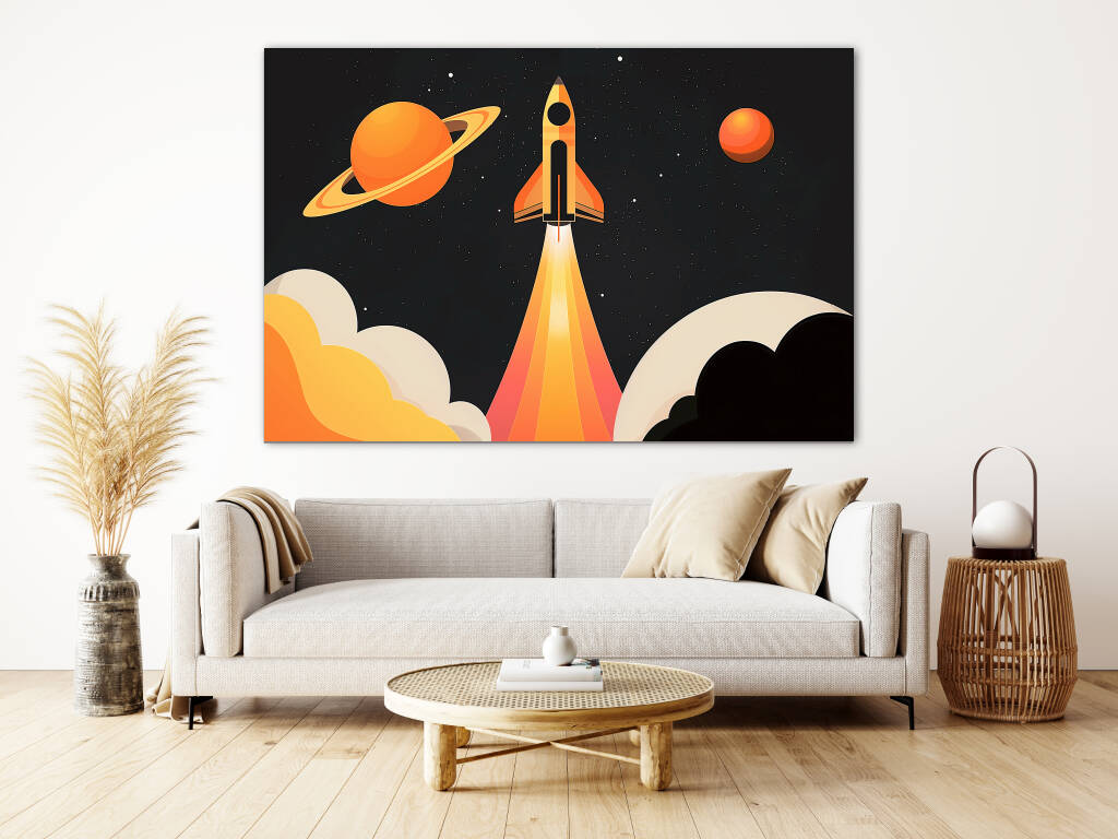 Final Frontier toont een klassieke raket die oprijst door de kosmos, omgeven door planeten, sterren en de oneindige ruimte. De retro-futuristische stijl met warme oranje en gele tinten roept herinneringen op aan de gouden tijd van ruimteverkenning en science fiction. De elegante vormgeving van de raket en de dramatische vlammen die eruit stromen symboliseren menselijke ambitie en de drang om het onbekende te verkennen. Dit inspirerende kunstwerk brengt de magie van ruimtereizen en de droom van verre werelden in je interieur.