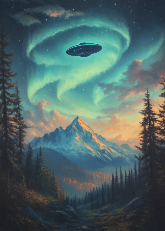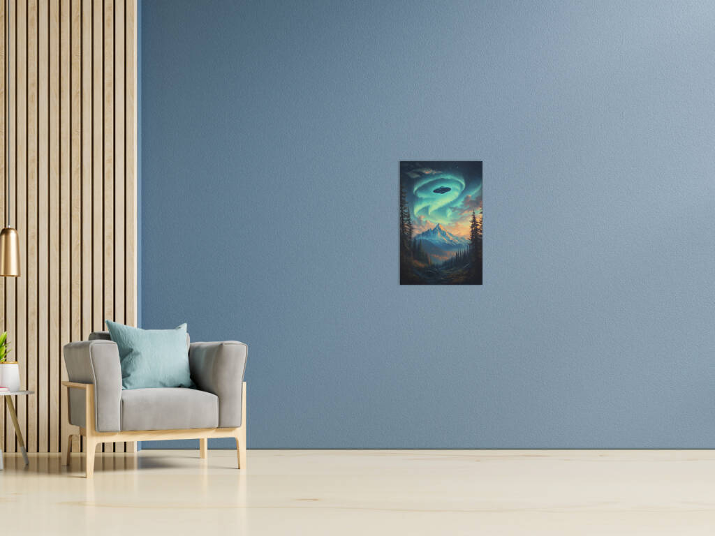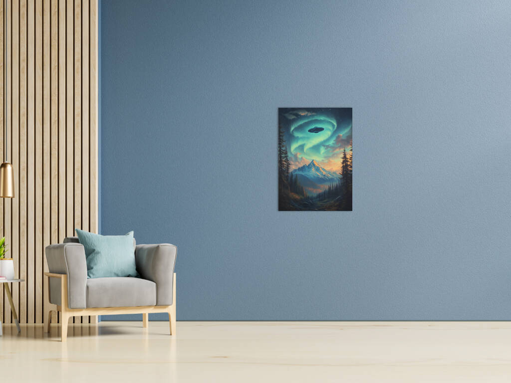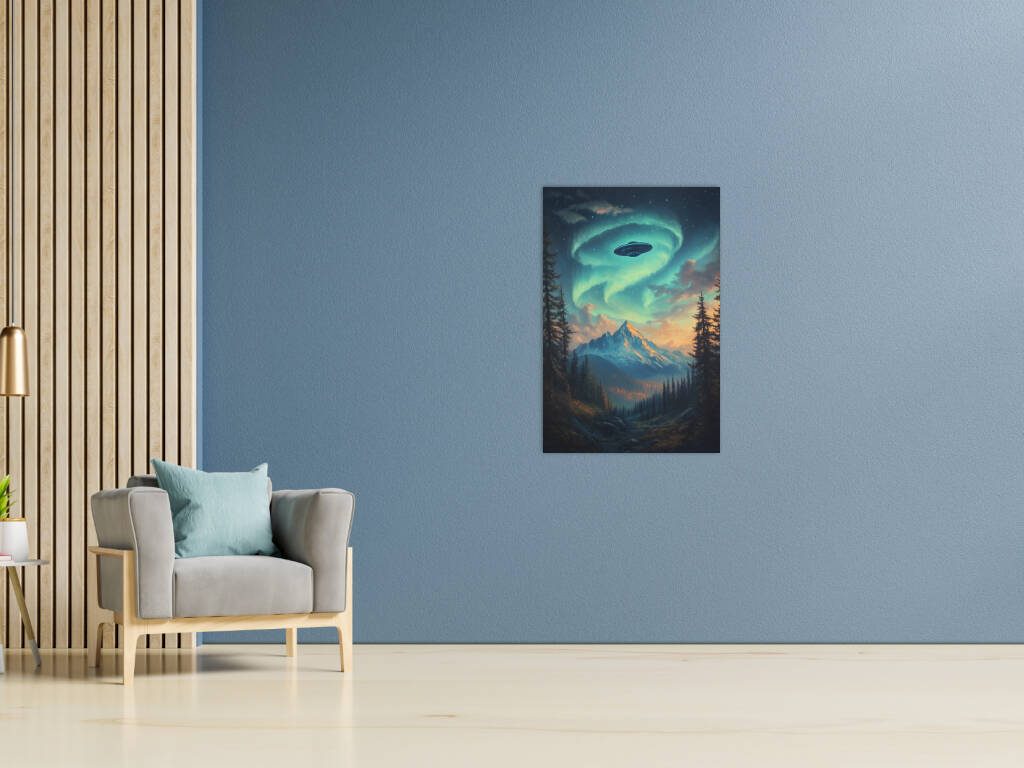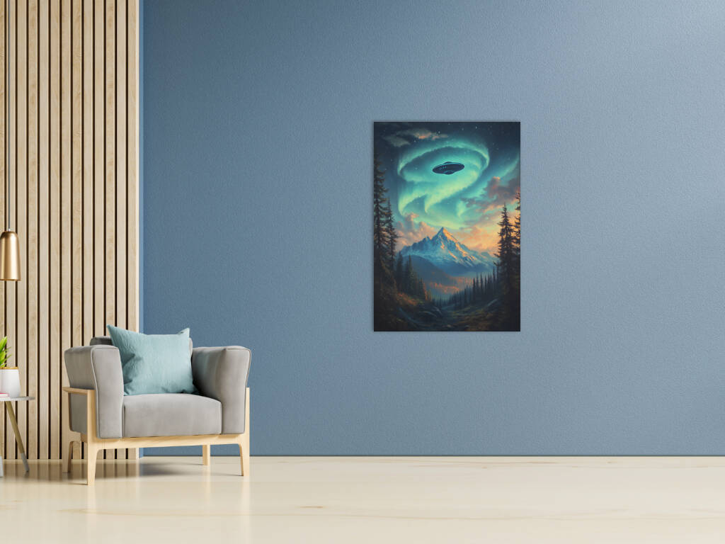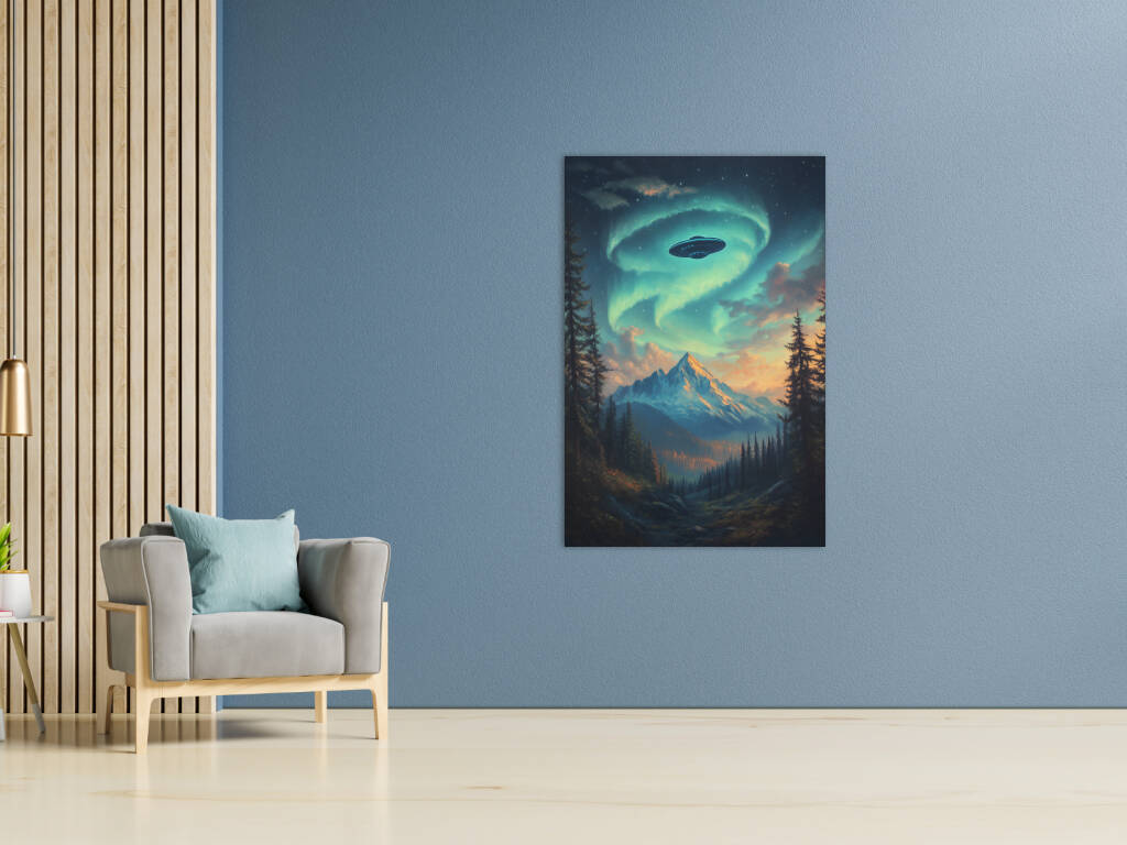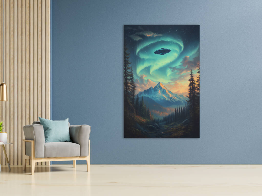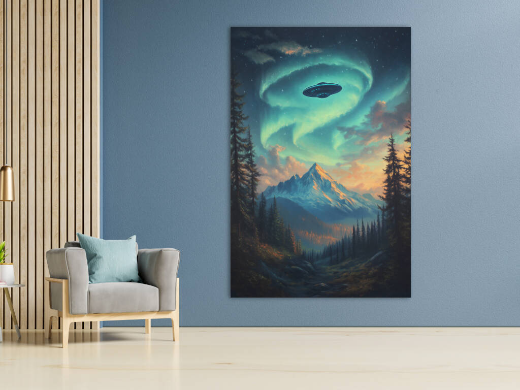 We are out There toont een mysterieus UFO dat zweeft boven een majestueus berglandschap, omringd door spectaculaire groene noorderlichtstralen die de nachtelijke hemel verlichten. Het contrast tussen de serene natuurlijke schoonheid en het buitenaardse fenomeen creëert een fascinerende spanning tussen bekend en onbekend. Dit betoverende sci-fi landschap prikkelt de verbeelding en nodigt uit tot dromen over de oneindige mogelijkheden van het universum. Perfect voor liefhebbers van mysterie en kosmische avonturen.