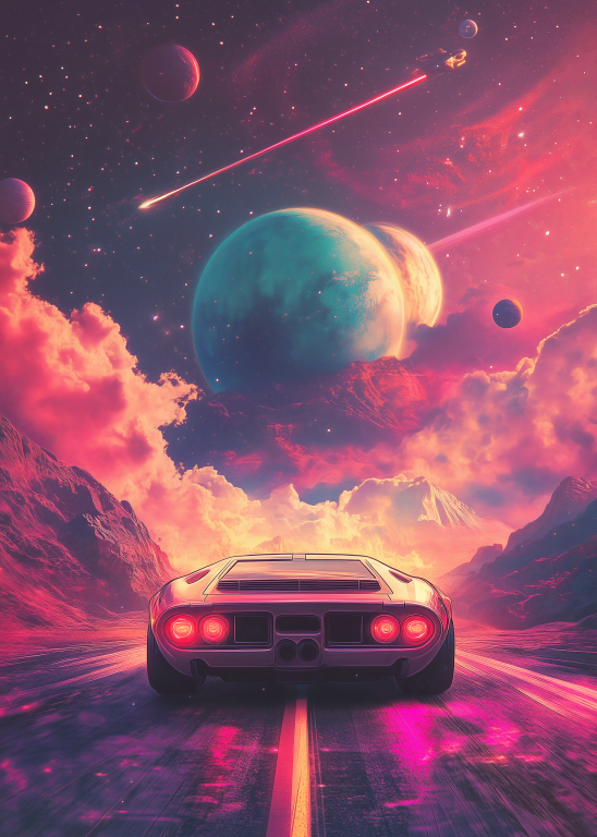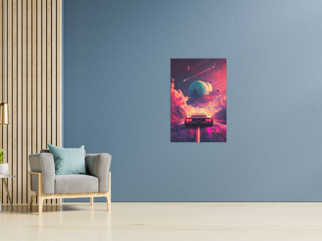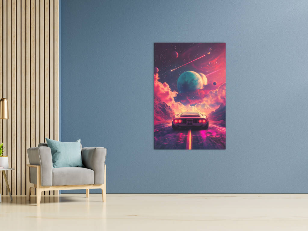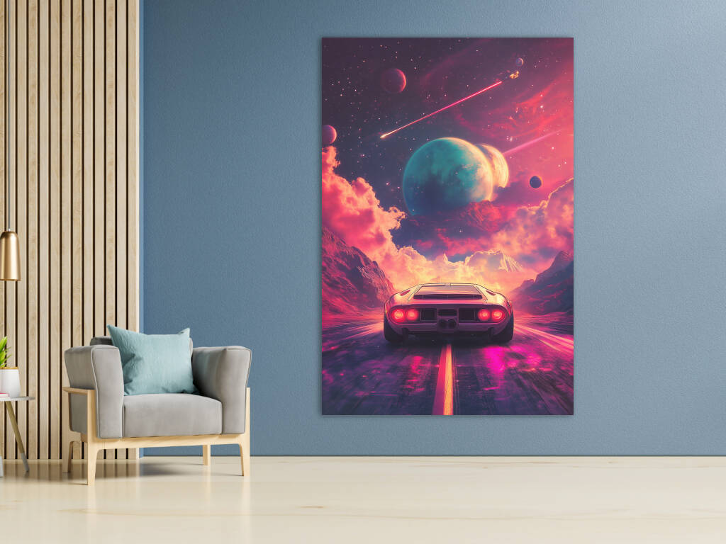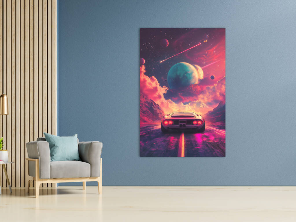 Road to Space neemt je mee op een epische reis waar een sportauto over een kosmische snelweg racet richting verre planeten en sterrennevels. De vurige roze en paarse tinten van de galactische hemel creëren een adembenemend decor voor dit futuristische avontuur. Dit spectaculaire kunstwerk combineert retro-wave esthetiek met science fiction fantasie op een manier die zowel nostalgisch als toekomstgericht is. Perfect voor dromerige zielen die verlangen naar grenzeloze mogelijkheden en kosmische avonturen.