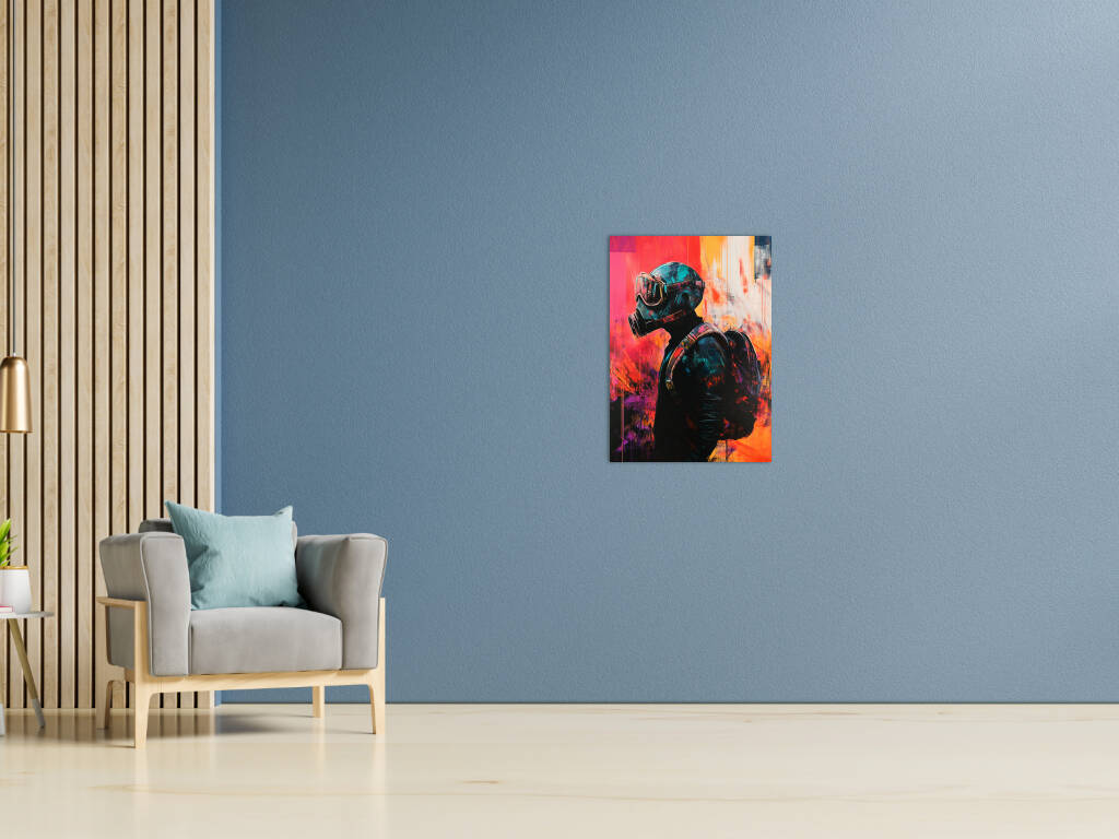 Pandemic presenteert een krachtige artistieke interpretatie van onze moderne tijd waarin een figuur met gasmasker wordt omgeven door expressieve verfstreken in levendige oranje, rode en blauwe tinten. De grunge-achtige texturen en de abstracte kleurvlakken creëren een gevoel van chaos en verandering, terwijl de centrale figuur stoicisme en doorzettingsvermogen uitstraalt. De street art-esthetiek en de rauwe energie van het kunstwerk maken het tot een krachtige sociale commentaar. Dit provocerende kunstwerk brengt de complexiteit van onze tijd tot uiting en nodigt uit tot reflectie over veerkracht en aanpassing.