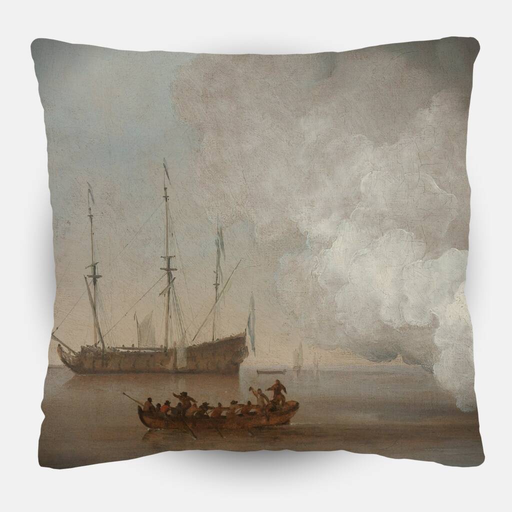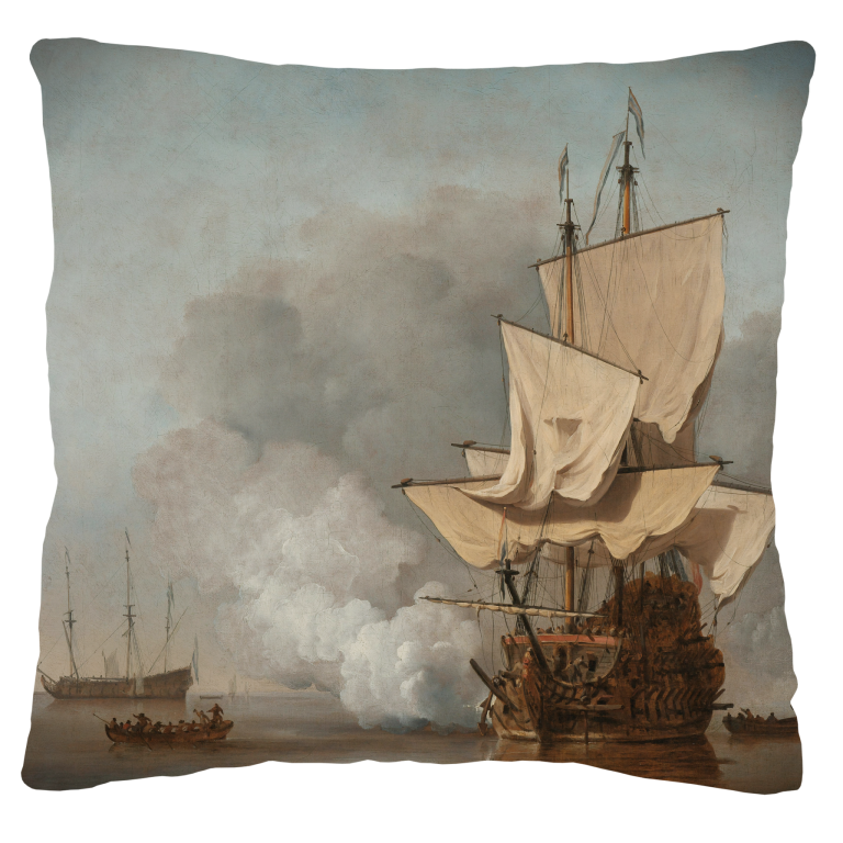 Het Kanonschot vangt een dramatisch moment uit de Nederlandse maritieme geschiedenis waarbij zeilschepen hun kracht tonen op de woelige zee. De imposante oorlogsschepen met hun bollende zeilen domineren de compositie, terwijl rookwolken en de bewolkte hemel de spanning van de scène versterken. De meesterlijke weergave van water, wind en de majesteitelijke schepen toont de technische perfectie van de Gouden Eeuw schilderkunst. Dit historische kunstwerk brengt de grandeur van de Nederlandse zeemacht en de dramatiek van de zeeslag direct in je leefruimte.
