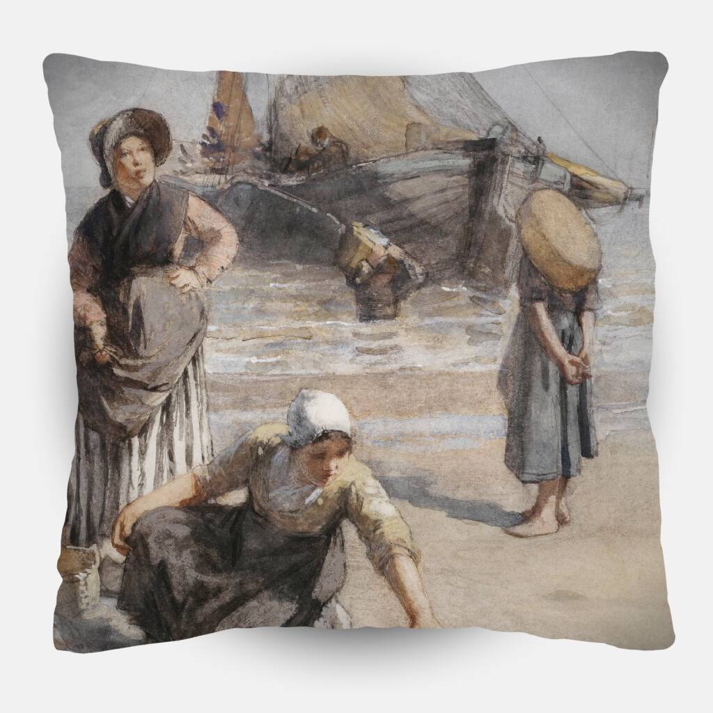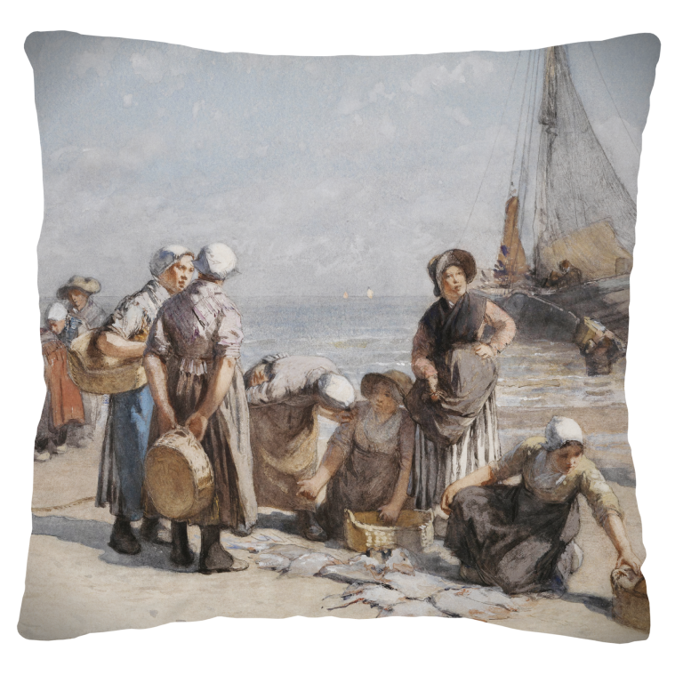 Vissersvrouwen op het Scheveningse Strand geeft een ontroerend beeld van het dagelijks leven in een 19e-eeuws vissersdorp. De vrouwen, gekleed in traditionele klederdracht, wachten op het strand terwijl de vissersboot nadert. Hun gebogen houding en samengedromde vormen spreken van de zorgen en het harde bestaan van de vissersgemeenschap. Het gedempte kleurenpalet van grijzen en bruinen weerspiegelt het ruwe karakter van het kustleven, terwijl de bewolkte hemel de onzekerheid van hun bestaan symboliseert. Dit werk documenteert niet alleen een verdwenen manier van leven, maar toont ook de kracht en veerkracht van deze vrouwen die de ruggengraat vormden van de vissersgemeenschappen. Een sociaal document dat de menselijke waardigheid viert te midden van de dagelijkse strijd om het bestaan.