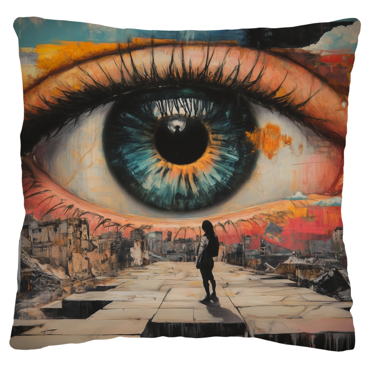 Dit intrigerend design toont een gigantisch oog dat majestueus uitkijkt over een verwoest landschap. Het oog, levendig in kleuren met een intens blauwe iris en goudgele details, symboliseert wellicht bewustzijn of een hogere macht. Op de voorgrond staat een silhouetfiguur op een vervallen pad, wat een gevoel van introspectie en betekenis zoekt in een wereld van chaos. De combinatie van surrealistische en post-apocalyptische elementen creëert een krachtig visueel verhaal dat uitnodigt tot interpretatie en reflectie.