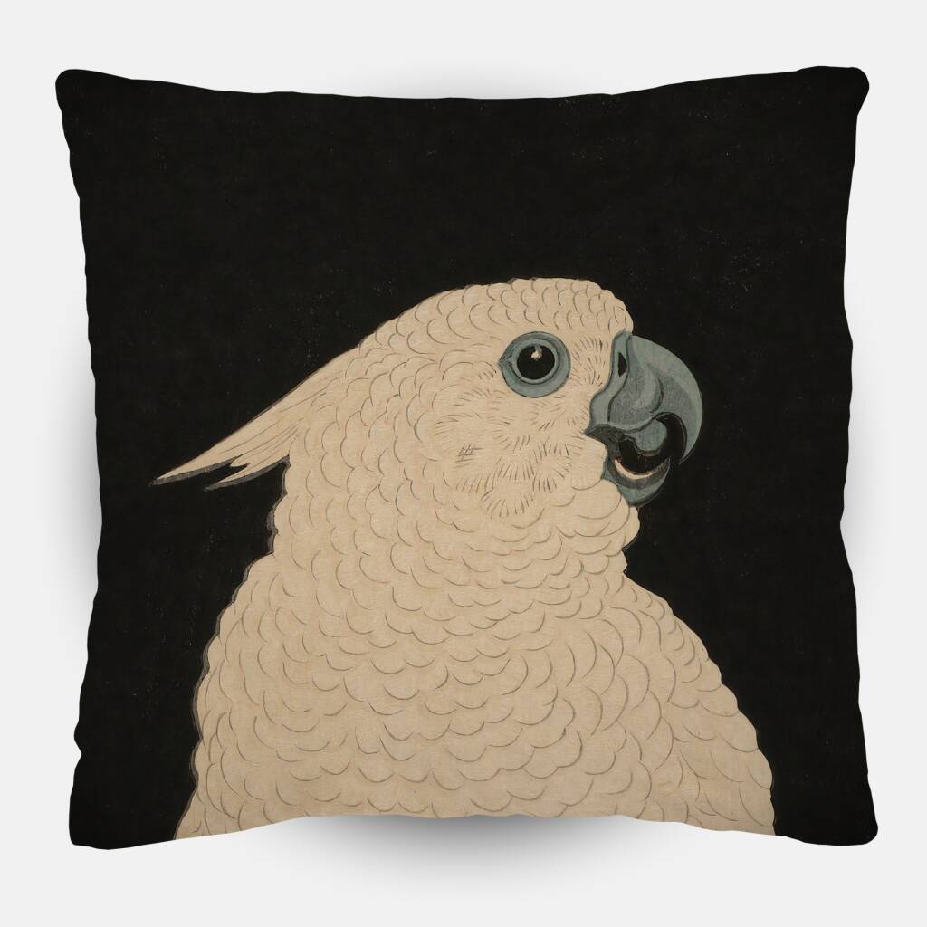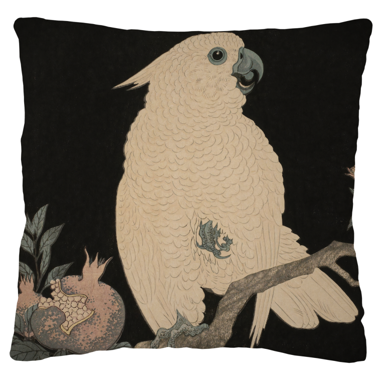 Kaketoe met Granaatappel is een verfijnde natuurstudie in de traditie van de Japanse houtsnijkunst. De majestueuze witte kaketoe, getooid met zijn karakteristieke kuif, zit waardig op een tak naast rijpe granaatappels. Het contrast tussen het zachte, gedetailleerde verenkleed van de vogel en de donkere achtergrond creëert een dramatisch effect dat de aandacht direct naar het onderwerp trekt. De subtiele texturen van de veren, de delicate bladeren en de gebarsten schil van de granaatappel getuigen van meesterlijk vakmanschap. Dit werk combineert exotische schoonheid met symbolische diepgang - de granaatappel staat voor vruchtbaarheid en overvloed, terwijl de kaketoe wijsheid en loyaliteit vertegenwoordigt. Een tijdloos kunstwerk dat Oosterse esthetiek en natuurlijke elegantie verenigt.