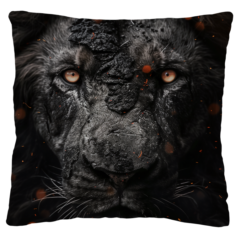 Een krachtig portret van een imposante leeuw, waarbij de intense blik direct de aandacht grijpt. De donkere, textuurrijke details en vurige oranje accenten creëren een dramatisch contrast, wat dit kunstwerk een gedurfde uitstraling geeft. Ideaal voor wie op zoek is naar een statement piece dat kracht en mysterie toevoegt aan elke ruimte, zoals een moderne woonkamer of thuiskantoor. Perfect om een uniek, wild randje aan je interieur te geven.