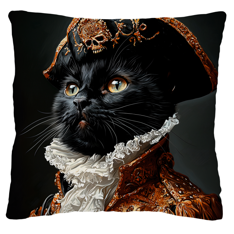 Captain Kitty Cat transformeert een schattige zwarte kat tot een majestueuze piratenkapitein uit vervlogen tijden. De elegante kat draagt een rijk versierd kostuum compleet met gouden details, een driehoekige piratenoed en witte kanten manchetten. De donkere achtergrond benadrukt de warme ogen en de fluweelzachte vacht, terwijl de luxueuze kostuumdetails zorgen voor een humoristische en tegelijkertijd verfijnde uitstraling. Dit charmante kunstwerk combineert fantasie met klassieke portraitschilderkunst.