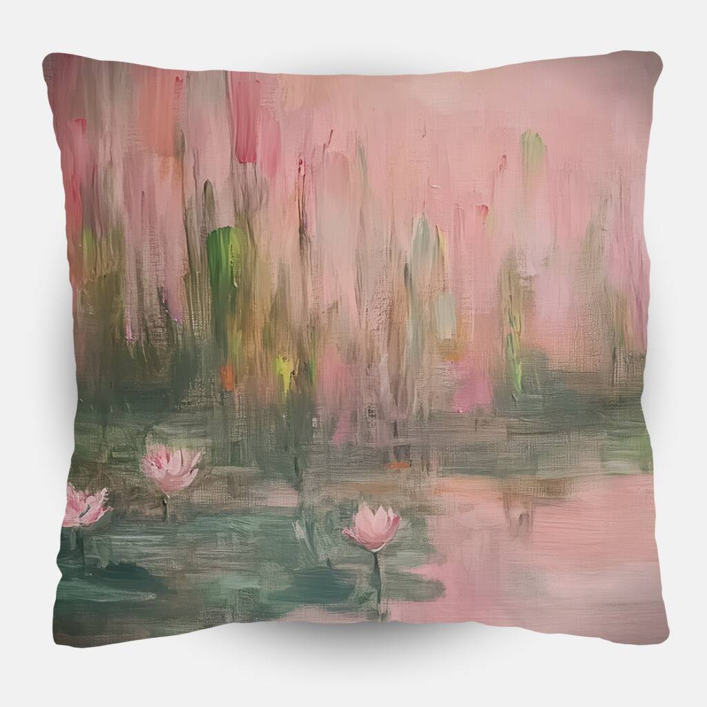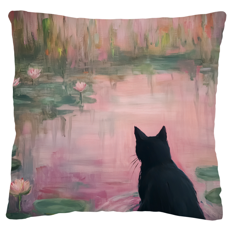 Swamp Cat toont een mysterieus moment van contemplatie in een dromerig moeraslandschap. Een zwarte kat zit stil aan de waterkant, zijn silhouet scherp afgetekend tegen de zachte roze en groene tinten van het moeras. Waterlelies drijven sereen op het oppervlak, terwijl de impressionistische penseelstreken een etherische sfeer creëren. Het werk balanceert tussen realisme en abstractie, waarbij de kat het enige concrete element vormt in een wereld van vloeiende kleuren en vormen. De pastelachtige palette roept een gevoel op van rust en verwondering, alsof we getuige zijn van een geheim moment in de natuur. Dit kunstwerk nodigt uit tot mijmering over de verborgen werelden die bestaan aan de randen van onze waarneming.