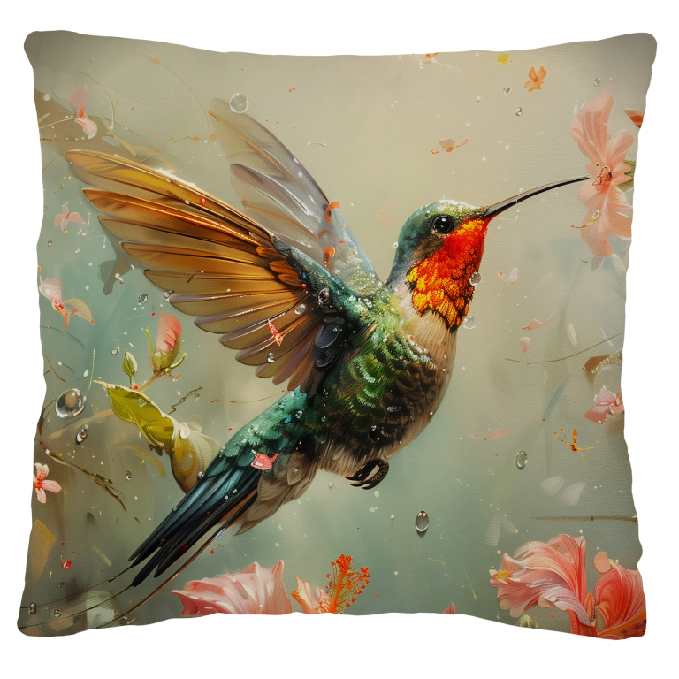 Hungry Hummingbird vangt het betoverende moment waarop een kolibrie, met zijn iriserende groene en oranje verenkleed, elegant in de lucht zweeft terwijl hij zich voedt met de nectar van felgekleurde hibiscusbloemen. De dynamiek van zijn gespreide vleugels en de vallende dauwdruppels versterken de levendigheid van het tafereel. De zachte, dromerige achtergrond contrasteert prachtig met de gedetailleerde bloemen en het delicate silhouet van de vogel, waardoor een harmonieuze compositie ontstaat die de schoonheid en fragiliteit van de natuur weerspiegelt.