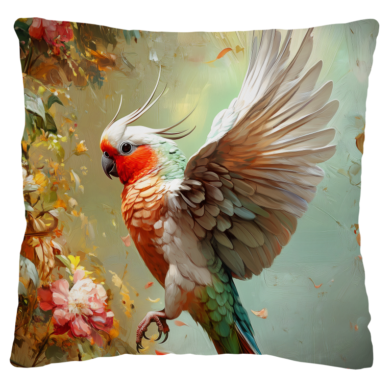 Een dromerige en levendige stijl, met een combinatie van realisme en een vleugje fantasie. De kaketoe is gedetailleerd uitgewerkt, met een prachtig palet van warme kleuren zoals oranjerood, zachtgroen en ivoorwit. De achtergrond bestaat uit een impressionistische mix van bloemen en bladeren, met delicate penseelstreken en een licht wazig effect, wat een magische sfeer creëert. De compositie straalt elegantie en beweging uit, dankzij de dynamische houding van de vogel en de vallende bloemblaadjes. Dit kunstwerk ademt sierlijkheid en natuurlijke harmonie uit.