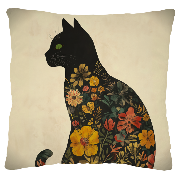 Flower Loving Cat toont een elegante zwarte kat waarvan het silhouet gevuld is met een weelderige bloementuin in warme herfstkleuren. De delicate bloemen in tinten van geel, oranje en oker creëren een prachtig contrast met de donkere kattencontouren. Dit poëtische kunstwerk combineert de mystiek van katten met de schoonheid van botanische kunst op een unieke en betoverende manier. Perfect voor kattenliefhebbers die ook een zwak hebben voor bloemenkunst en decoratieve elegantie.