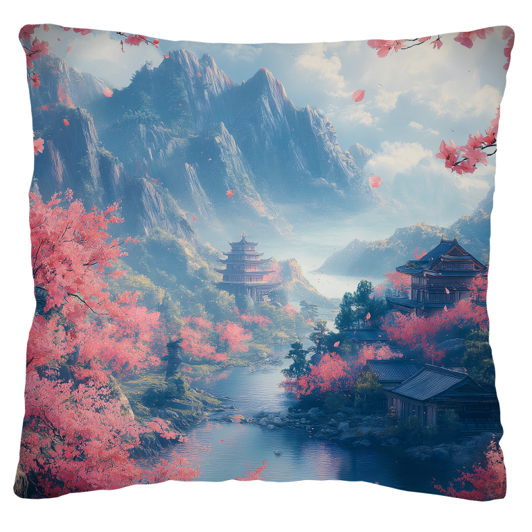 Peaceful Valley toont een betoverend Aziatisch landschap waarin een serene rivier zich slingert door een vallei vol roze kersenbloesems. De traditionele tempels en paviljoens nestelen zich harmonieus tussen de bloeiende bomen, terwijl majestueuze bergen zich verheffin in de mistige verte. De zachte pastelkleuren en de dromerige atmosfeer creëren een gevoel van pure tranquilliteit en spirituele rust. Dit poëtische kunstwerk brengt de tijdloze schoonheid van de Oosterse natuur en architectuur in een perfect evenwicht van sereniteit en elegantie.
