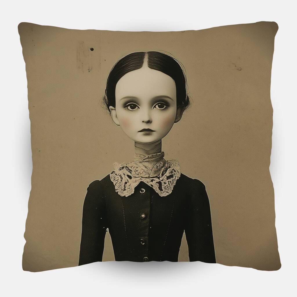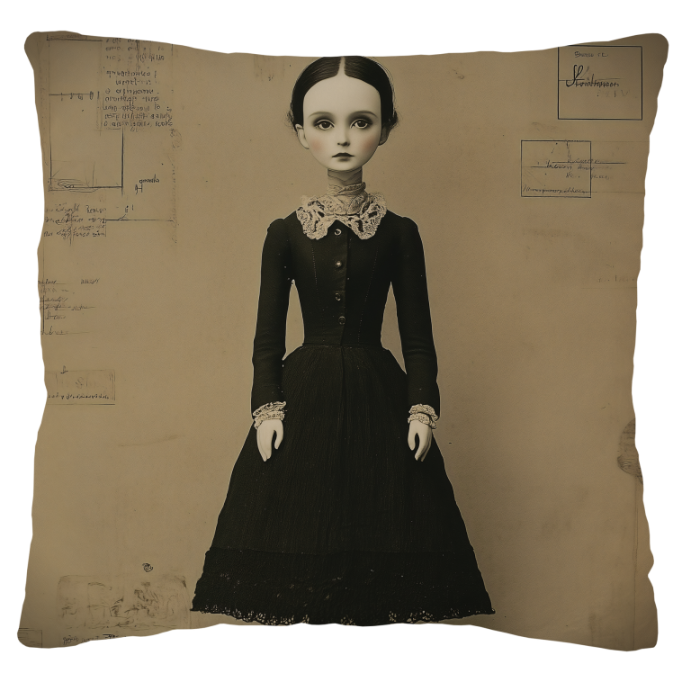 Black Dress Doll, toont een surrealistische pop met een vintage uitstraling. Ze draagt een zwart, Victoriaans geïnspireerd jurkje met kanten details en staat op een houten platform tegen een achtergrond vol schetsen en aantekeningen. De sepia-tinten en de bijna levensechte uitstraling van de pop geven het werk een mysterieuze en nostalgische sfeer. De minimalistische maar gedetailleerde compositie straalt een gevoel van melancholie en tijdloosheid uit, perfect passend bij een klassiek of gotisch geïnspireerd interieur.