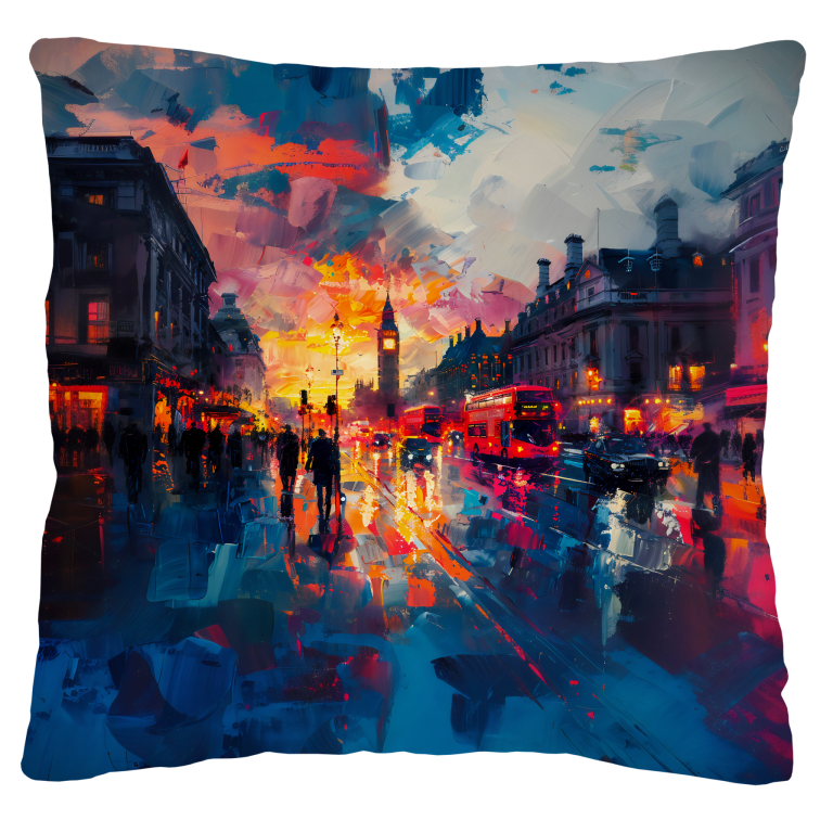 Mornin' London is een levendige, impressionistische weergave van de Londense ochtendspits, waarin een drukke straat tot leven komt met de iconische Big Ben prominent op de achtergrond, badend in een warme zonsopgang. De lucht is een dynamische mix van roze, oranje en blauwe tinten, wat het gevoel van een nieuwe dag perfect weergeeft, terwijl de natgeregende straten de felle lichten van rode dubbeldekkers, autolampen en de gloed van winkelverlichting reflecteren. Donkere silhouetten van voetgangers bewegen haastig door de straat, wat de gejaagde sfeer van de ochtend benadrukt. De grove maar expressieve penseelstreken geven de scène een energieke, bijna tastbare dynamiek, waardoor de bruisende, ontwakende sfeer van Londen krachtig wordt vastgelegd.