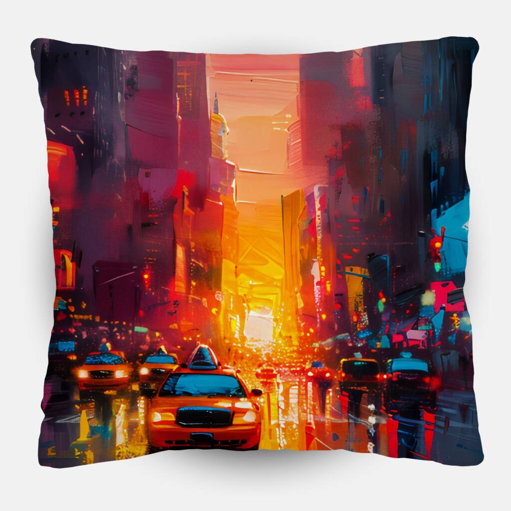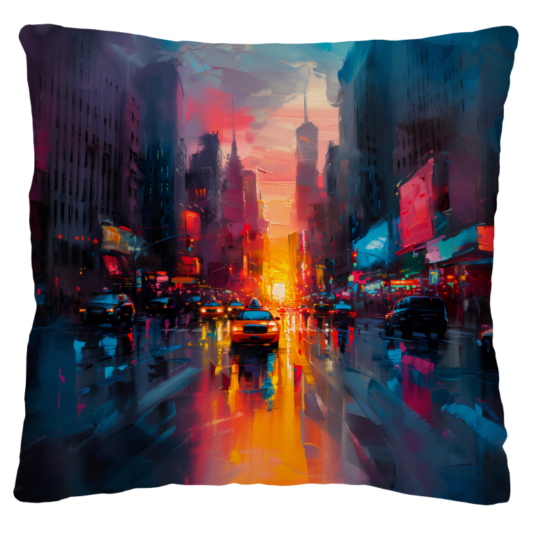Hello New York is een dynamische en kleurrijke impressie van een bruisende New Yorkse straat bij zonsopgang. De schildering vangt de energie van de stad die nooit slaapt, met de warme oranje en roze gloed van de opkomende zon die reflecteert op de natte wegen. Gele taxi's en auto's banen zich een weg door het drukke verkeer, terwijl neonreclames en verlichte billboards aan de zijkanten de stad tot leven laten komen. De wolkenkrabbers torenen hoog op, hun contouren vervagend in de mistige, blauw getinte lucht. De losse, expressieve penseelstreken versterken het gevoel van beweging en stadsdrukte, alsof de stad zelf ademhaalt en ontwaakt.
